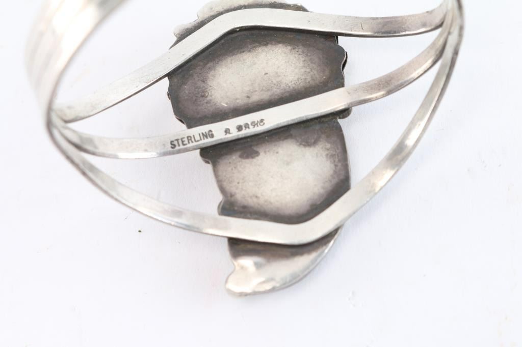 With turquoise, coral and bear claw set in sterling silver. Maker marked by noted silversmith R. Bahe. Purchased from Grizzly Taylor, renowned collector and owner of The Hideaway Grill in Cave Creek, Arizona. Measures 7" with cop. CANNOT BE SHIPPED TO CALIFORNIA OR NEW JERSEY.
