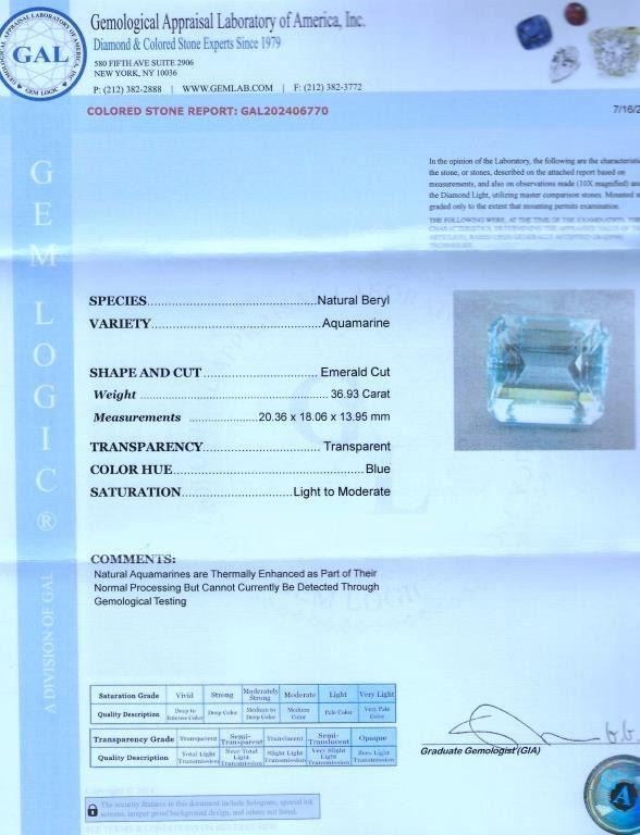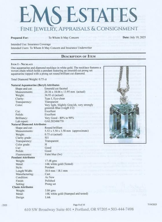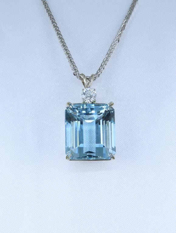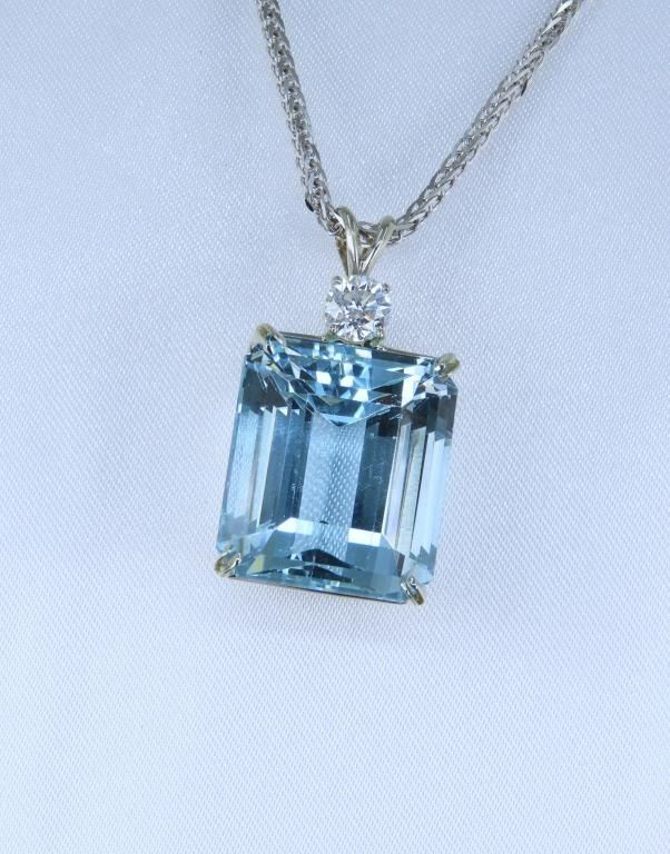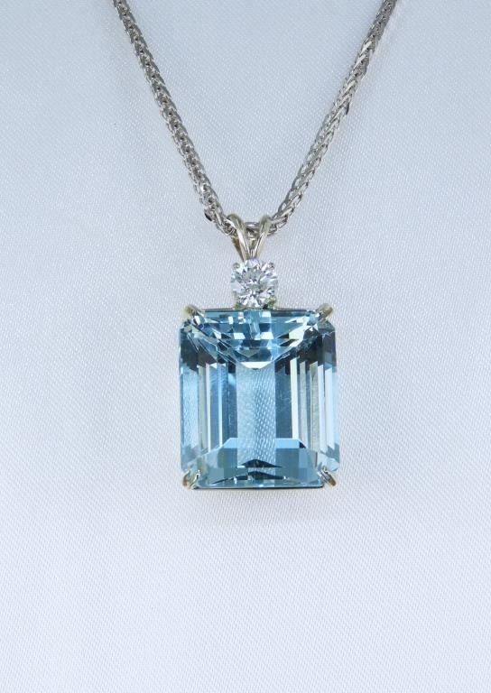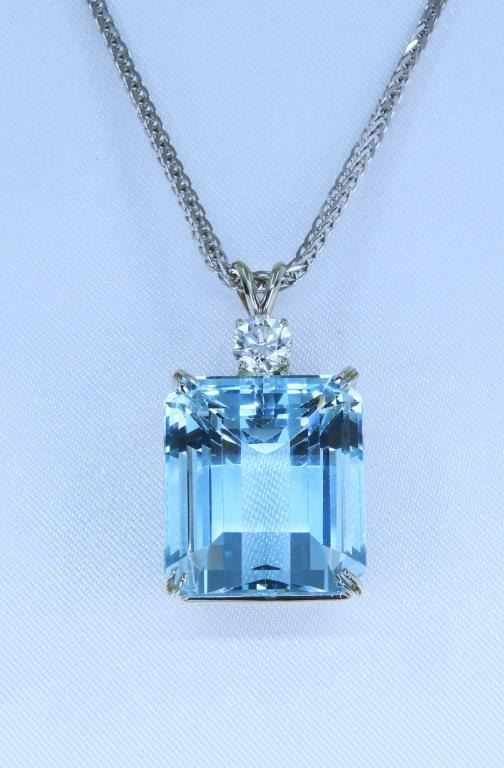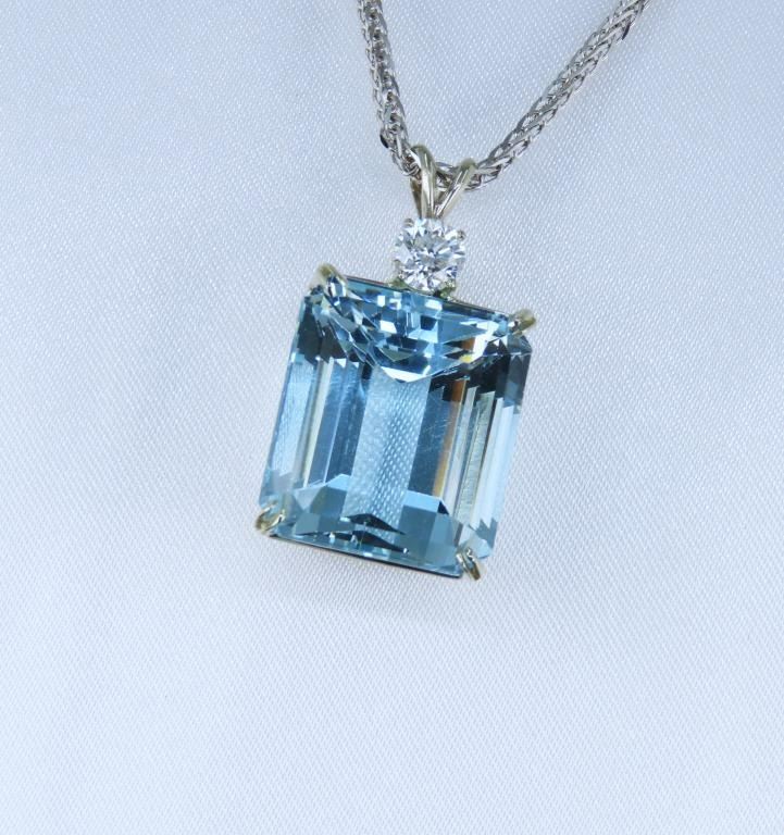 Gorgeous Large Certified Aquamarine and Diamond Pendant featuring a large 36.93 carat Emerald cut Natural Blue Aquamarine accented by a 0.75 carat round cut Diamond with G-H color and VS clarity set in a custom 14 karat white gold classic setting. Full Retail Appraisal - $22,500.00.