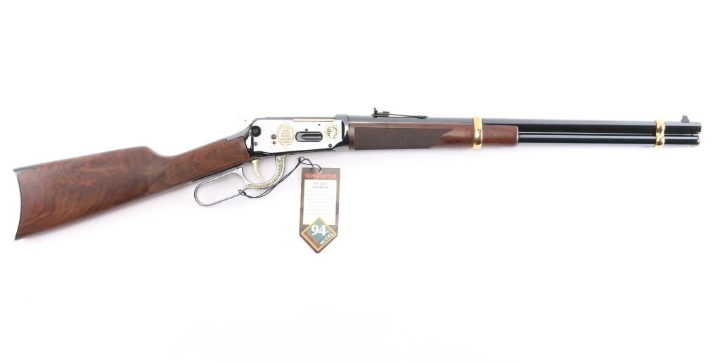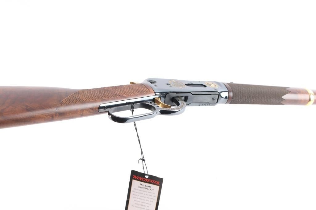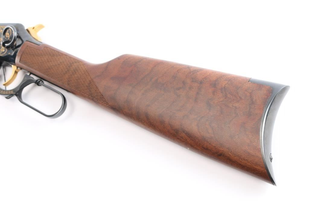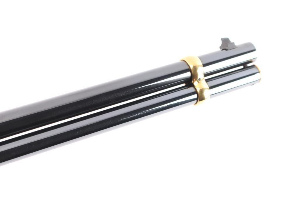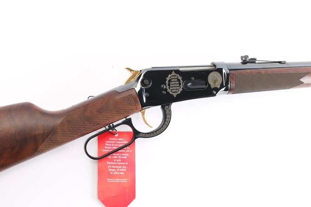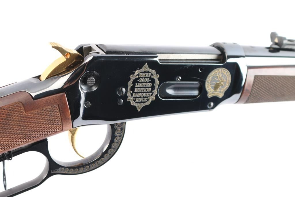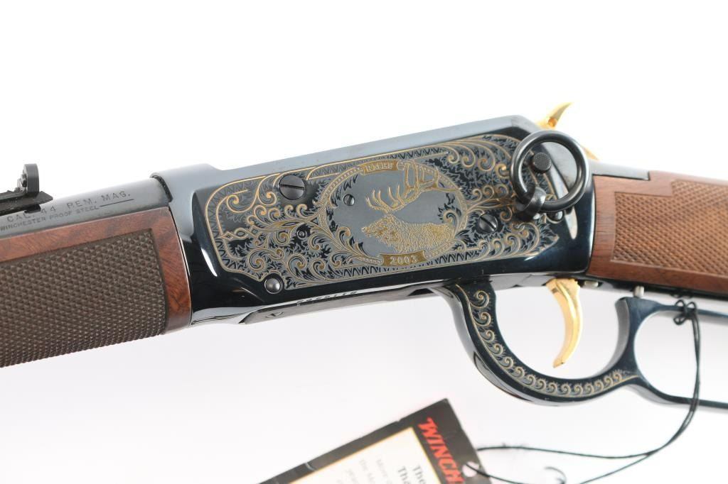 Winchester limited edition 'Rocky Mountain Elk Foundation' lever action rifle chambered in .44 Mag. Made in 2003, with only 500 manufactured in total. It features blued finish, checkered wood forend & straight gripped stock, curved smooth metal buttplate, 20" barrel with blade front sight, adjustable rear sight, tube magazine under barrel, manual cross bolt safety, smooth trigger and serrated hammer spur. It also features gold colored hammer, trigger, barrel bands, and magazine plug. It is also engraved with gold colored highlights on both sides of the receiver and lever. Retains 98% blue with a few extremely light scratches on the right side of receiver. Wood is very beautiful and in excellent condition.