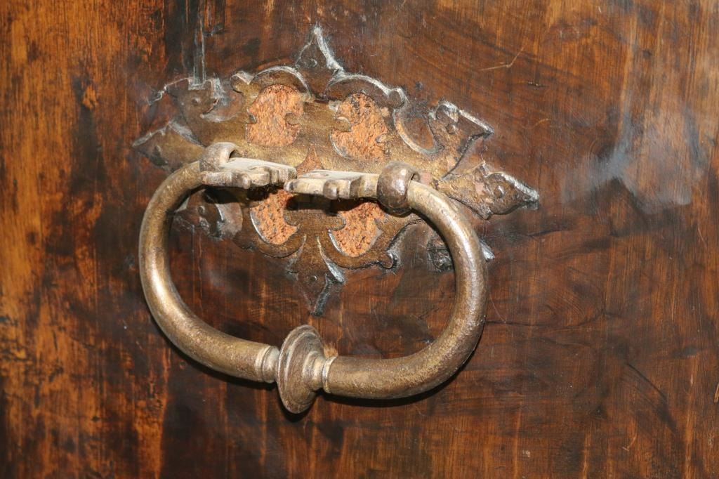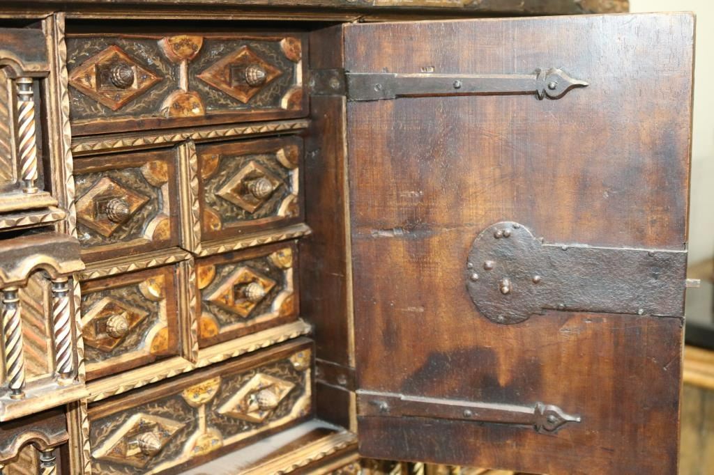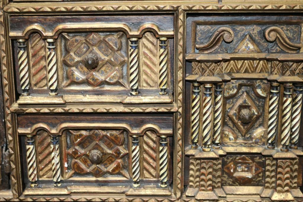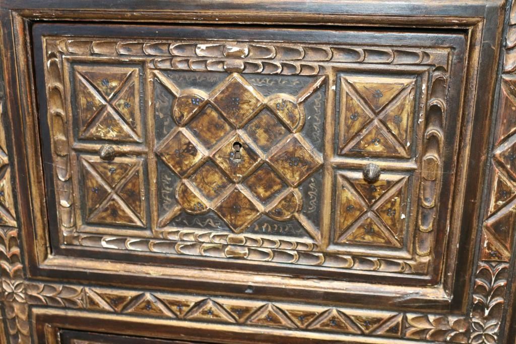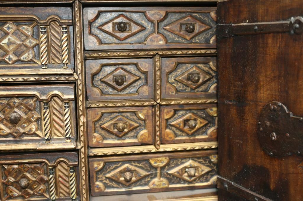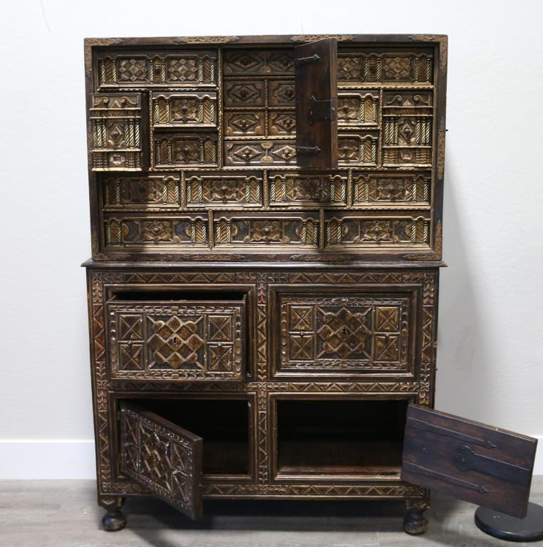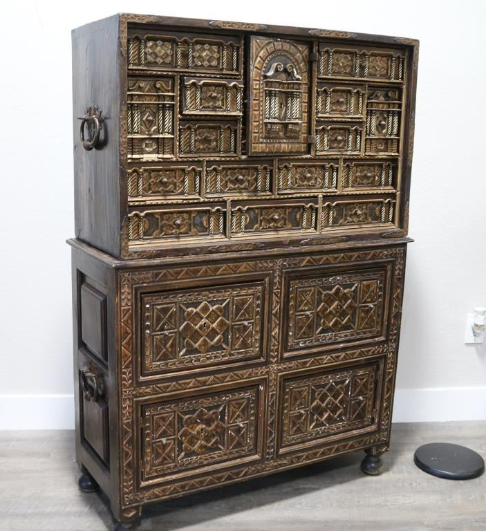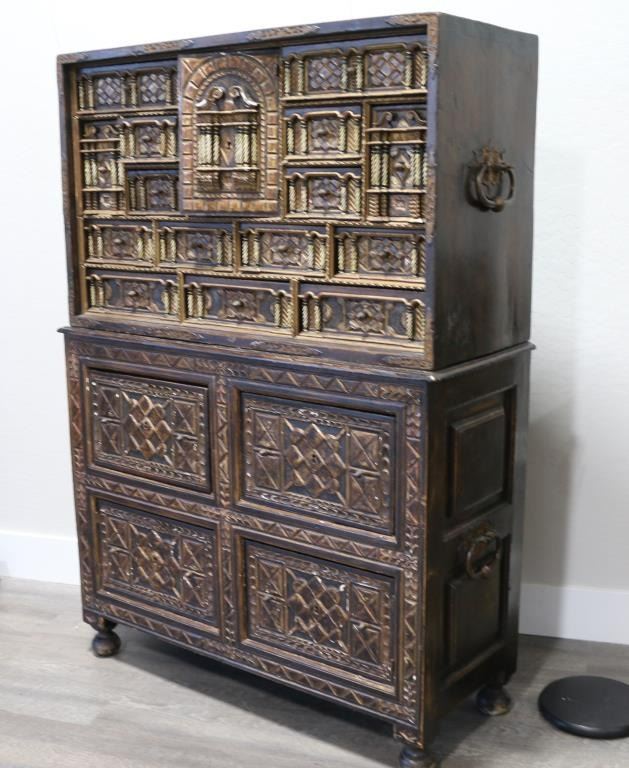 Or documents chests. Two outstanding pieces with forged iron carrying rings. Elaborately carved with gold leaf decoration to front. The top chest measures 24 1/2" by 39". The bottom chest measures 32" by 40". Top and bottom are well matched with identical pulls and probably intended for use together although they do not have exact matching decoration. Conditions are unrestored with minor imperfections and slight damage. Provenance: Mohico Guyo Collection, Lima, Peru, related to colonial governors and early colonial founding family, to William "Bill" Scollard, to a major Southern California Collector's Estate. Varguenos were important to store important land grants, titles, deeds and documents that proved your identity in the world. Compare in Santa Fe, NM galleries at $15,000 to 50,000 plus and we feel none online are as good. **Buyer must arrange shipping.**
