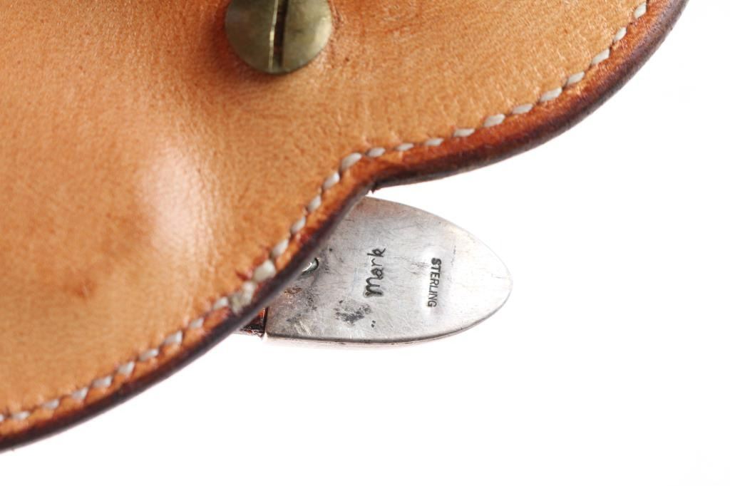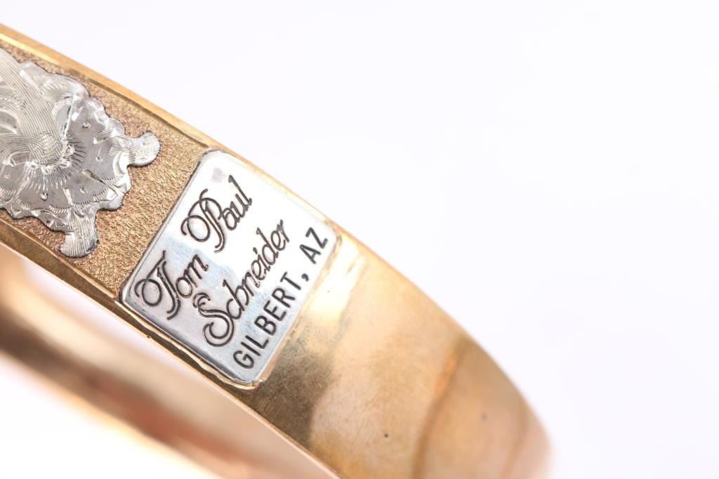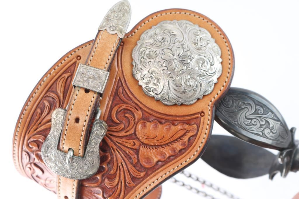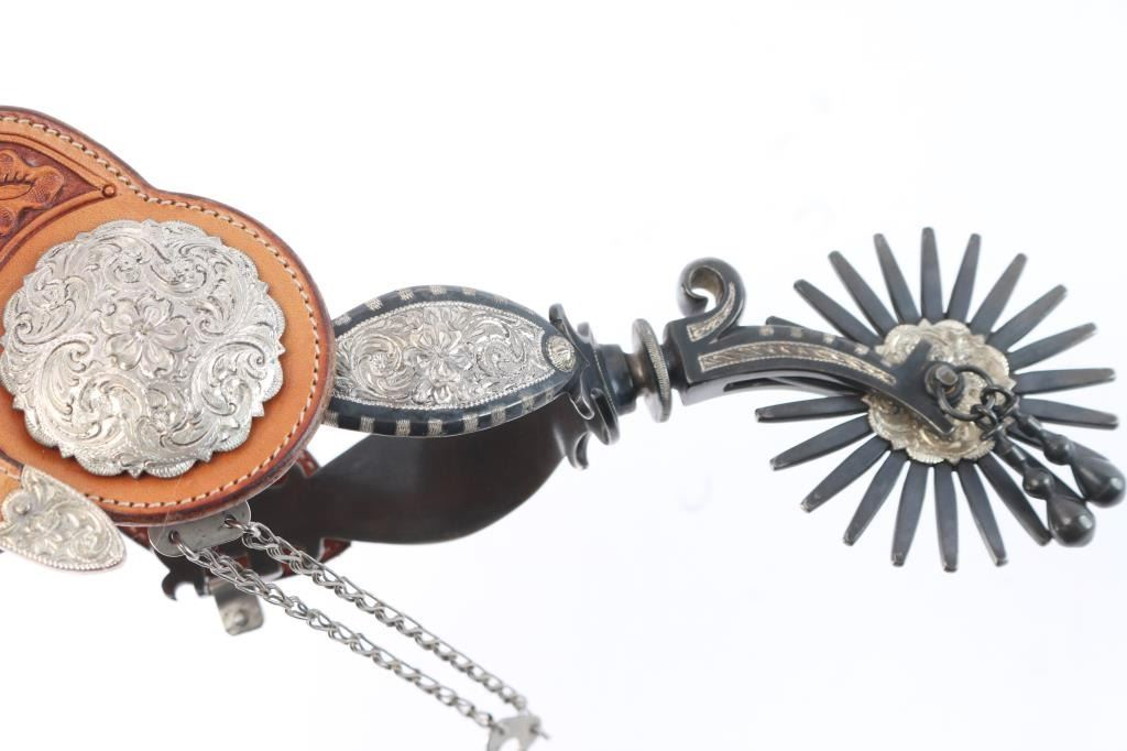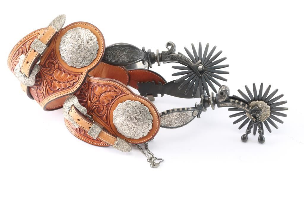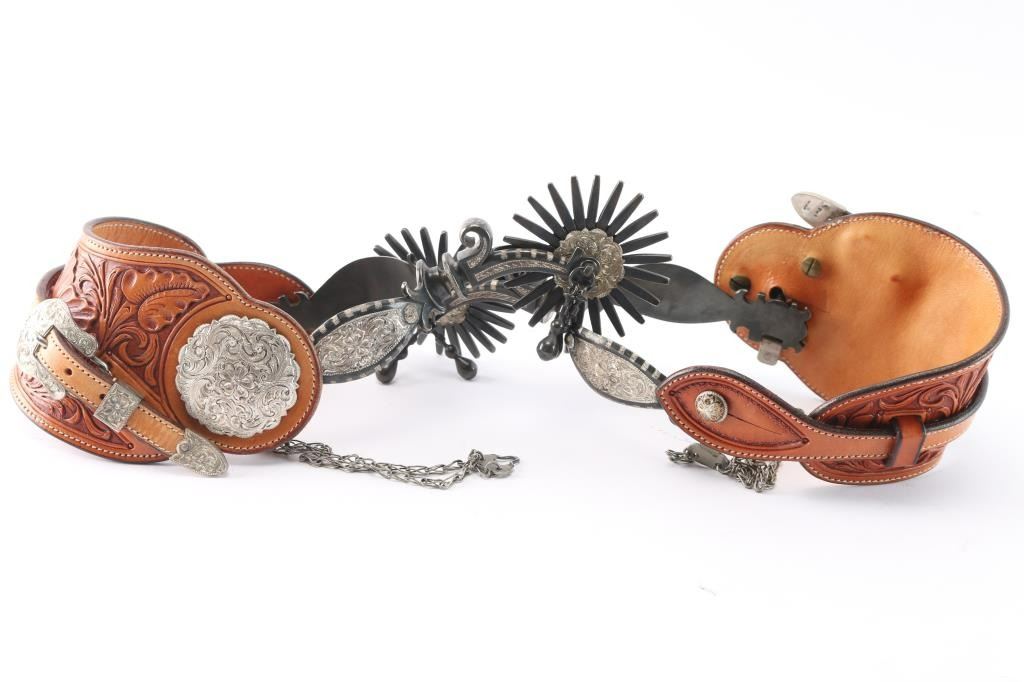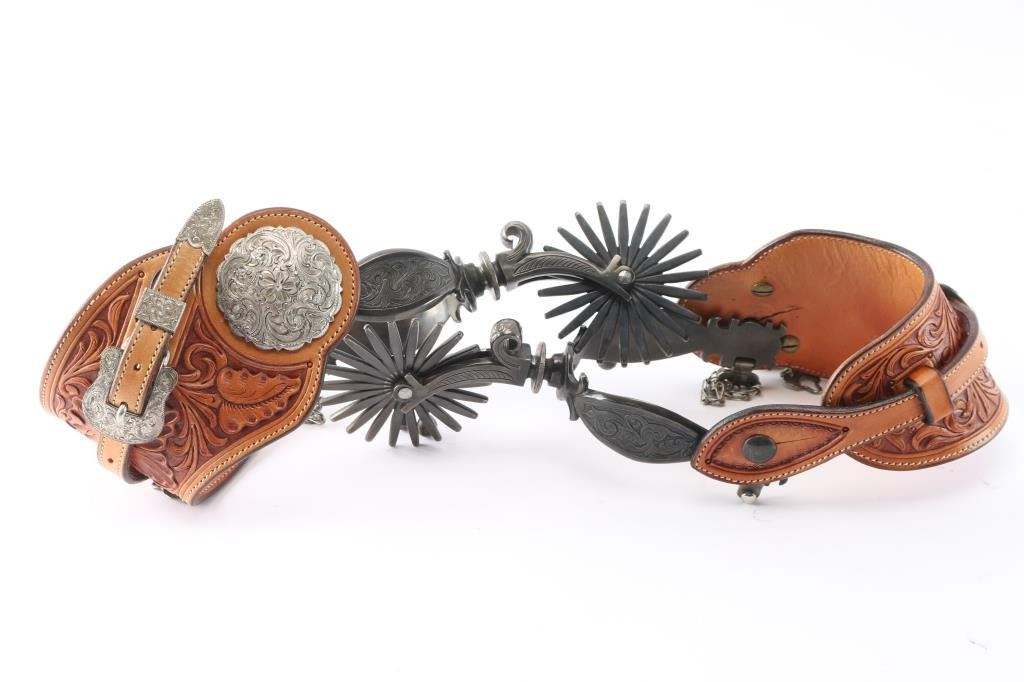 Fancy spurs by Mark Dahl, with extra large silver engraved buttons and heel guards, tooled leather straps. Maker marked on spurs and straps. Dahl carefully hand-engraves the silver in his pieces so that each cut reflects light and maintains its beauty for years. His inlays are sterling silver. Dahl is a charter member of the Traditional Cowboy Arts Association. Some of his finer pieces can be seen in the Association's annual shows. The brass stirrups are overlaid with engraved silver as well, and have a small plaque inscribed Tom Paul Schneider, Gilbert, AZ. The spurs and stirrups come with a custom made oak display case lined in red crushed velvet with a glass box cover. The display measures 35 1/4" tall by 20" wide by 15" deep. LOCAL PICKUP ONLY, or can be shipped without display.