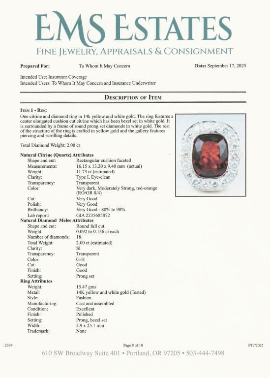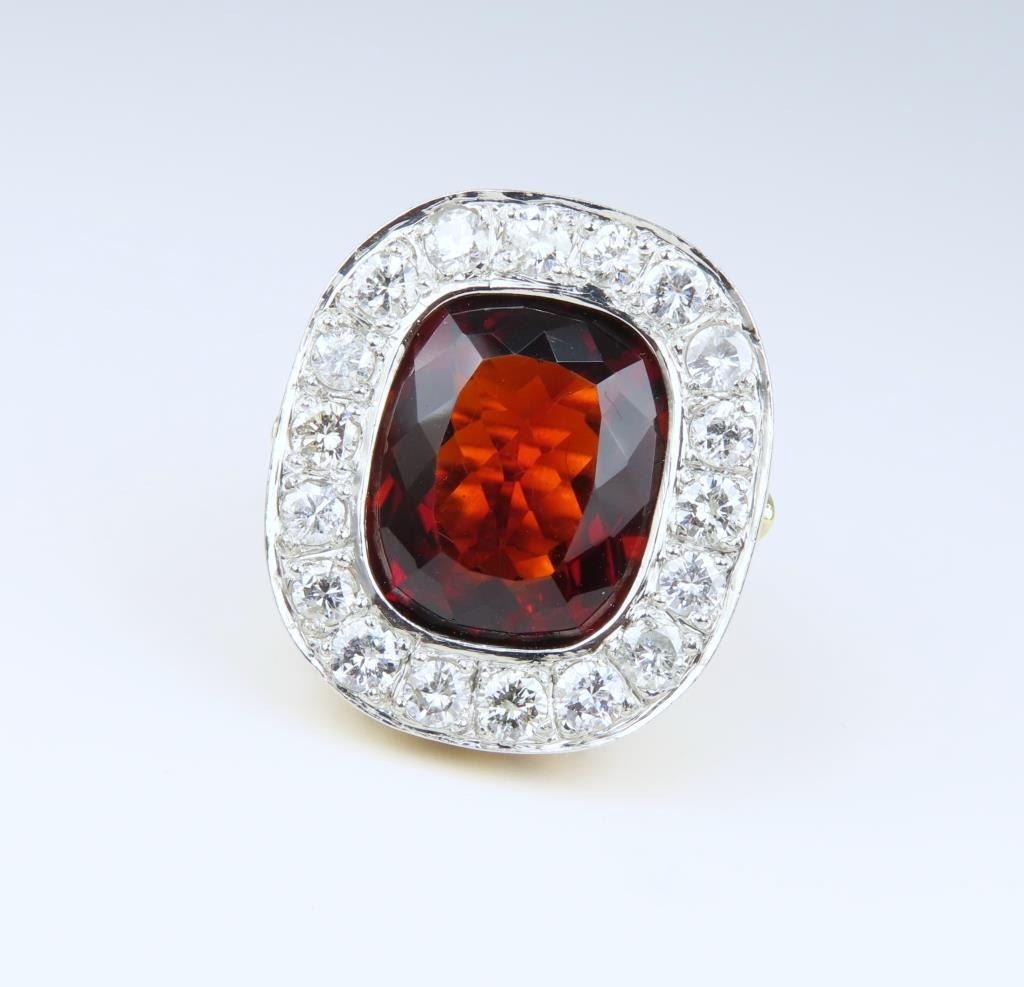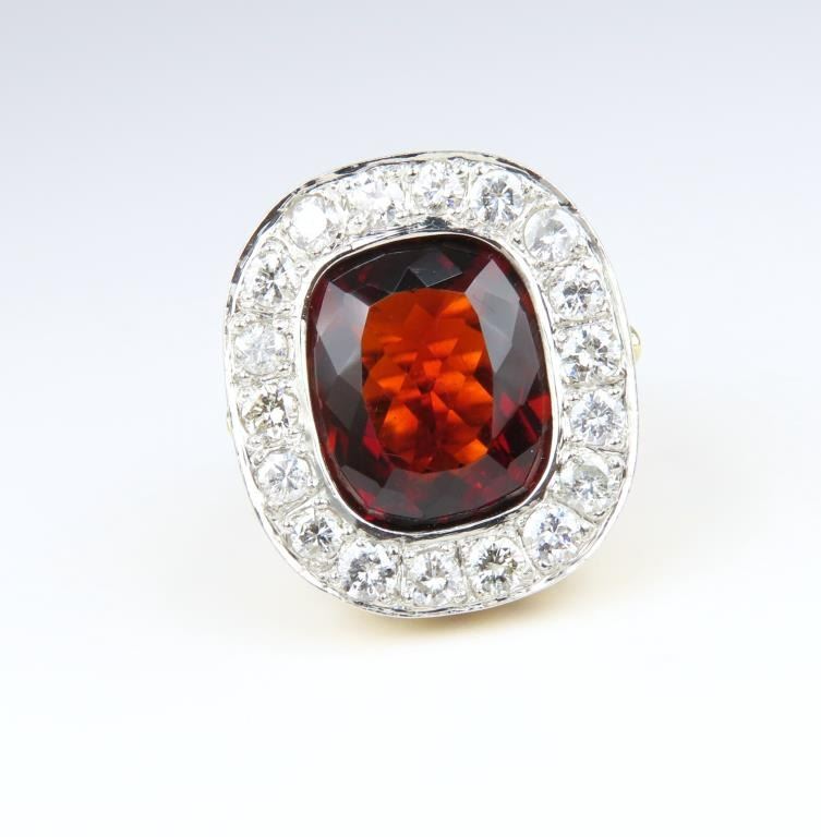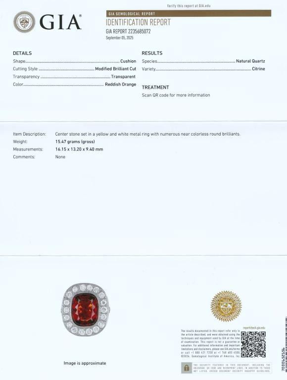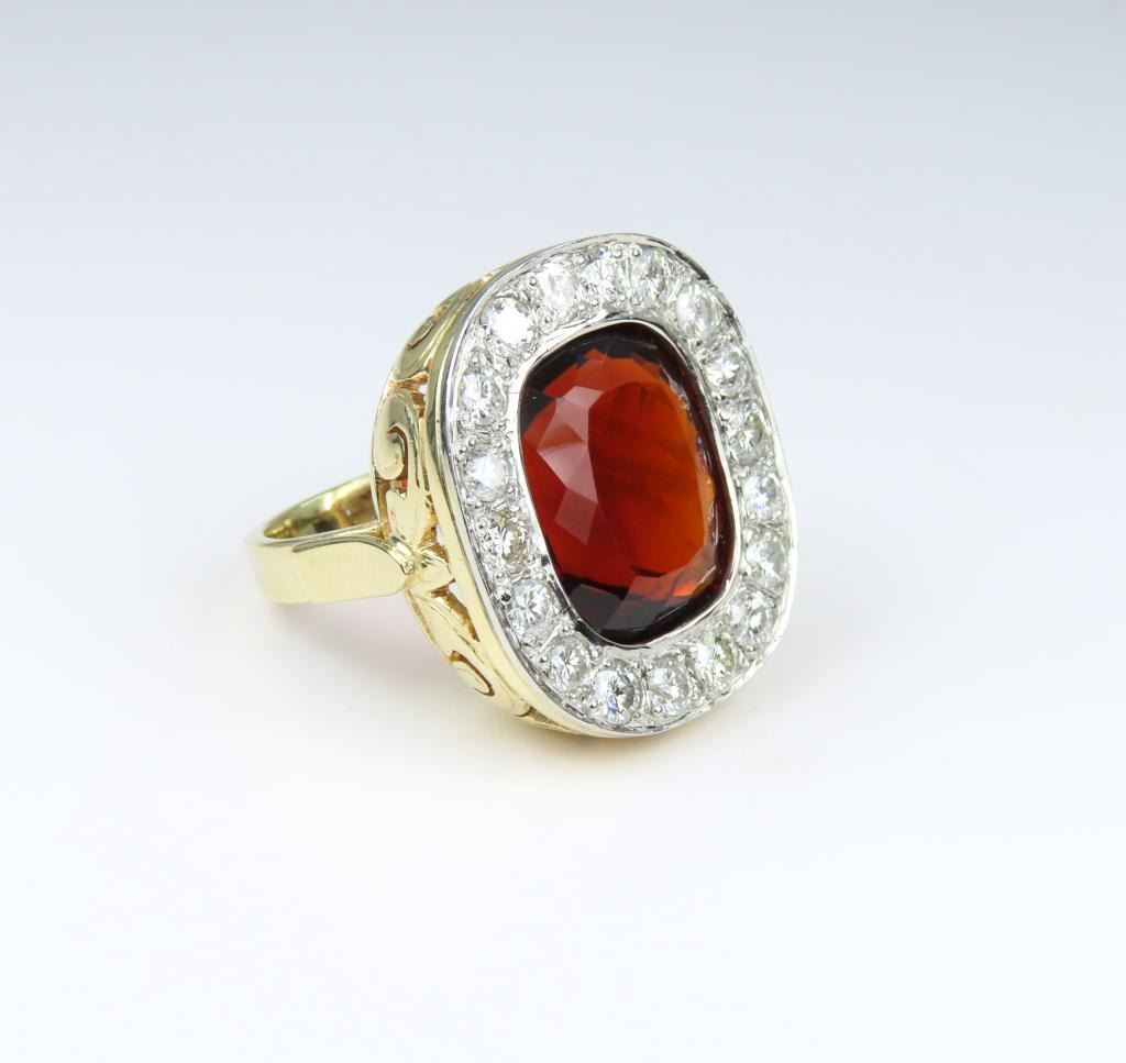 Sensational Extra Fine G.I.A. Certified Madeira Citrine and Diamond Ring featuring a rare, intense Red Orange Citrine weighing approx. 12.00 carats framed with 18 round cut Diamonds weighing approx. 2.00 carats with G-H colors and SI clarity set in a heavy, vintage style 14 karat yellow setting weighing approx. 16.00 grams. Ring size 6 ¼ . Full Retail Appraisal- $16,000.00.