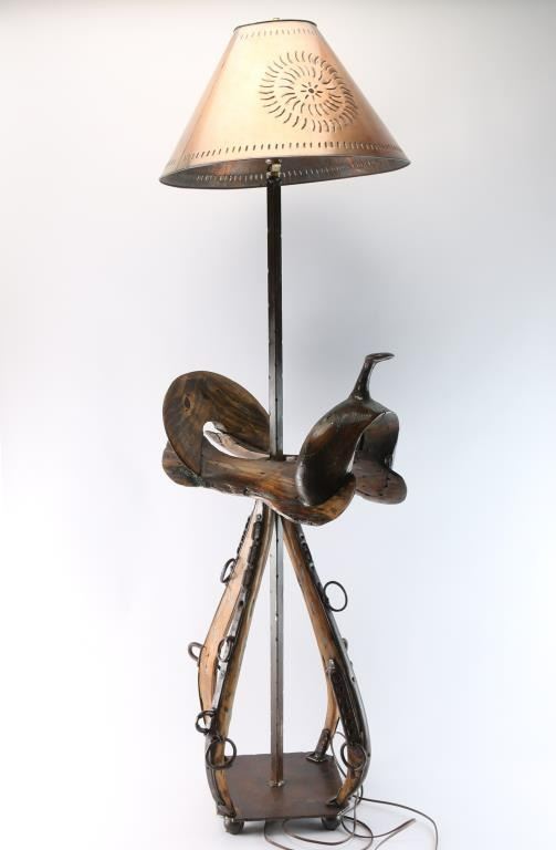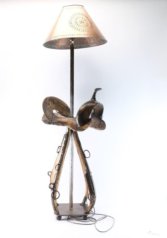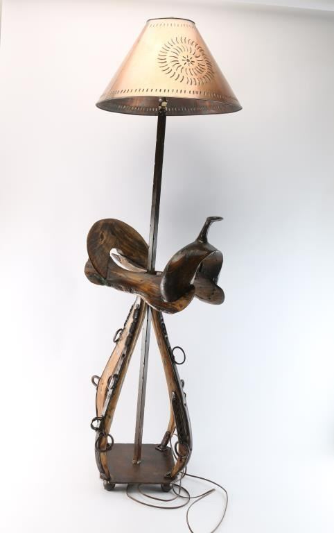 With hand-made copper shade, bullets for switch and threaded nut on top of shade. Carved wood saddle with inlaid turquoise design for lamp stand, with metal base. **Buyer must arrange shipping.**