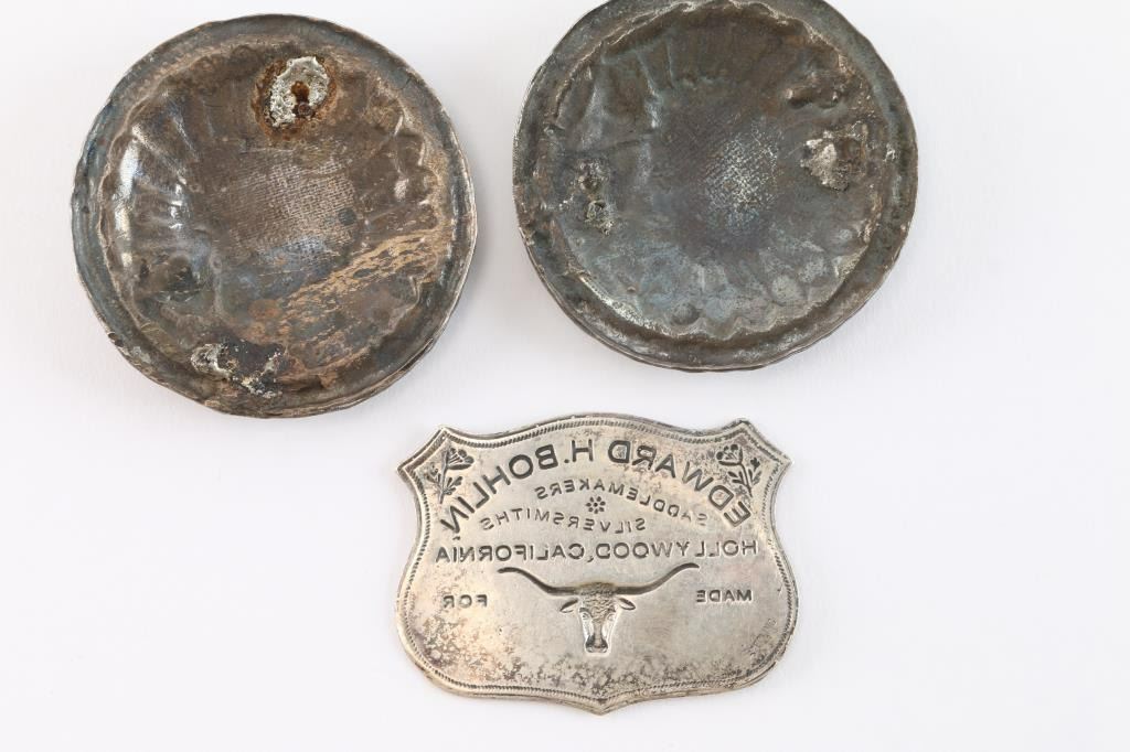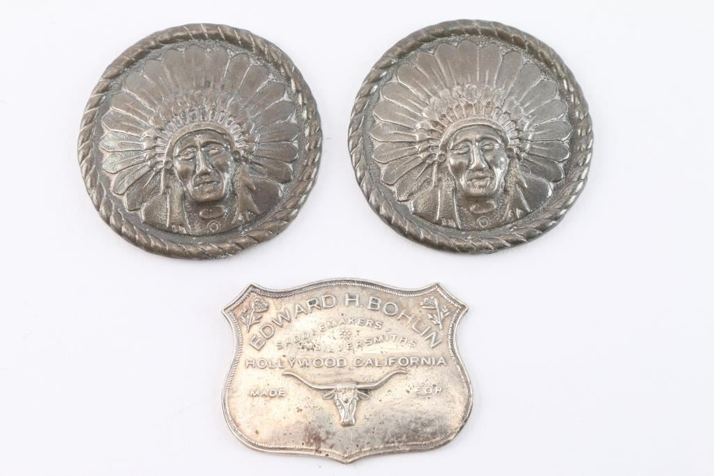 Plaque is inscribed Edward H. Bohlin, Saddlemakers, Silversmiths, Hollywood California, Made For and a steerhead. Measures 2" x 1 1/4". Indian head conchos unmarked.