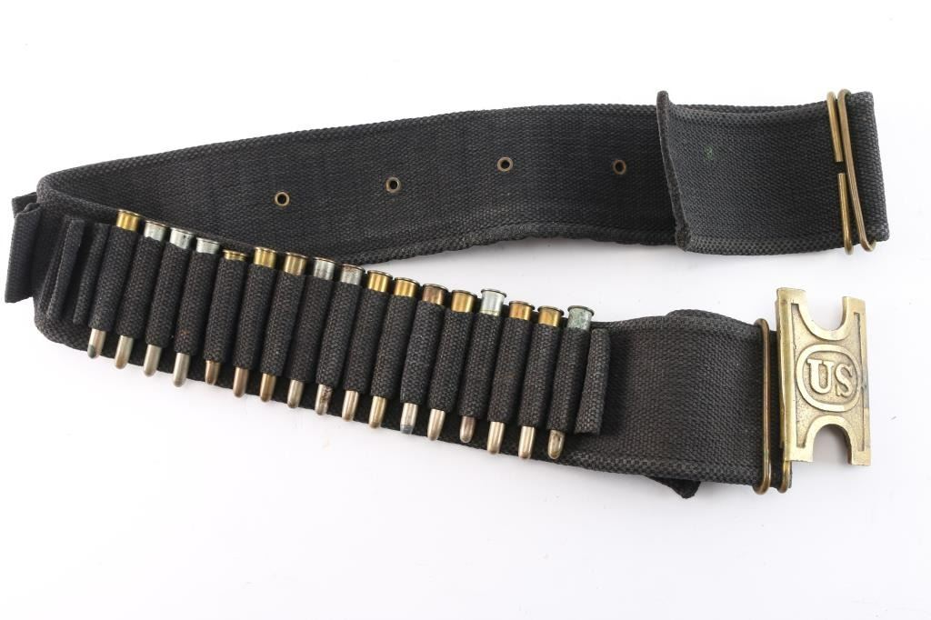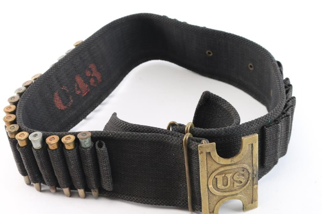 With cast brass U.S. buckle and blue canvas, (17 U.S. Cartridges includes). Good to V.G> condition. Spanish American War to Phillipine Insurrection.