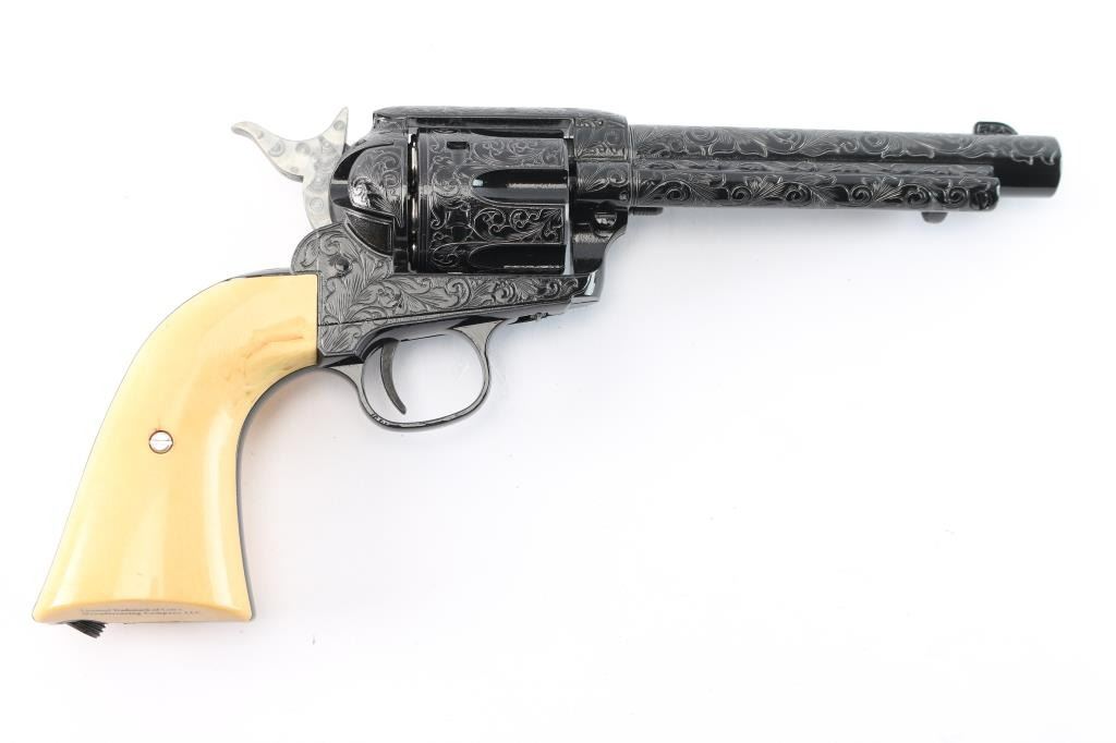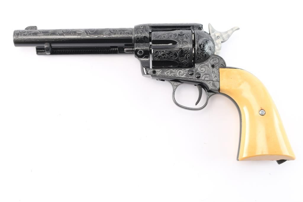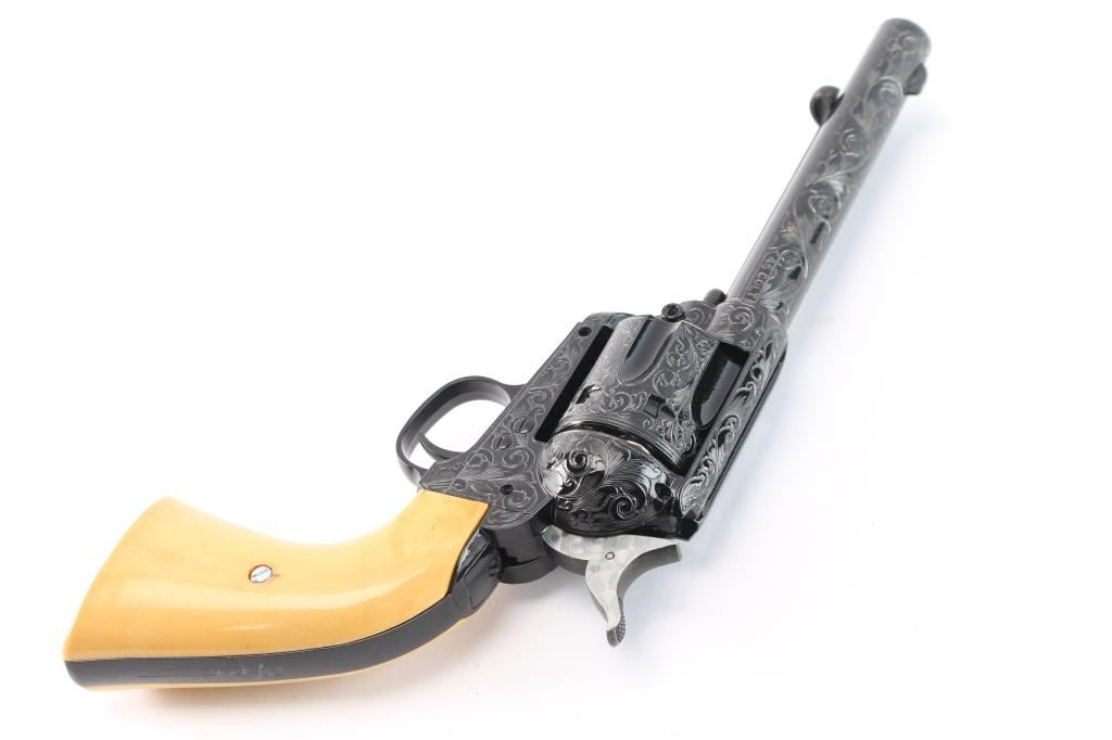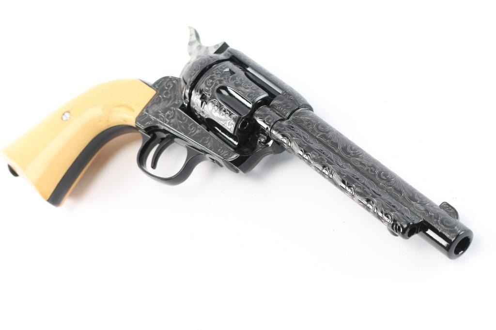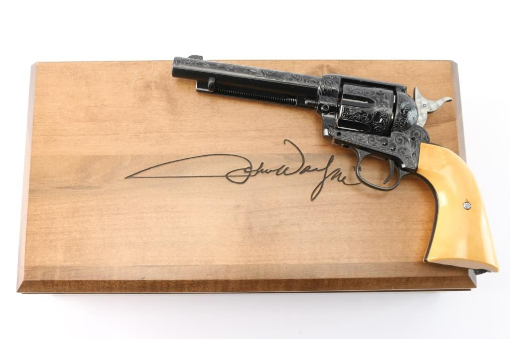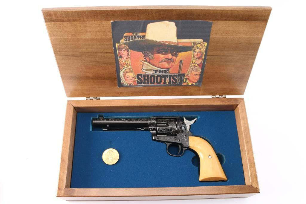 Custom engraved "Shootist", 1 of 100. Beautifully made engraved by Conrad Anderson with 100% coverage with faux ivory grips like new in the box. The shootist is 5 1/2:" model with rifled barrel chambered for lead pellets comes in a hardwood presentation box bearing John Waynes signature on the lid. This was done as a replica of the 40th anniversary of the film.