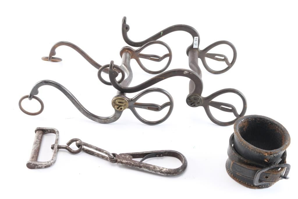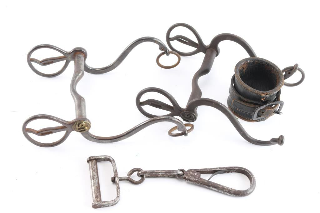 2 horse bits with brass rosettes and a carbine hook for sling along with leather socket for carbine. All good to V.G. condition. The estate collection of John Kopec.
