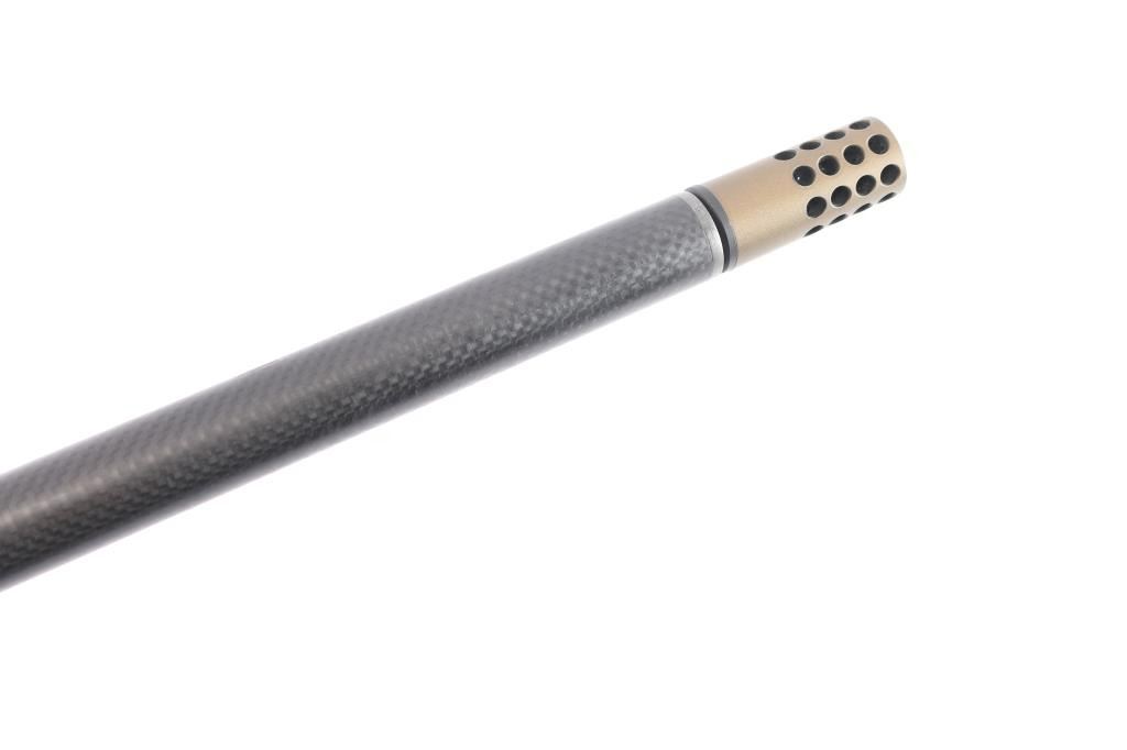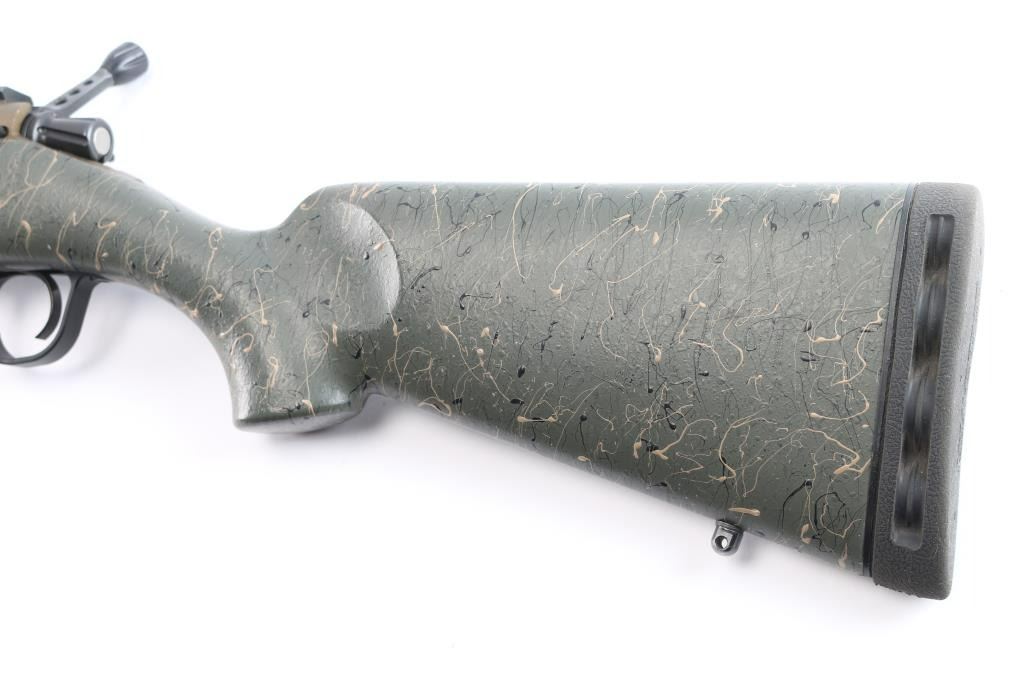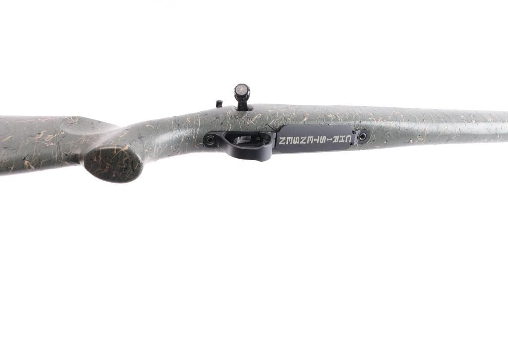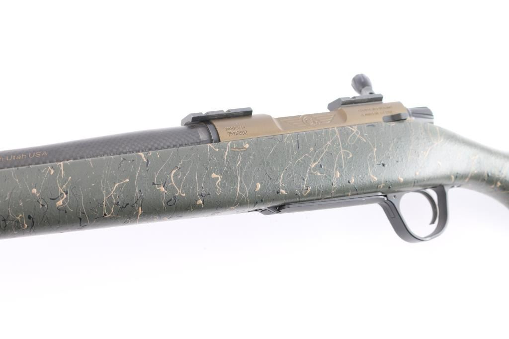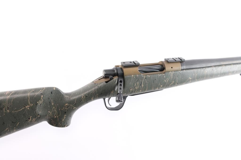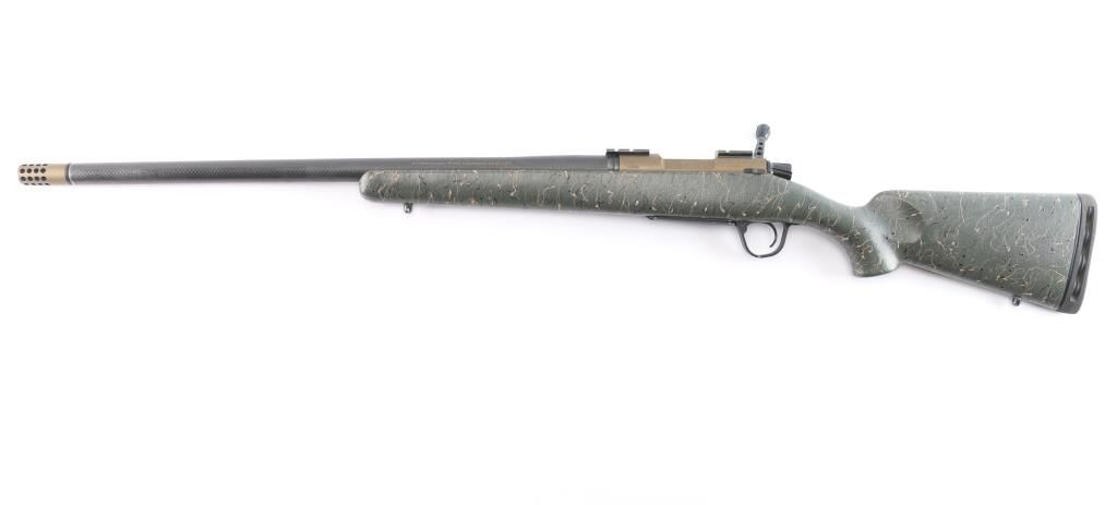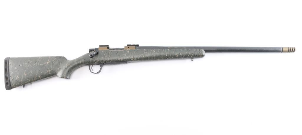 SN: #7m08692. Premium modern lightweight bolt action rifle based on upgrades & improvements to the Remington 700 design. Features matte bronze coating on metal, 23" free-float 416R stainless steel barrel with a 2 1/8" stainless steel radial muzzle brake and Aerograde carbon fiber wrap, 1:8 twist, 5/8 X 24 thread pitch, no provisions for sights, drilled & tapped receiver, spiral fluted bolt body, extended skeleton bolt handle with oversized knob, Triggertech serrated curved trigger, manual safety, hinged floorplate. Carbon fiber composite stock is green color with black & tan "web" highlights, pillar and "spot" bedding, sling studs, Limbsaver soft rubber recoil pad, deep "closed" grip with dual sided palm swell, beavertail forend. Bore is very good/slightly dirty. Retains approx.98% finish slight friction wear on bolt and very little edge loss on muzzle. Stock is excellent. Includes mounted two piece Picatinny rails. Condition is NRA Excellent. *** Modern Firearm ***.
