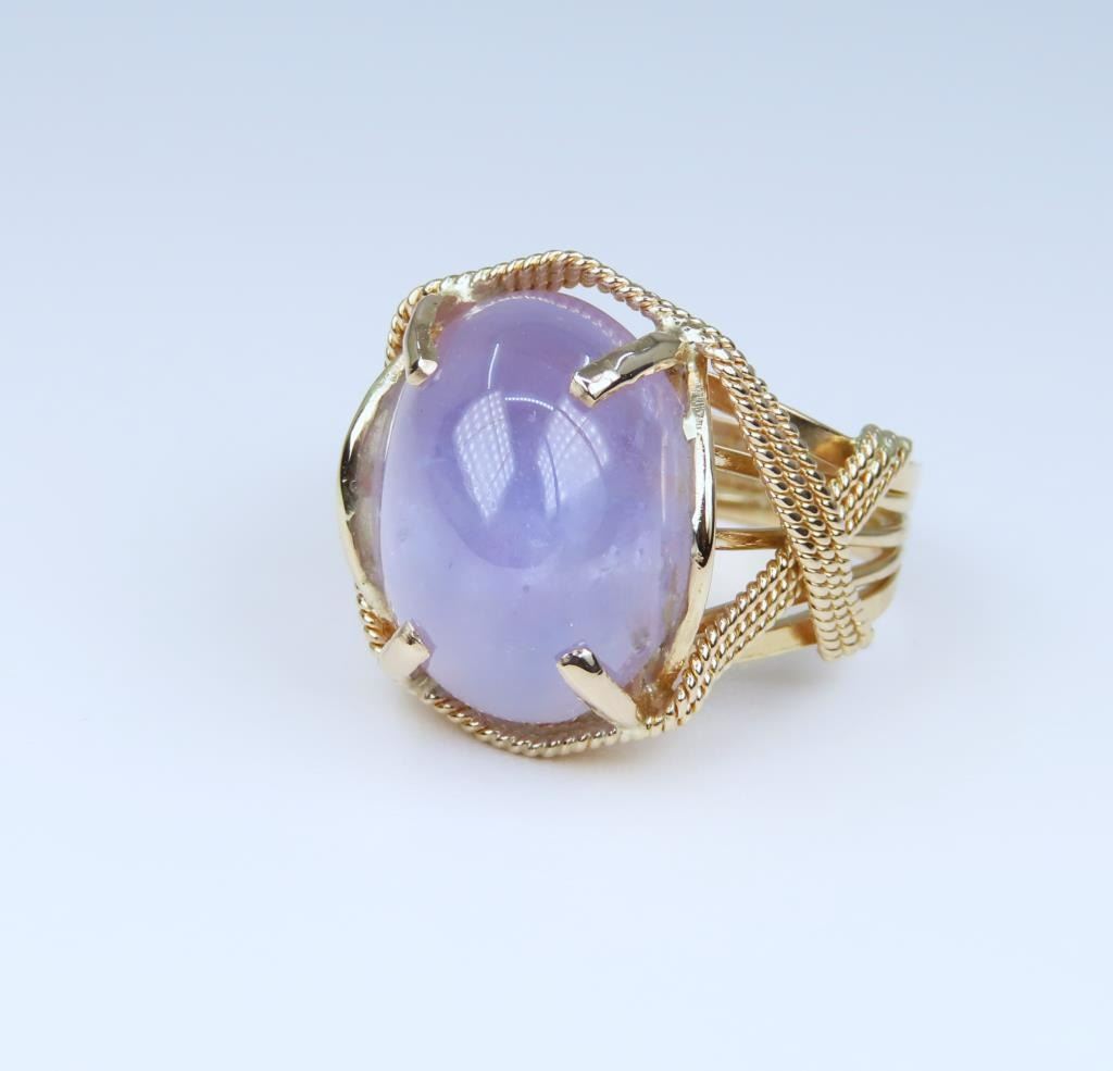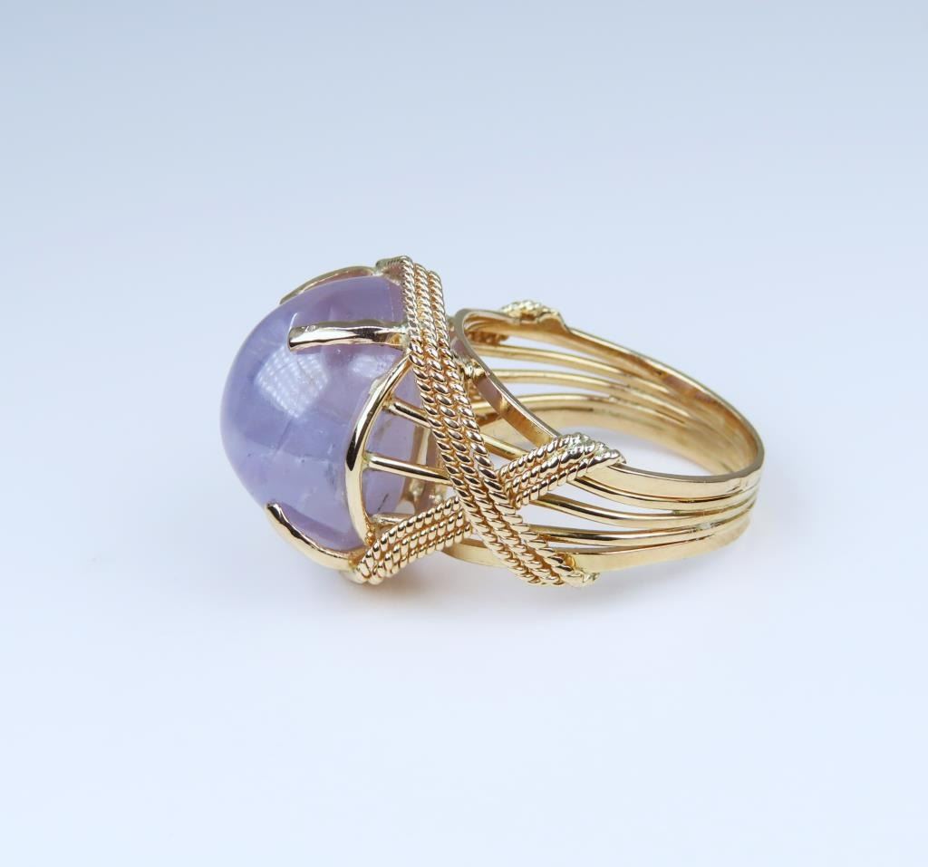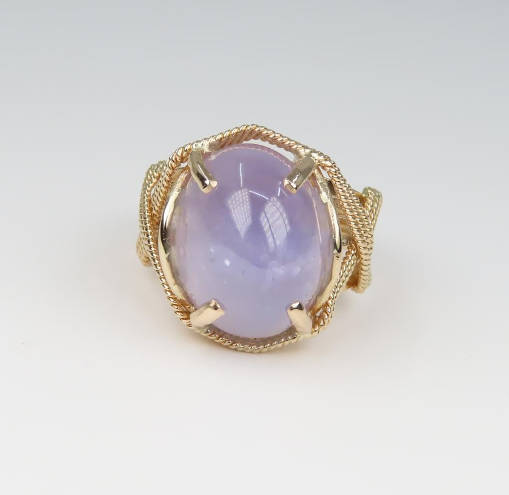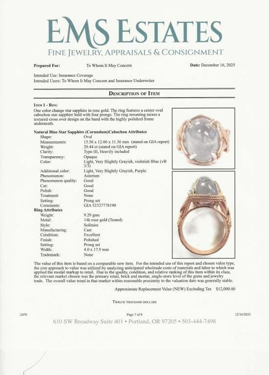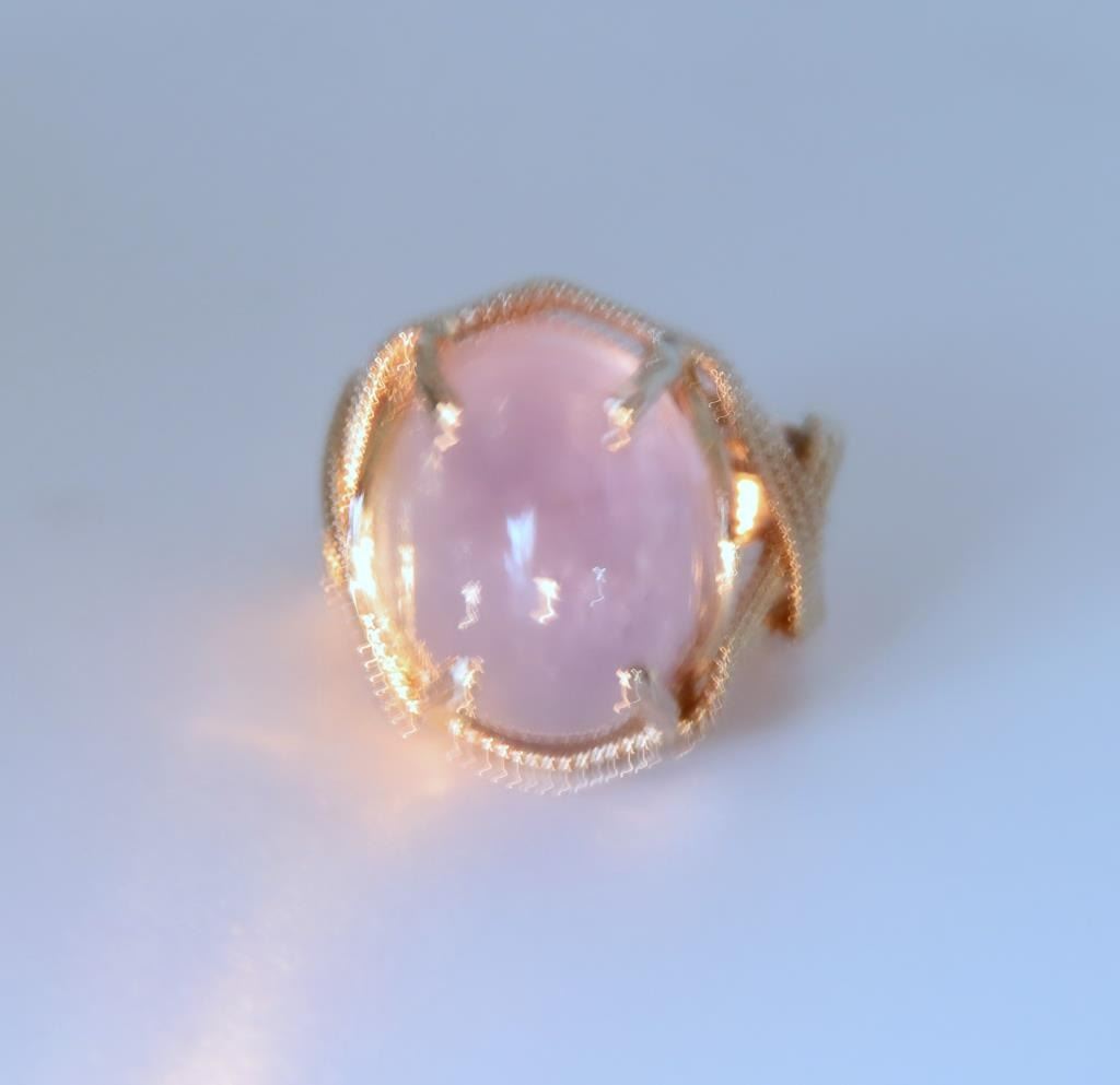 Magnificent 20.44 carat Color Change Blue Star Sapphire Ring featuring a cabochon cut G.I.A. Certified Natural, with No treatment, color change from light Violet/Blue to light Purple, displaying Asterism (Star). Sapphire set in hand crafted 14 karat Rose gold woven design setting. Ring size 7. Full Retail Appraisal - $12,000.00.