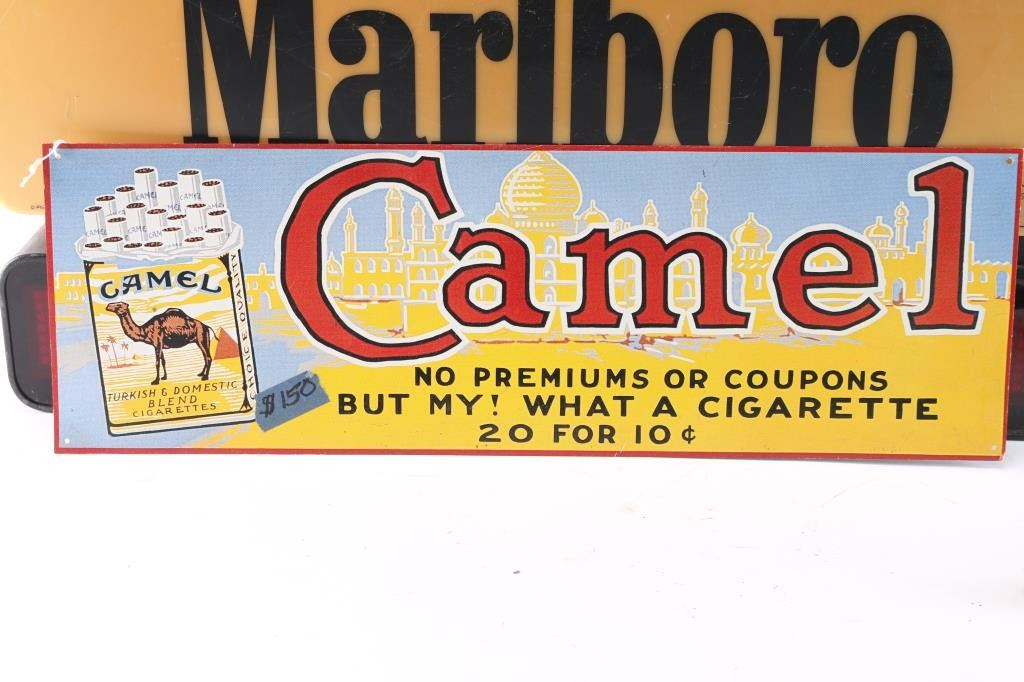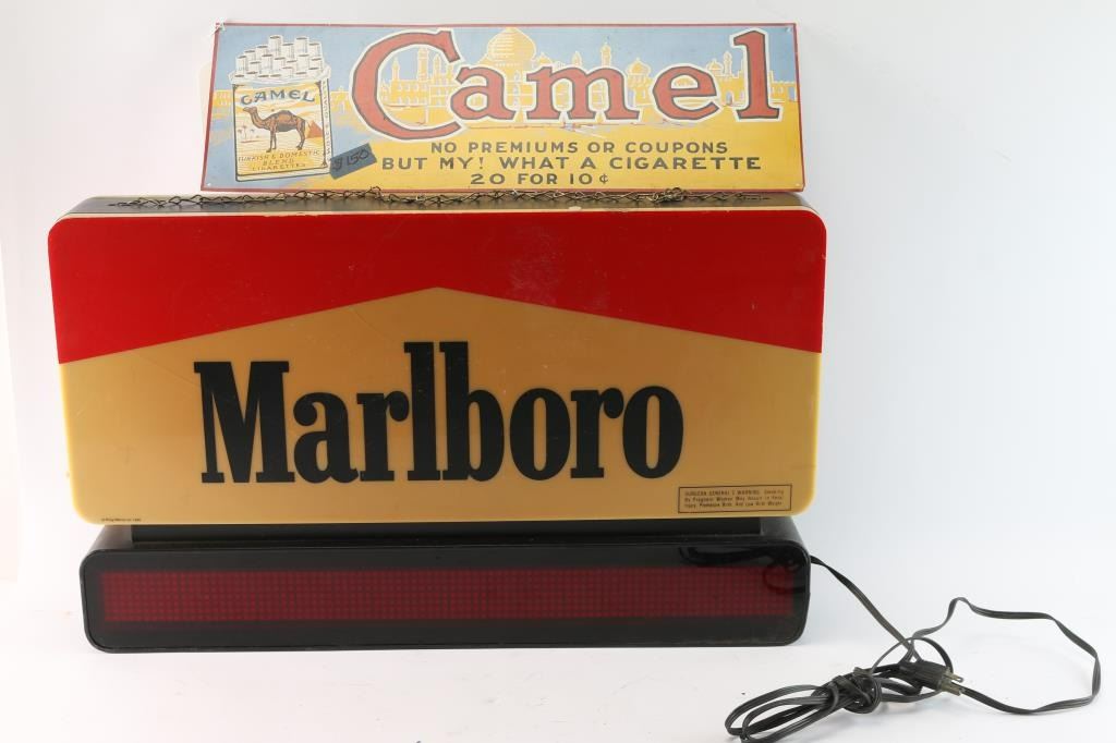 Includes: (1) Marlboro light up sign with scrolling LED. Some cracks and scratches to both panels. (28.5" x 17.5"H). Marlboro sign possibly needs new bulbs or ballast. LED sign works and can be programmed. (1) metal Camel cigarette sign (23.5"W x 7.7"H).