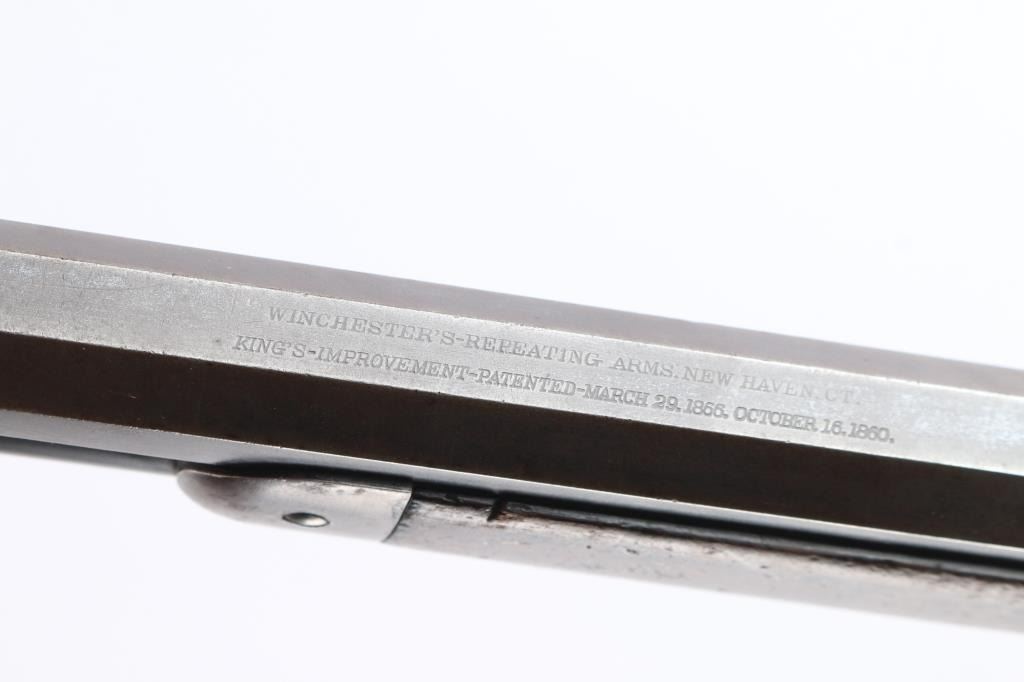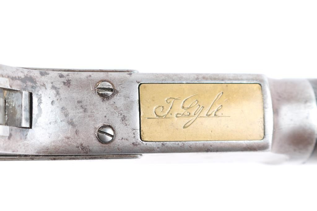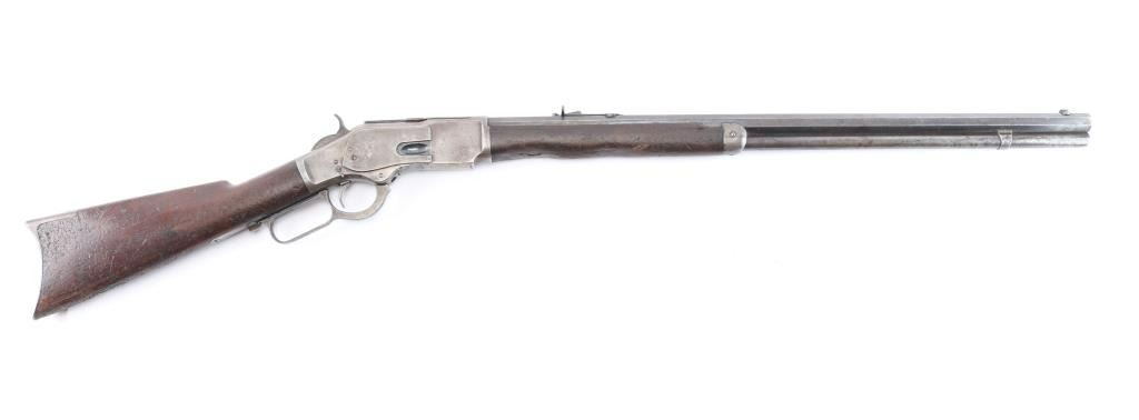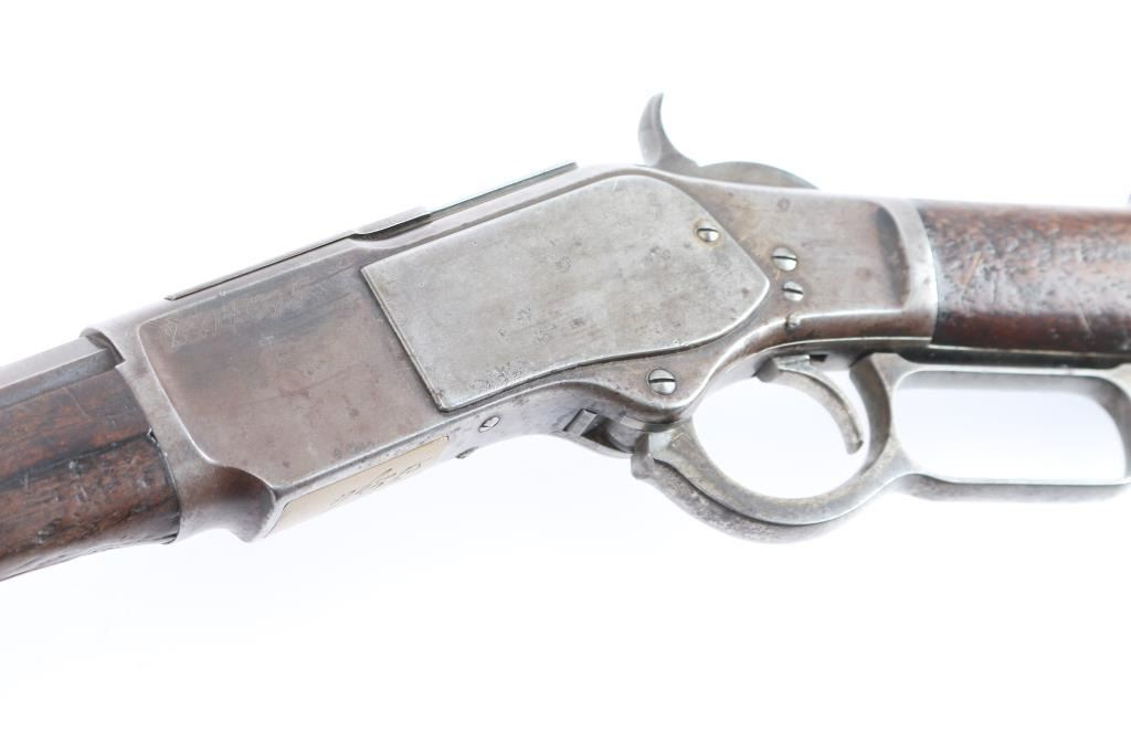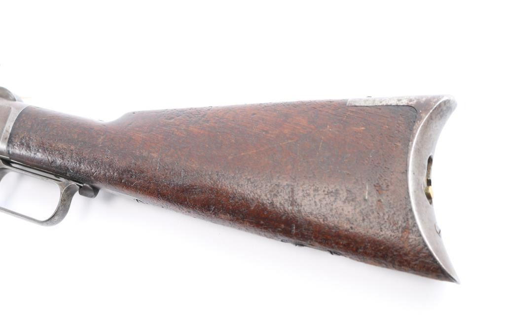 2nd Model c.1878 with lifter inscribed "J Lyle". Believed to be the property of J. C. Lyle, member of Butch Cassidy's gang who was arrested for the Union Pacific train robbery near Wilcox, Wyoming, June 2, 1899. Lyle was a member of the "Wild Bunch", a former Rough Rider and elusive train robber. He was also in the "Hole in the Wall" gang which was active at the turn of the century. Lyle was in Santa Fe, New Mexico, in 1898 when he enlisted in the Rough Riders. He was at San Juan Hill with Roosevelt and gave his home as Georgetown, Colorado upon enlisting. In 1899 he turned to crime as a member of Butch Cassidy's gang. Lyle served his time and lived quietly until his death in 1962 in Colorado. Papers state the rifle was bought from undisclosed family members by a collector. PHYSICAL DESCRIPTION: Fair to good overall condition, showing frontier wear, carry and use as well as exposure to the elements. The metal surfaces are a patina finish with faint traces of finish mixed in where protected. 26" octagon barrel, full mag, rifle butt with thumbprint dust cover (2nd model), No. 37899. Note: 26" are scarce in 2nd model. Good markings and fairly crisp edges. A number 2814025 is electric pencil engraved by the left top of frame (museum collection number?) The wood shows great "pommel wear" on the forend from being carried many years across the saddle. The butt stock is well worn with many imperfections from carry and use. The sling swivels have been removed and a piece of leather inlet into back swivel area. Action good and bore fairly shiny. From a major western history collection.