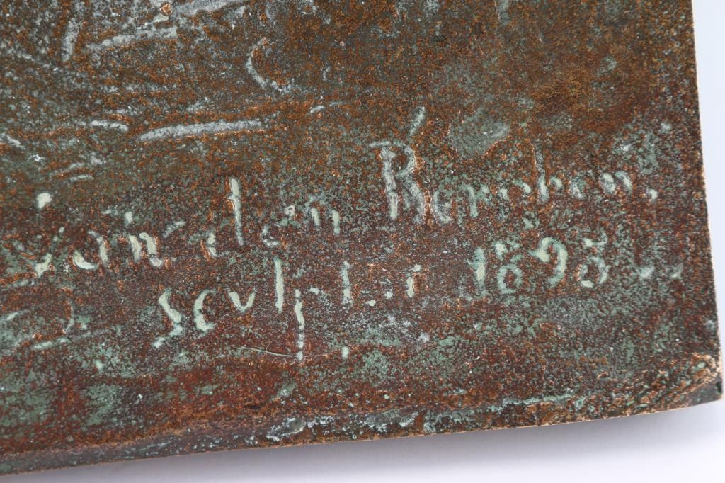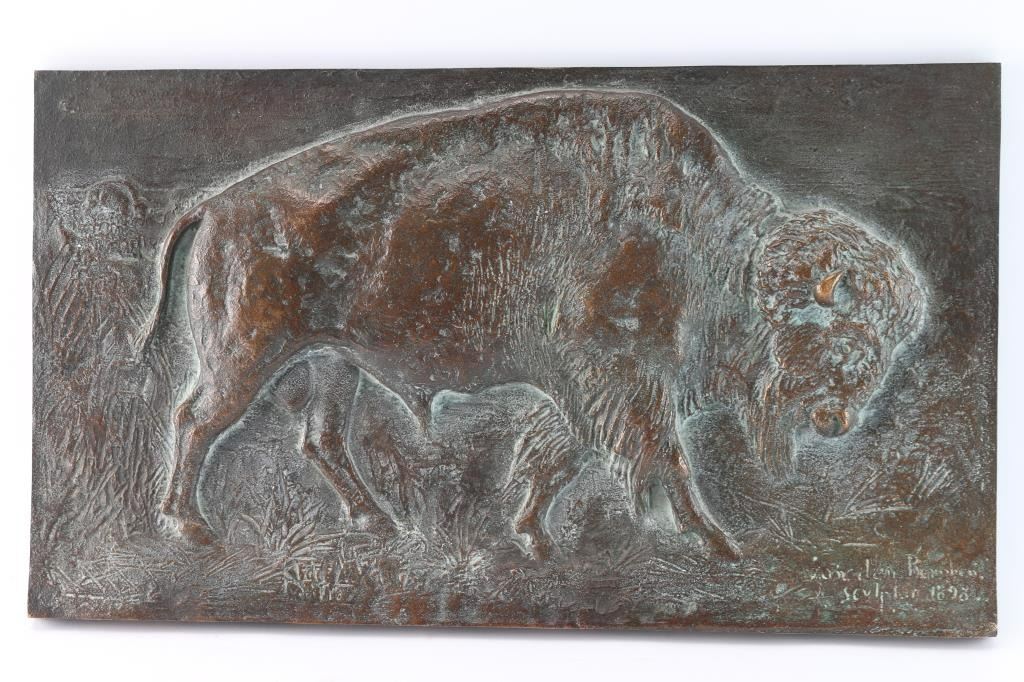Very nice antique bronze bas relief sculpture of a buffalo on the plains. It measures 19" x 11 1/4 and weighs 12 1/2 lbs. It is signed by the artist and dated 1898 in the bottom right hand corner but we could not make out the name. Came with a note taped to the back stating in hung in Colorado National Park foyer in the 1930,s in Denver.