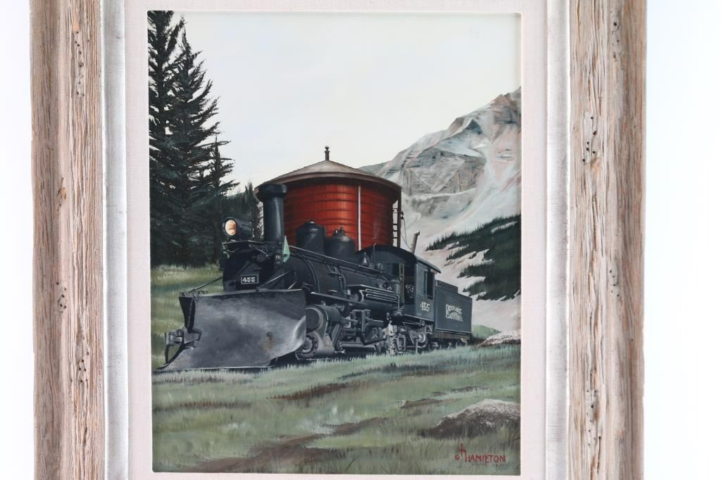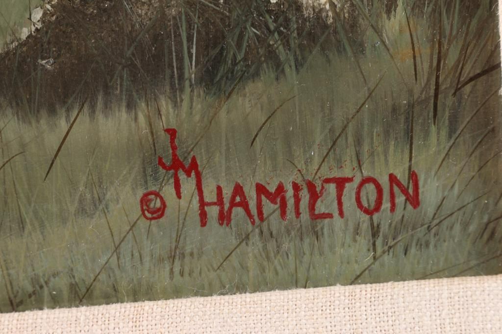 By Colorado artist, Jack M. Hamilton, entitled "Drink at Trout Lake". Hamilton loved the outdoors, nature's wildlife and American history. He spent years watching, studying and photographing his favorite subjects, often from his working cattle ranch in southern Colorado. Painting on both canvas and panel, Jack worked entirely in the medium of oil. Self-taught, Jack painted in the manner of the old masters. Hamilton was exhibited at many of the country's finest galleries and at many fine art shows. His work has been featured on the cover of, as well as in, national magazines. Measures 20" x 16".