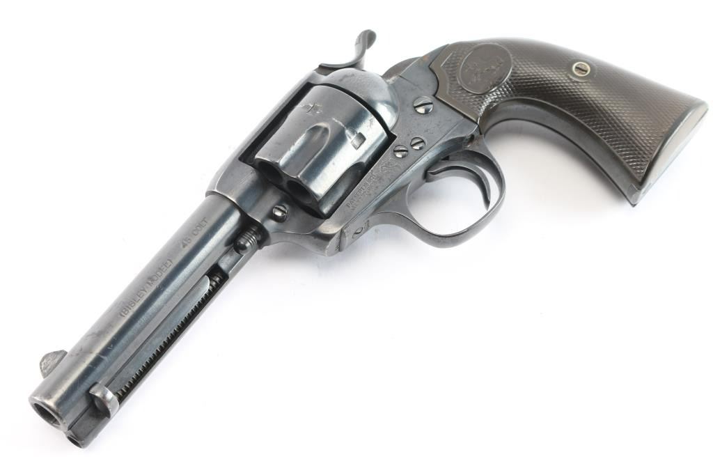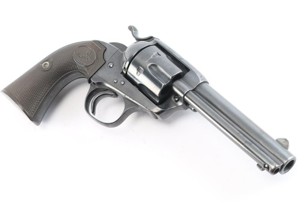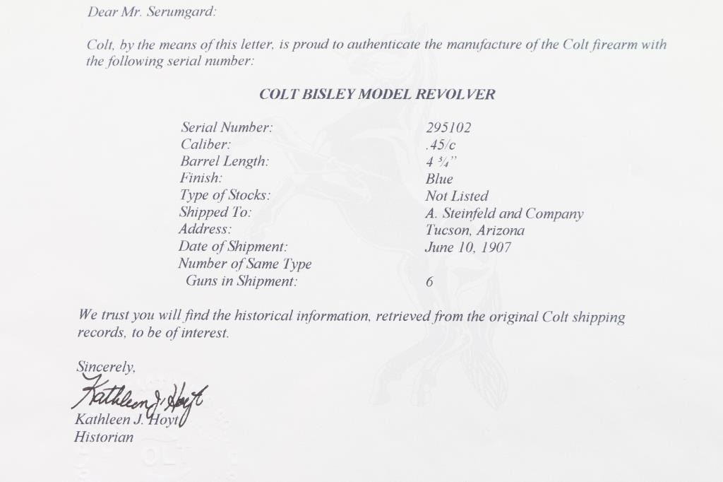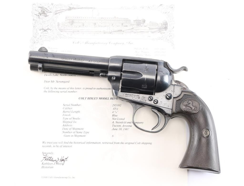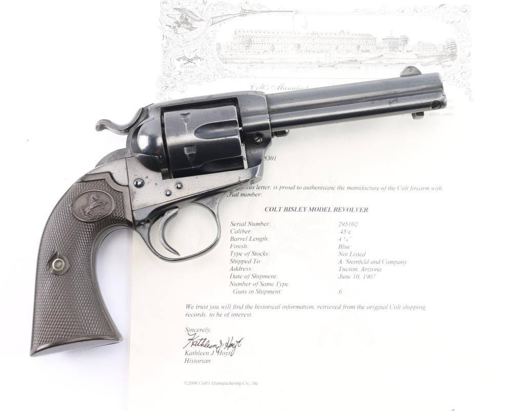 Vintage Colt Bisley manufactured 1907. The accompanying Colt factory letter dated February 28, 2006, confirms configuration and shipment to A. Steinfeld and Company Tucson, Arizona, on June 10, 1907, one of six in the shipment. The features of this revolver are as follows: Reblued finish, 4 3/4" barrel with blade front sight and frame notch rear sight. Two line block letter address on top of the barrel, "(BISLEY MODEL) and 45 COLT", clear, on the left side of the barrel and the left side of the frame is marked with the two-line, three patent dates followed by the circled Rampant Colt. Wide low hammer spur and wide trigger with characteristic "humpback" grip. Matching serial number on frame, trigger guard and bottom of backstrap, and the loading gate is numbered "4691". The left front of the trigger guard is marked with the Colt triangle "VP" proof, and the left rear is marked with the number "6". Fitted with two piece checkered hard rubber grips with the Rampant Colt in an oval at the tops. The bore is very good, strong rifling. Retains approx. 85% finish with some scattered light rust spots/pitting on top of barrel, receiver and back strap, edge wear and a drag line on the cylinder, action is crisp/smooth with tight lock-up, grips are good with some wear, there is more handling wear on the left panel and a chip is missing from the middle of the right grip panel. Markings are clear. The cylinder pin and mainspring are fine. NRA Condition is very good. ***C&R Firearm***.