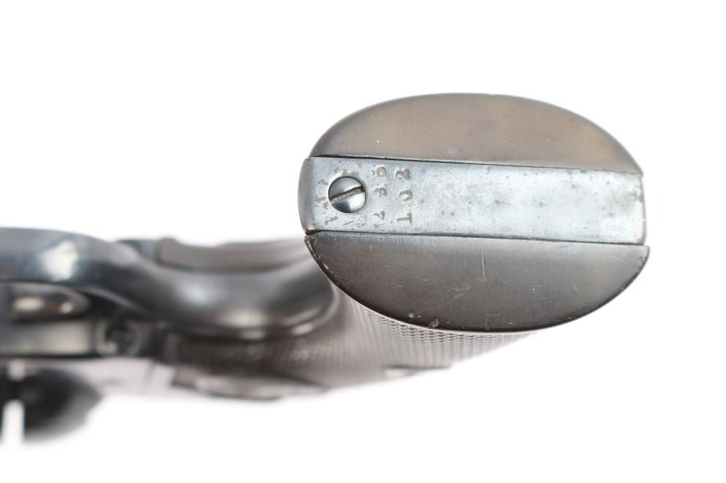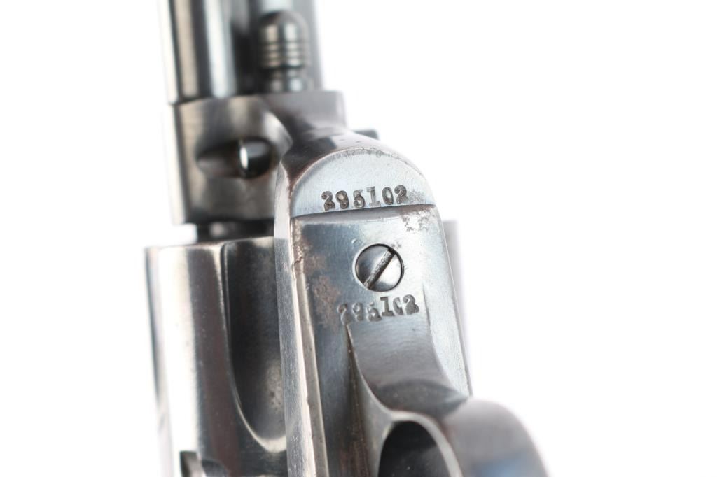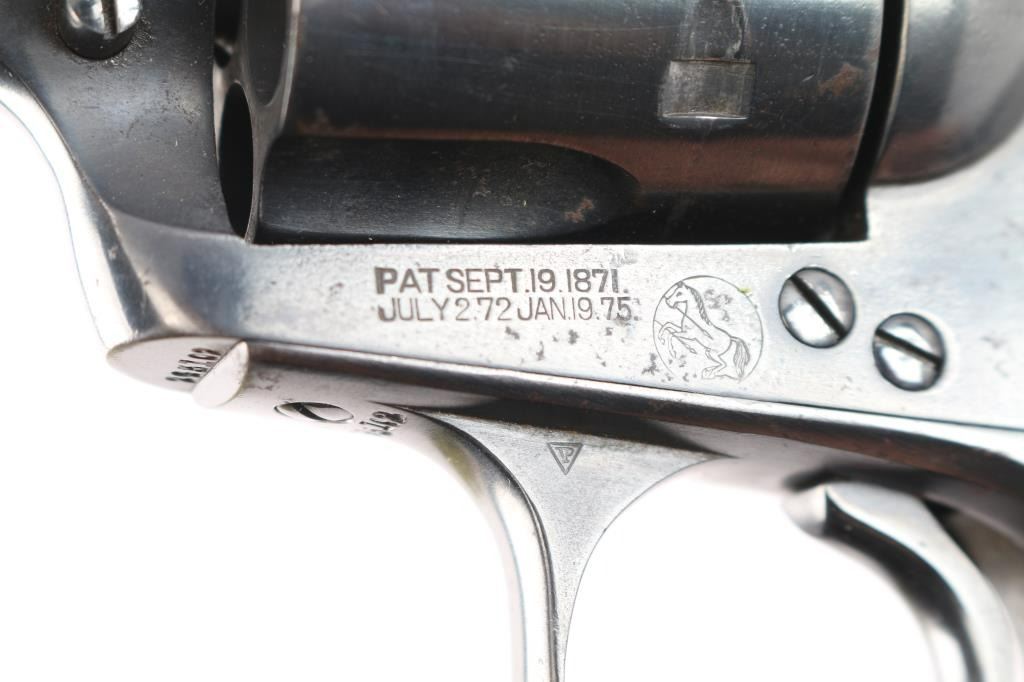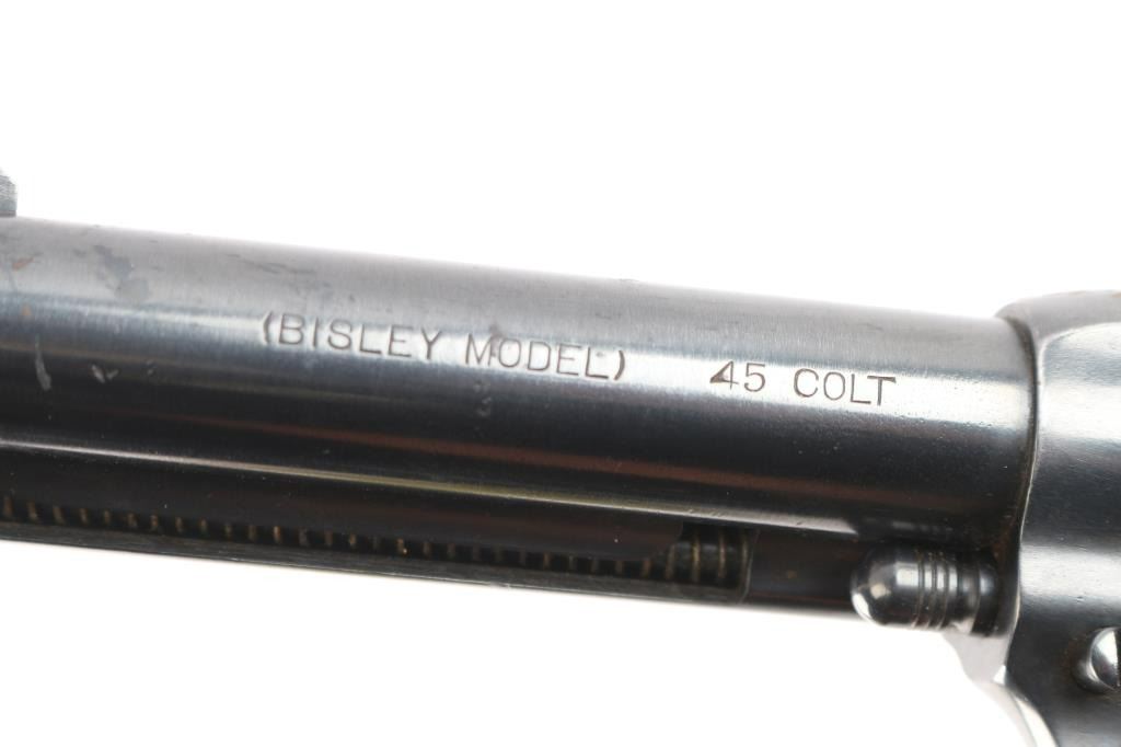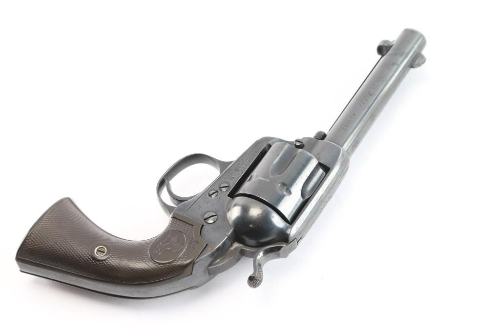 Vintage Colt Bisley manufactured 1907. The accompanying Colt factory letter dated February 28, 2006, confirms configuration and shipment to A. Steinfeld and Company Tucson, Arizona, on June 10, 1907, one of six in the shipment. The features of this revolver are as follows: Reblued finish, 4 3/4" barrel with blade front sight and frame notch rear sight. Two line block letter address on top of the barrel, "(BISLEY MODEL) and 45 COLT", clear, on the left side of the barrel and the left side of the frame is marked with the two-line, three patent dates followed by the circled Rampant Colt. Wide low hammer spur and wide trigger with characteristic "humpback" grip. Matching serial number on frame, trigger guard and bottom of backstrap, and the loading gate is numbered "4691". The left front of the trigger guard is marked with the Colt triangle "VP" proof, and the left rear is marked with the number "6". Fitted with two piece checkered hard rubber grips with the Rampant Colt in an oval at the tops. The bore is very good, strong rifling. Retains approx. 85% finish with some scattered light rust spots/pitting on top of barrel, receiver and back strap, edge wear and a drag line on the cylinder, action is crisp/smooth with tight lock-up, grips are good with some wear, there is more handling wear on the left panel and a chip is missing from the middle of the right grip panel. Markings are clear. The cylinder pin and mainspring are fine. NRA Condition is very good. ***C&R Firearm***.