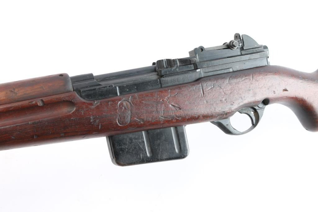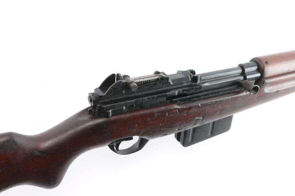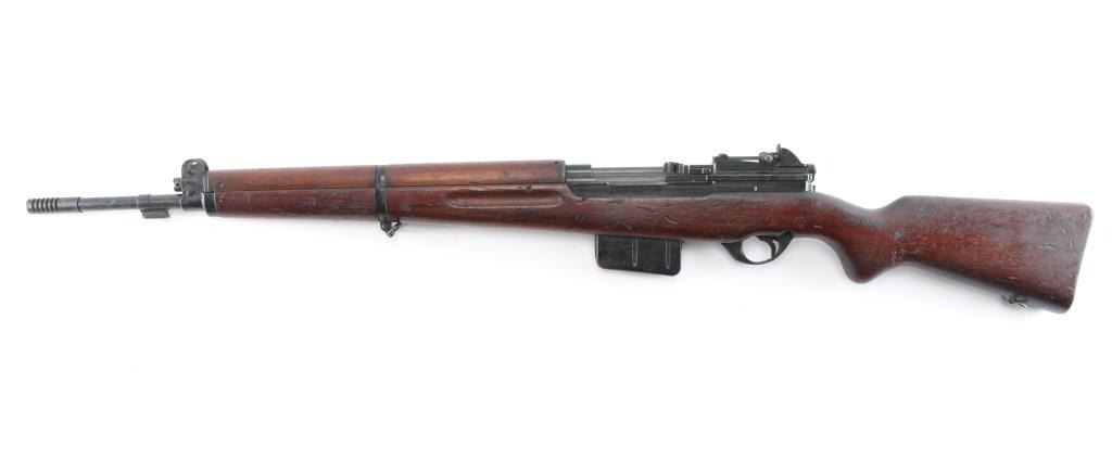 'FN49' Rifle. Semi-Automatic. Venezuelan Military issue. Belgium made by Fabrique Nationale. First FN 49 with vented muzzle break. Gas operated short-stroke piston, tilting bolt. 23.2" barrel, with protected front blade, and tangent rear sights. muzzle break and bayonet lug. 10-rd box magazine. Thumb safety on triggerguard. Venezuelan crest on receiver. FN markings on right receiver. Belgium proofs. Action is crisp/tight. Bore is very good/bright with strong rifling. Blued metal finish is about 95%, with some minor scratches/rubs. Magazine has a little surface rust on the edges, might improve with cleaning, wood is overall good/sound with many dings/dents,The right side of the stock is marked with a circular cartouche that contains “FUERZAS ARMADAS / VENEZUELA”, (Armed Forces / Venezuela.) sling swivels, ribbed steel buttplate. Low serial number. No import marks. Manufactured 1949-61. Matching serial numbers.