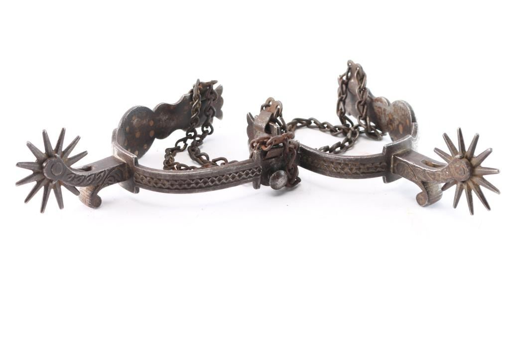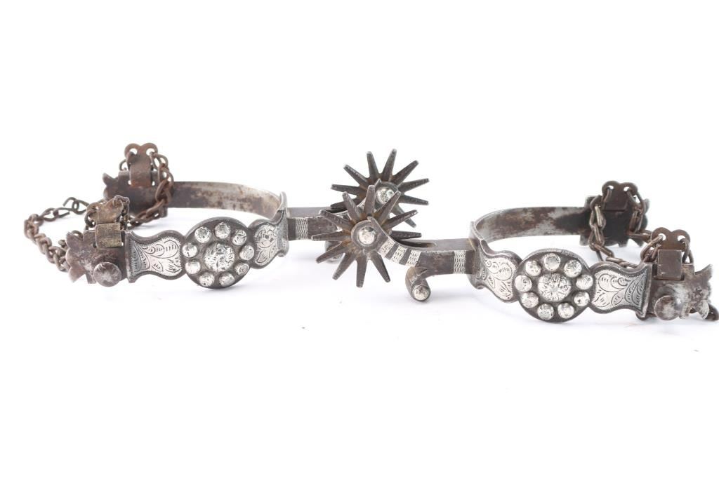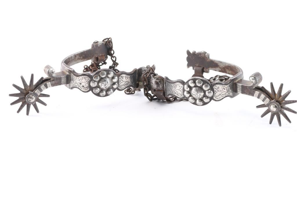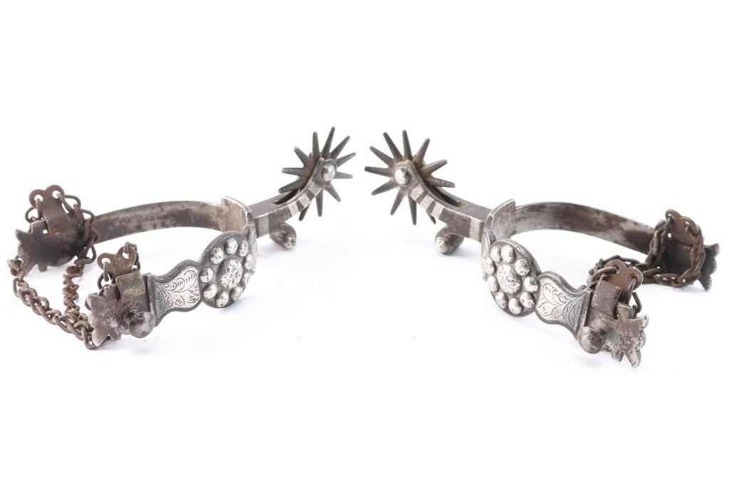 An early pair of California style "Target" pattern, with Silver inlays, silver dots maker marked with star and hand forged steel stamping. Good condition, pattern rarely seen.
