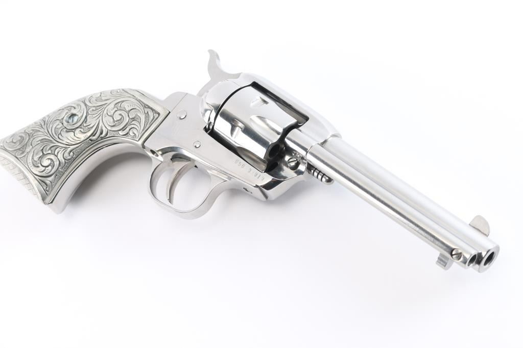 #650-34919. Single action centerfire revolver Features a high polish stainless steel finish, two piece pewter fancy engraved Grips, 4.5" barrel, fixed sights, fluted 6 shot cylinder. Transfer bar safety. Bore is excellent/bright. Retains 98% finish with very minor scratches. grips are excellent. Action is smooth with tight lock-up. Comes in factory gray hard case with matching label, manual and the original factory faux ivory crips. Manufactured 2000.