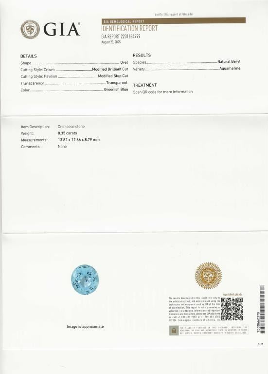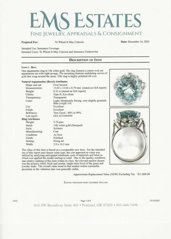 featuring a G.I.A. Certified oval cut Blue Aquamarine with excellent cut and polish set in 14 karat white gold setting. Ring size 7 ¾. Full Retail Appraisal - $11,800.00.
