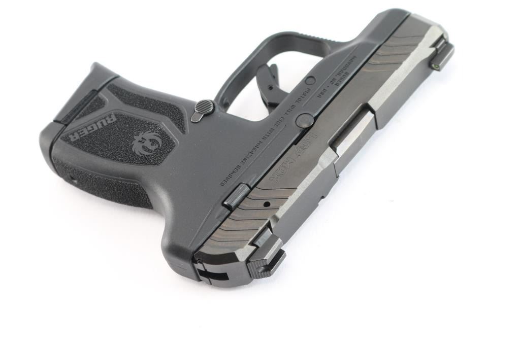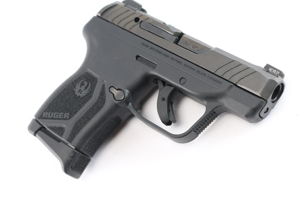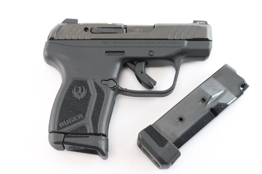 Semi-automatic pocket pistol chambered for .380 ACP. Manufactured in Mayodan, NC. 2-3/4" barrel, black oxide finished slide with serrations front and back. Tritium dot front sight and serrated U-notch rear sight. Black polymer frame with textured grip with Ruger logo, trigger safety, slide release, serrated front trigger guard and reversible push button mag release. Bore is excellent/bright. Retains 99% finish with little to no scratches or marks. Comes with original box, manual, one 10rd metal magazine (2 total), magazine speed loader.