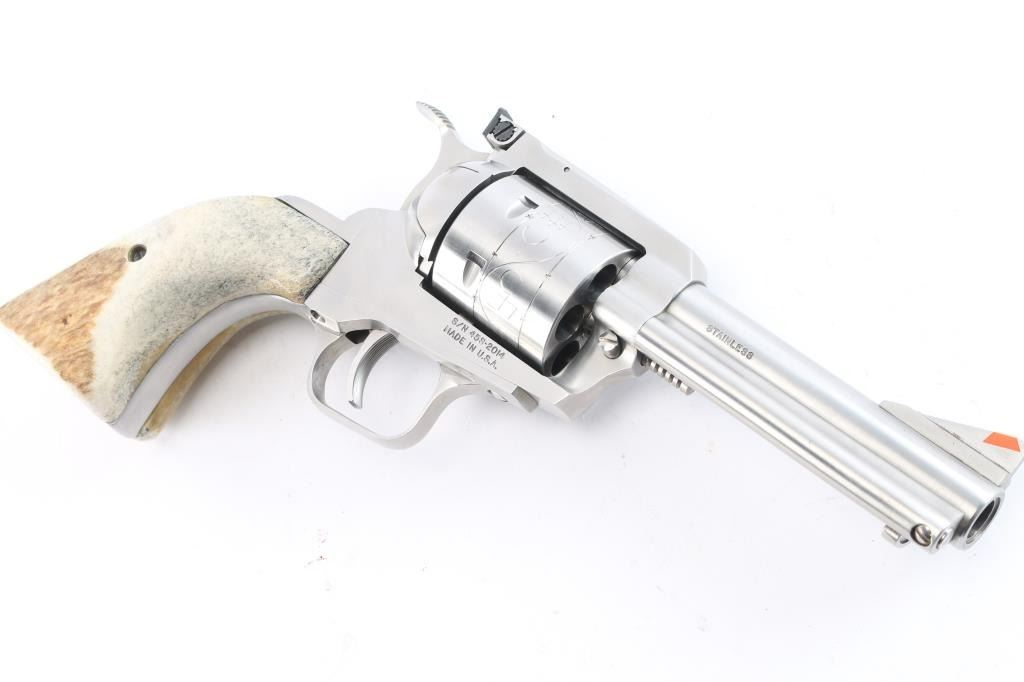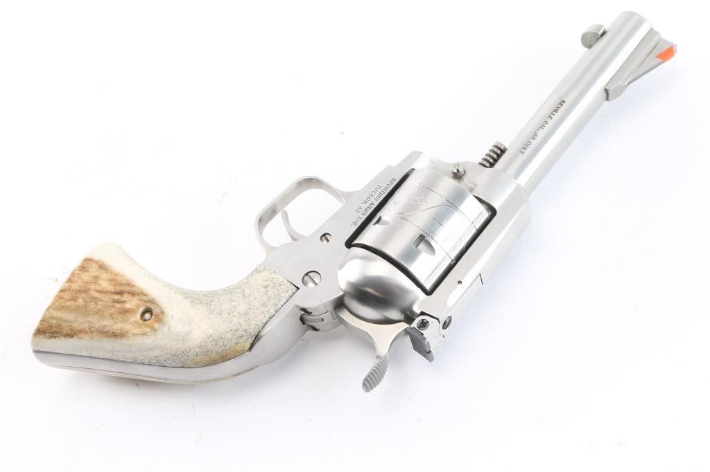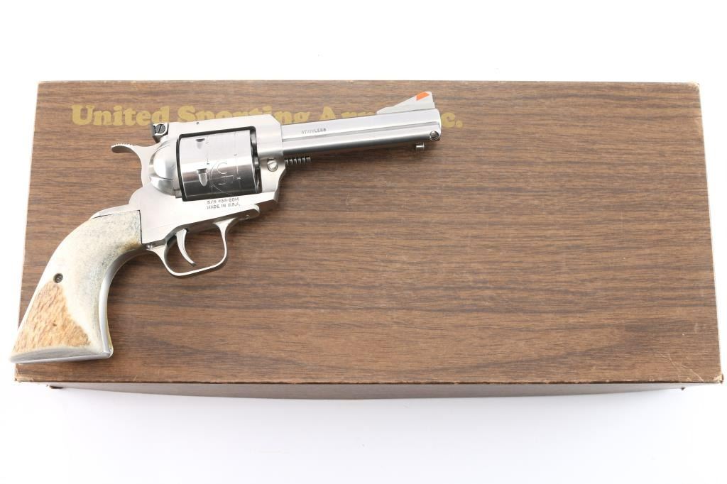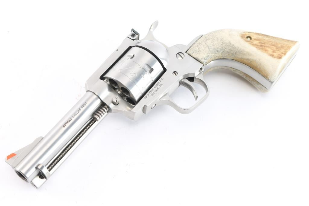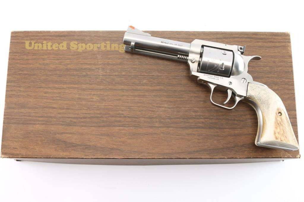 Single action six shot revolver chambered in .45 Colt. Copy of Ruger Blackhawk revolver made by Sporting Arms Inc. Tucson, AZ. Features stainless steel construction, a 4 5/8" barrel, engraved non-fluted cylinder, ramped serrated blade front sight with orange insert, adjustable rear sight, serrated wide hammer, serrated wide trigger and two piece over-sized stag grips. Smooth action with tight lockup. Bore is pristine. Retains approx. 99% finish with very few handling marks. Comes with original factory box. Condition is excellent. ***Modern Firearm***