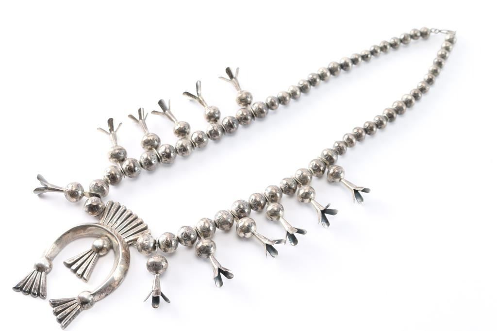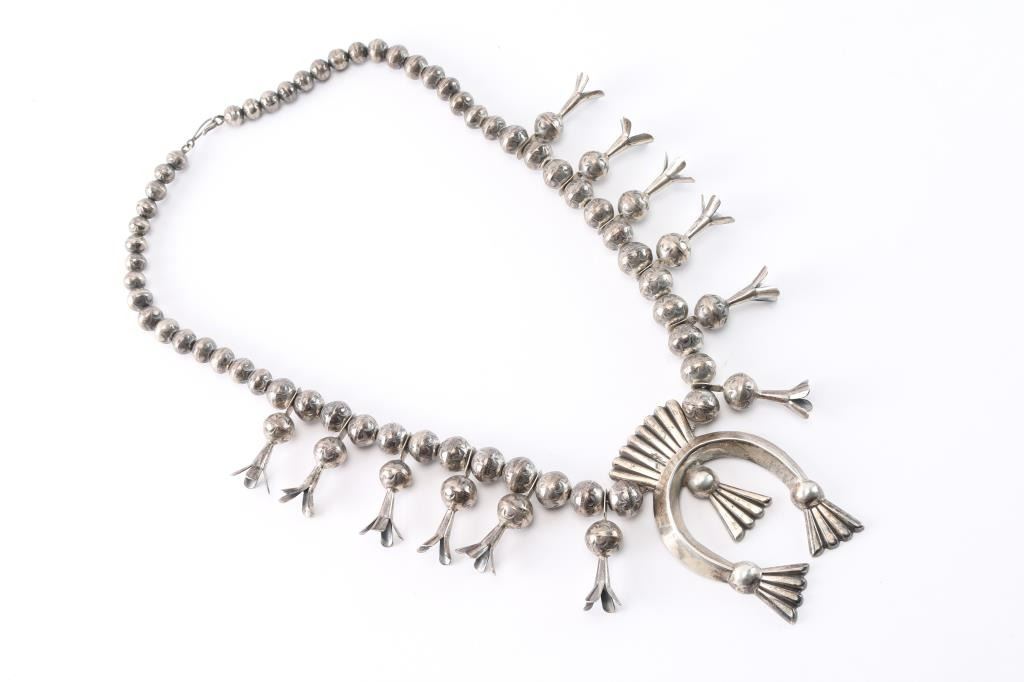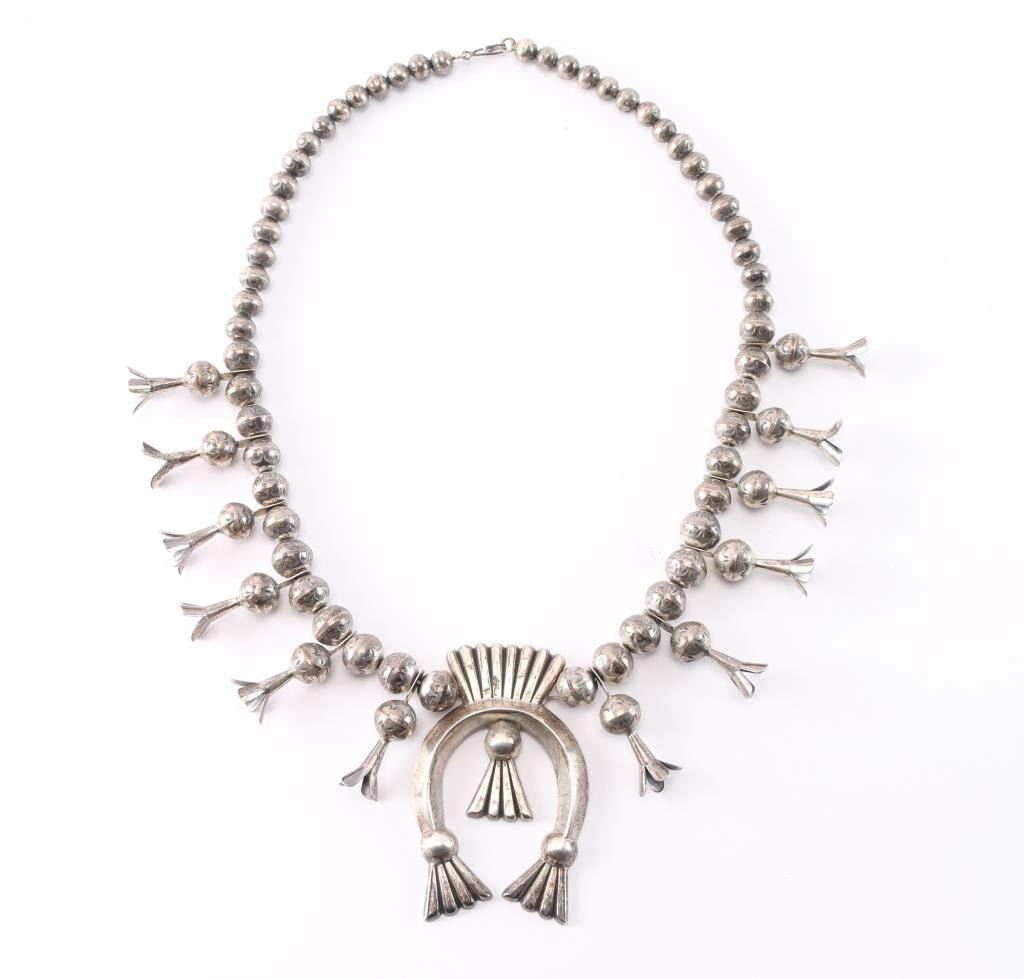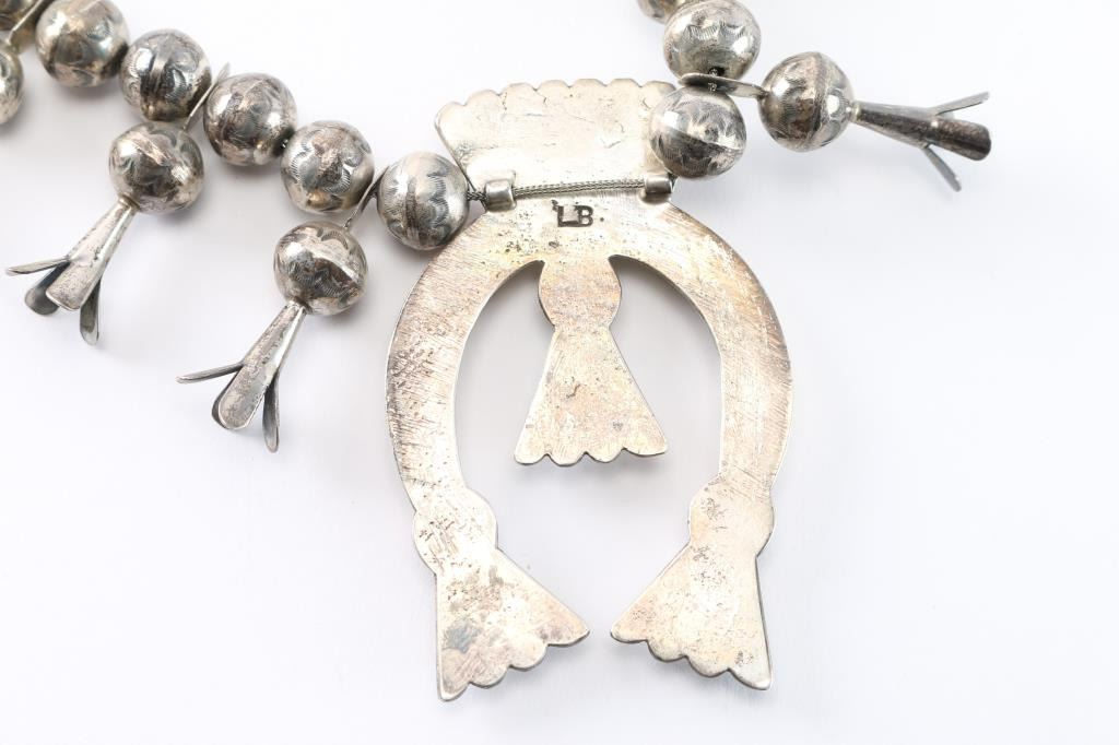 With 3" sterling naja and ten 1" squash blossoms. Maker marked "L.B." Measures 13 1/2" from drop.