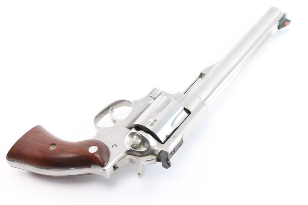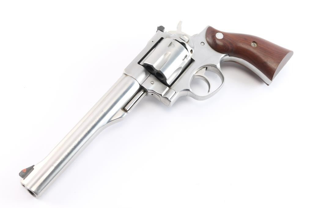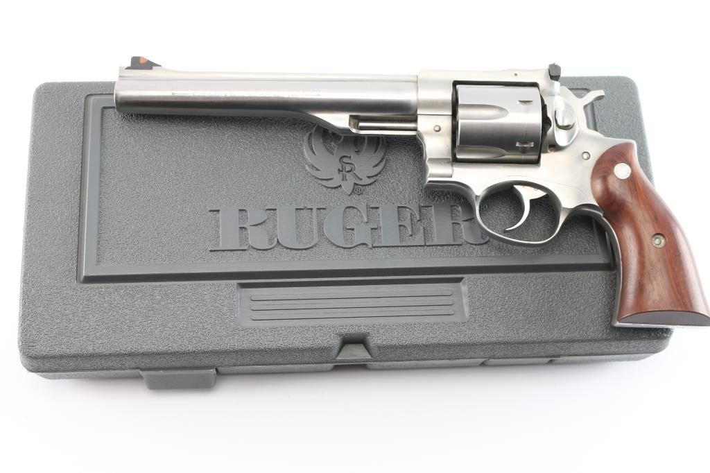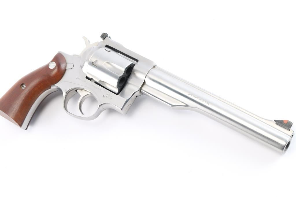 Stainless steel large frame double-auction revolver chambered in .44 Magnum, manufactured circa 2015-2018. Features a satin stainless finish, 7 1/2" barrel with serrated sighting rib, dovetailed serrated ramp front sight with orange insert, adjustable rear sight with white outline, smooth trigger, knurled hammer spur, transfer bar safety, fluted six-shot cylinder, shrouded ejector rod, and two-piece smooth brown wood grips with Ruger medallions. Includes a factory grey hard case, manual and lock. Revolver exhibits only light handling marks and a very faint drag line on the cylinder with no major wear observed. Action is smooth with very good lock-up, the bore is excellent/bright and the wood grips are fine.
