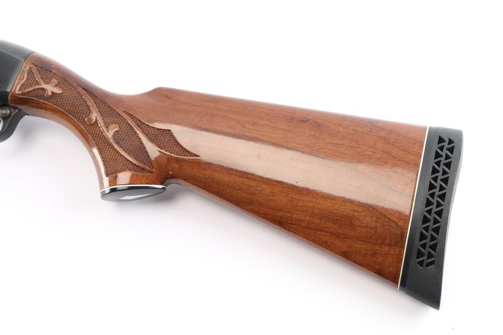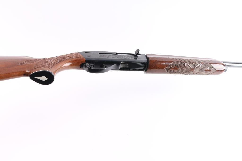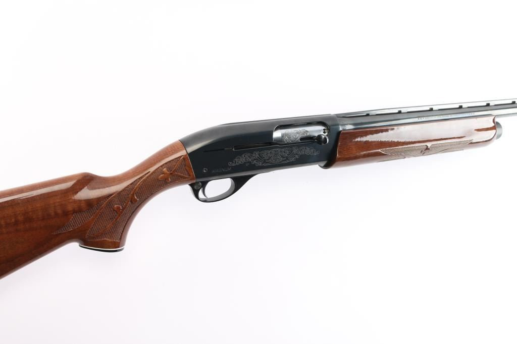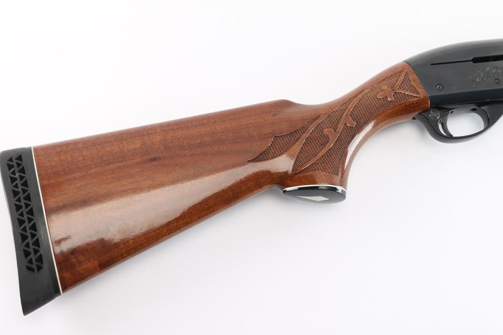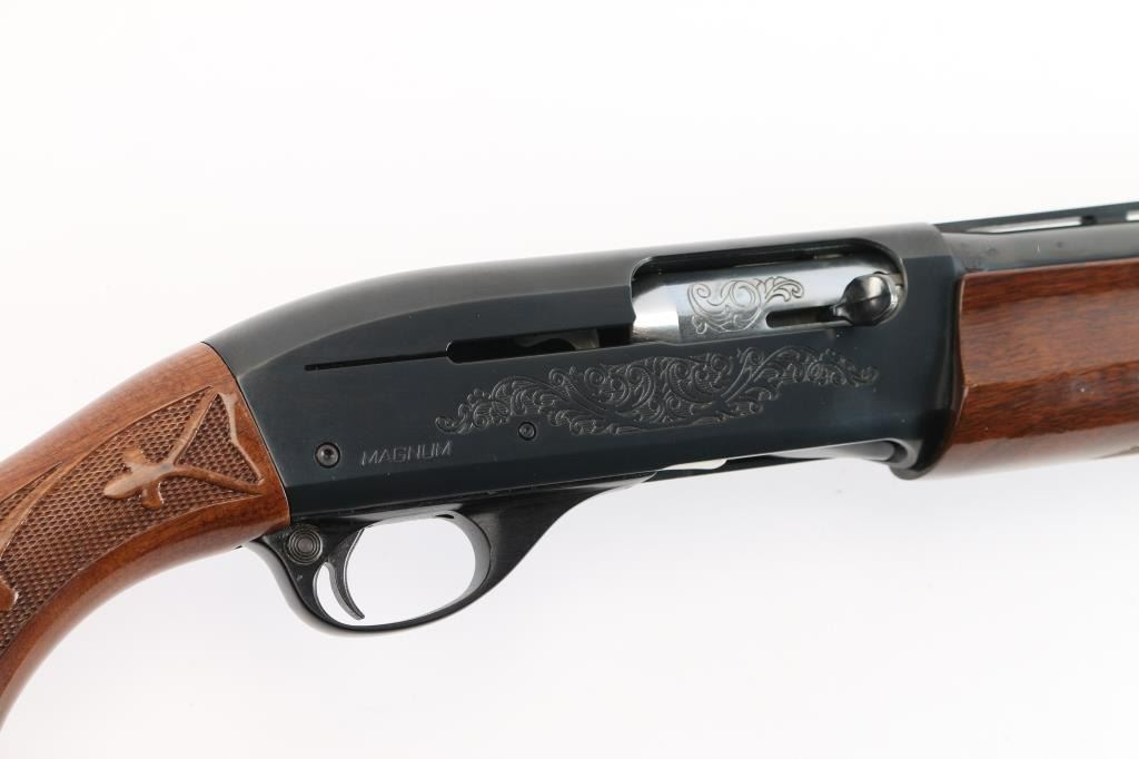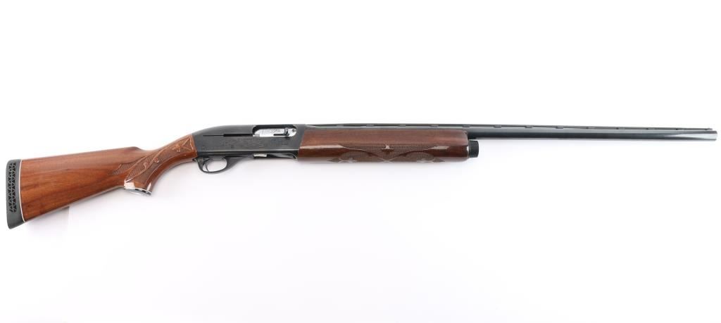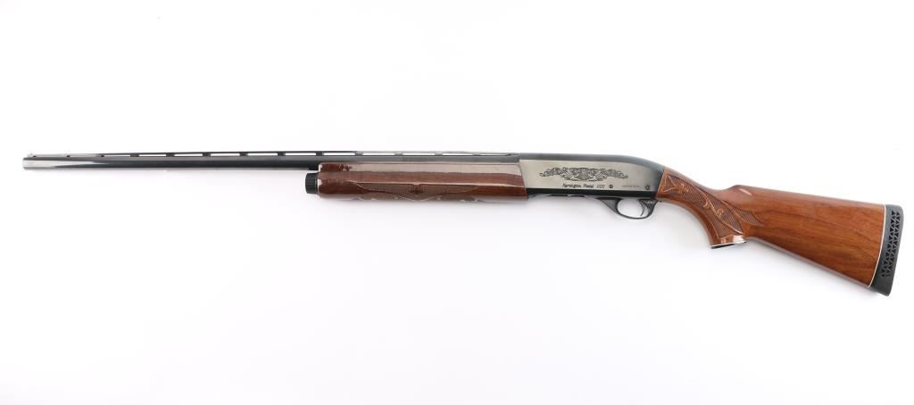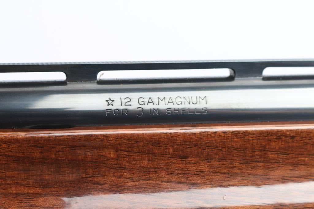American made gas operated semi-automatic shotgun chambered for 2 3/4" & 3" 12 gauge shells. Manufactured 2010. Features a blued finish, 30" vent rib barrel with fixed Full choke, silver bead front sight, half-length tube magazine, simple floral scroll roll-stamp engraving on the receiver & bolt, smooth trigger with beveled edges, alloy triggerguard, serrated charging handle, push button safety, fancy press checkered walnut forend with high gloss finish, and pistol grip shoulder stock with grip cap & factory recoil pad. Shotgun exhibits approximately 98% of its original finish showing little wear. Action is smooth, the bore is excellent/bright, and the wood stocks are excellent with a couple of minor blemishes.