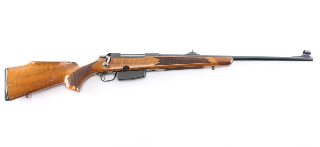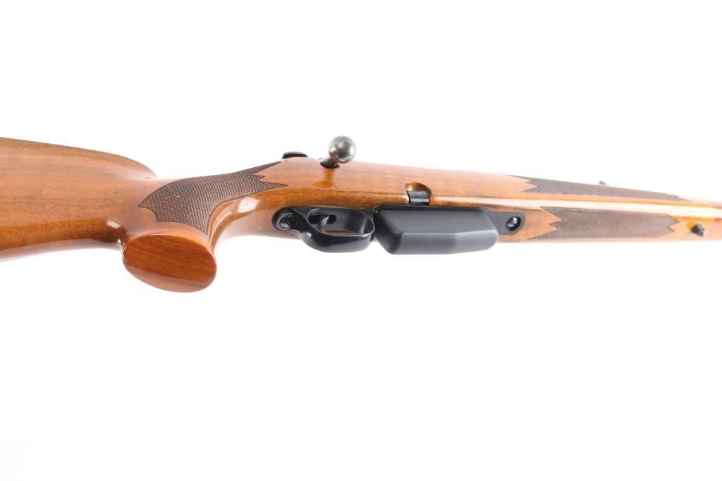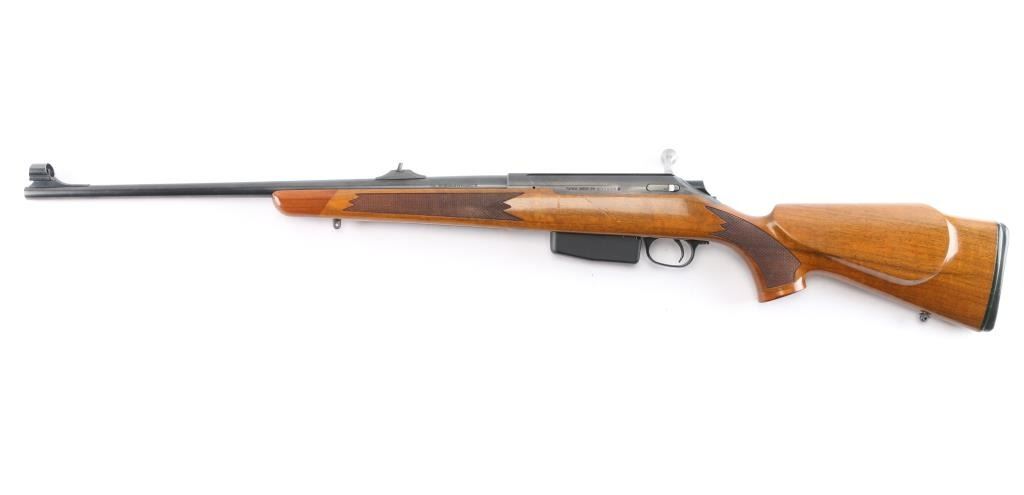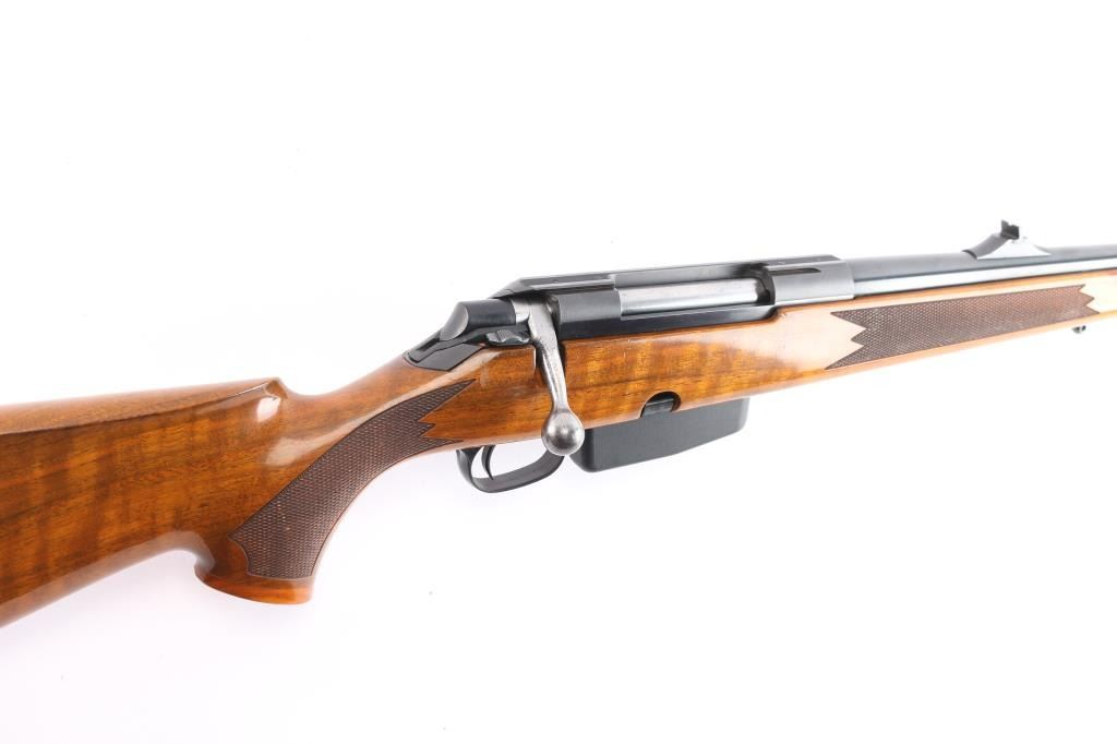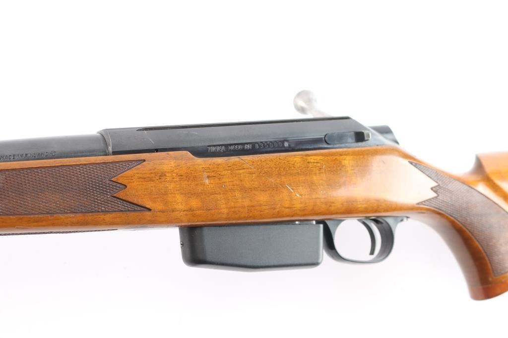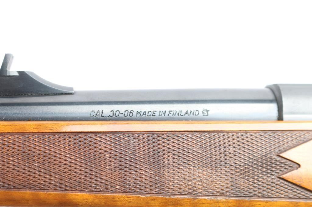 "Right Hand" quality long action bolt action rifle made in Finland, no importer mark observed. Manufactured 1990-95. Features blued barrel, matte receiver, stainless steel bolt, checkered wood stock with right-handed cheek rest, contrasting wood grip & fore caps, sling swivel studs and factory rubber recoil pad, 22" tapered barrel, hooded blade, square notch rear sights, detachable magazine, manual thumb safety, red dot 'cocked' indicator, serrated trigger, dovetailed receiver for optics. Bore is very good/bright. Retains 95% finish with minor scratches/rubs, some chips on the sight hood. Stock is excellent with a few very minor blemishes.