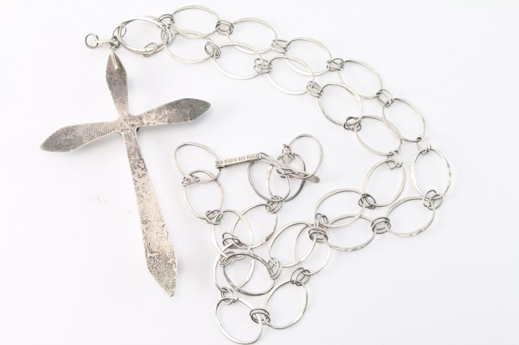 Cross measures 5" x 3 1/4". On sterling silver 70's style chain from China.