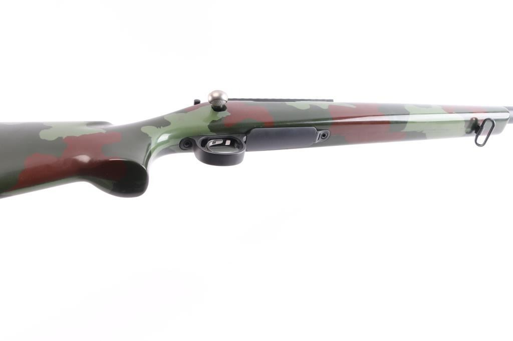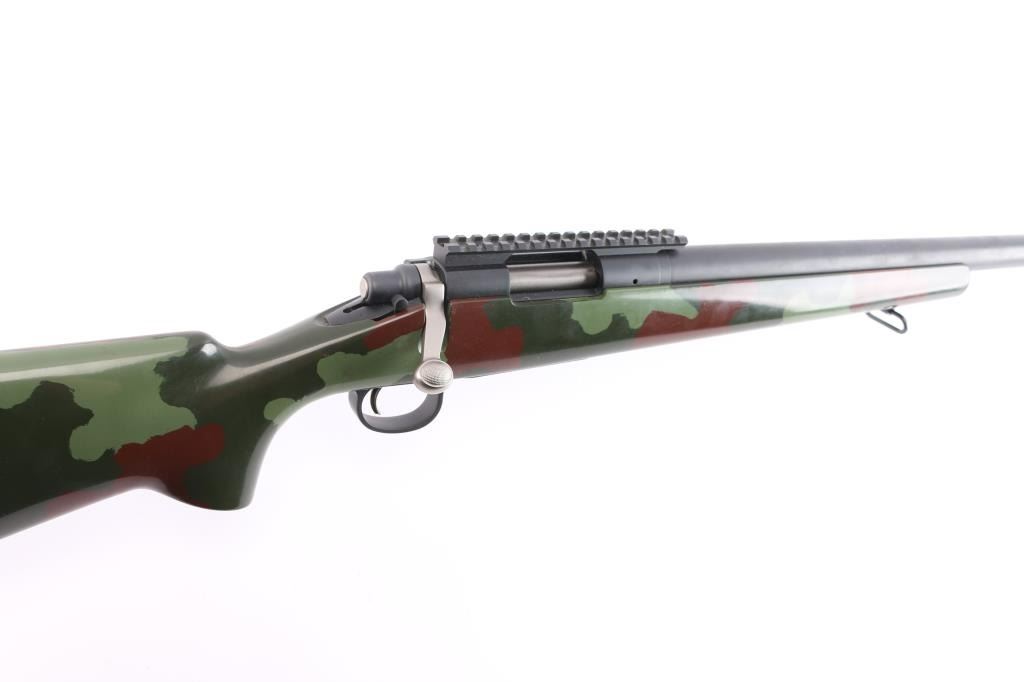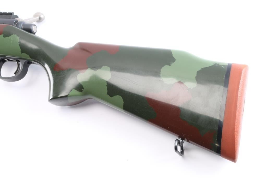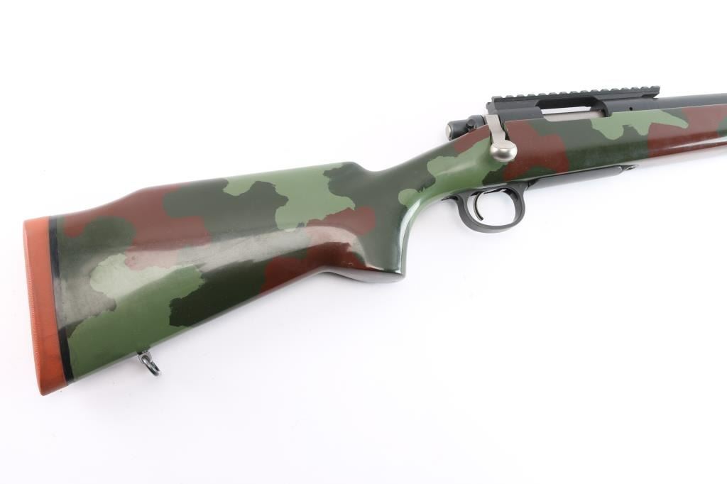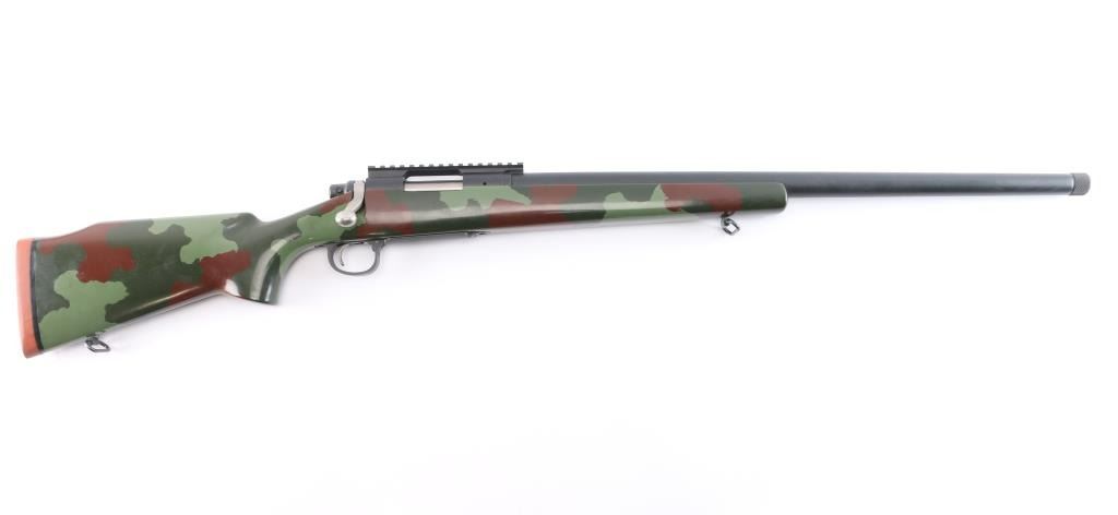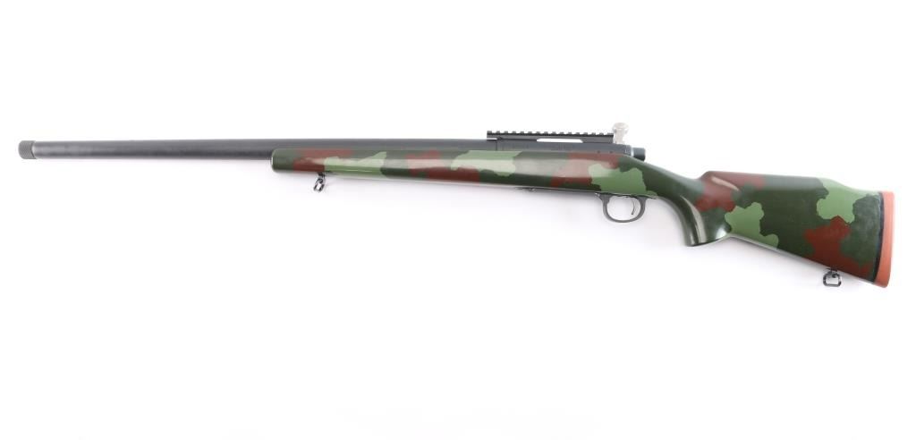 This is a custom USMC M40A1 clone built on a Remington 700 BDL action, as were the real ones. 25" threaded Schneider 1:12 barrel with no provisions for sights. The stock is a McMillan HTG M-40 composite M40A1 sniper stock, Monte Carlo comb, brown rubber buttpad, sling mounts with McMillan's Forest camo finish, Wichita sling swivels. Badger Ordnance recoil lug, PTG 700 tactical triggerguard, Remington X-Mark trigger group, hinged floorplate, EGW thread protector. Thumb safety, Badger Ordnance 1005-306-06 scope rail installed, left receiver drilled/tapped for side mounted sight. Robar Chrome Sulfide finish. The bore is bore is excellent/bright, action is smooth, stock is excellent and the metal finish is about 99%.