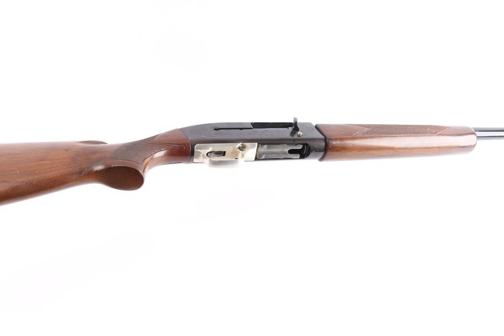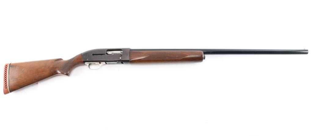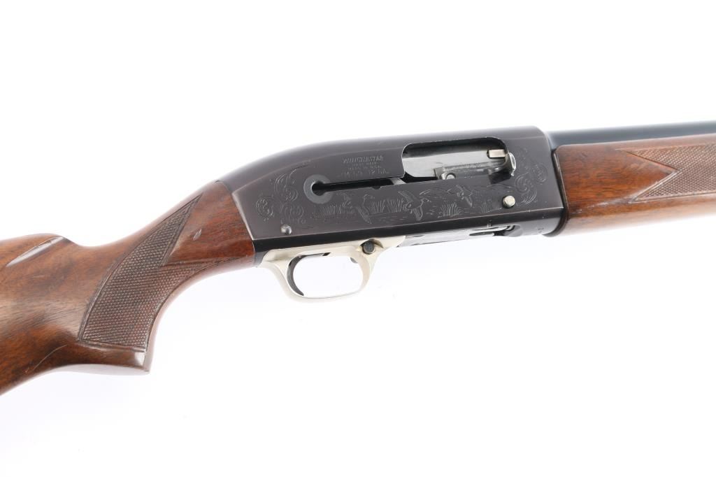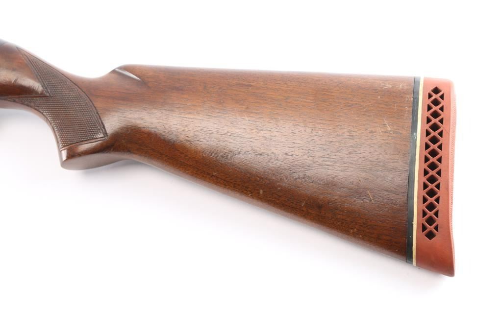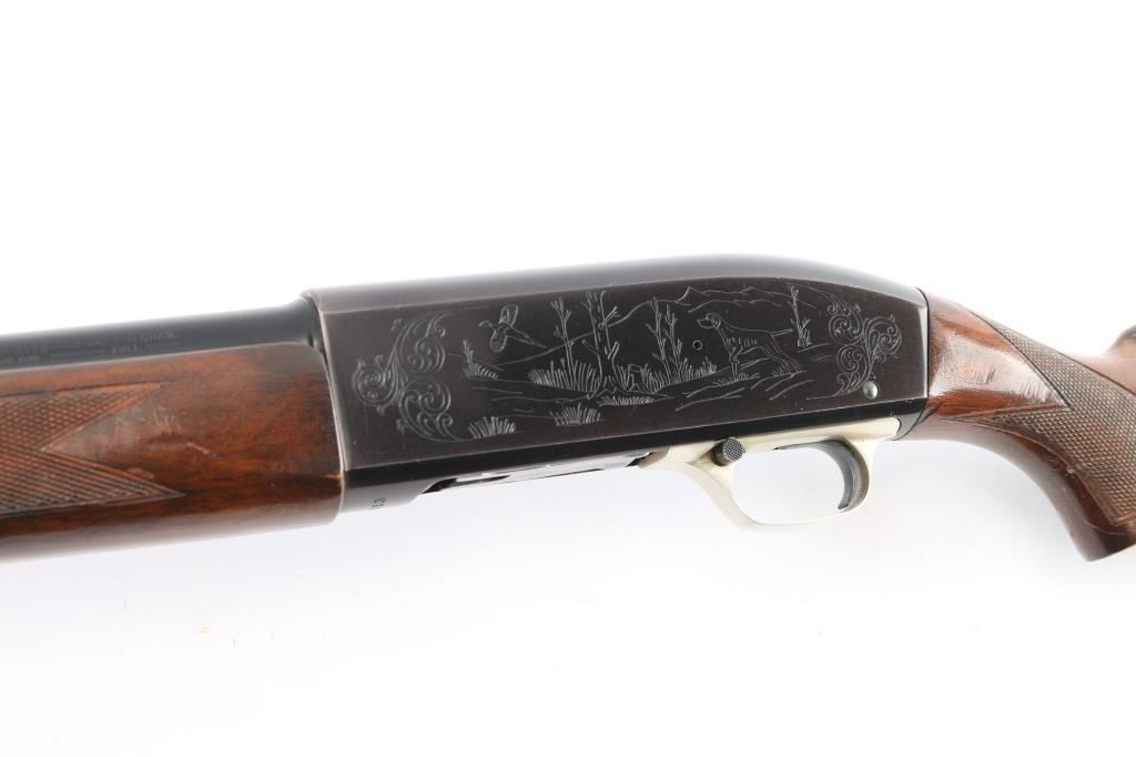 The Winchester M 59 is an American made semi-automatic shotgun using a short recoil action made between 1959 and 1965. It features a Win-Lite glass fiber barrel which is made of some 500 miles of glass fiber tubes wound around, fused and bonded to a thin steel liner. The blued barrel is 30", has a steel bead front sight, is chambered for 2.3/4" 12gauge shells and has a fixed full choke. The shotgun receiver is made out of a lightweight aluminum and has hand-finished and hand-checkered walnut stocks, vented Pachmayr recoil pad with black/white spacers. The receiver is engraved with ducks on the right and a dog and pheasant on the left. Aluminum alloy triggerguard. Lop 14". Bore is excellent/bright. blue is about 945 with edge wear, minor scratches. Wood stocks are overall very good with minor scratches/dings, there is a slight hairline crack in the lower right forearm.