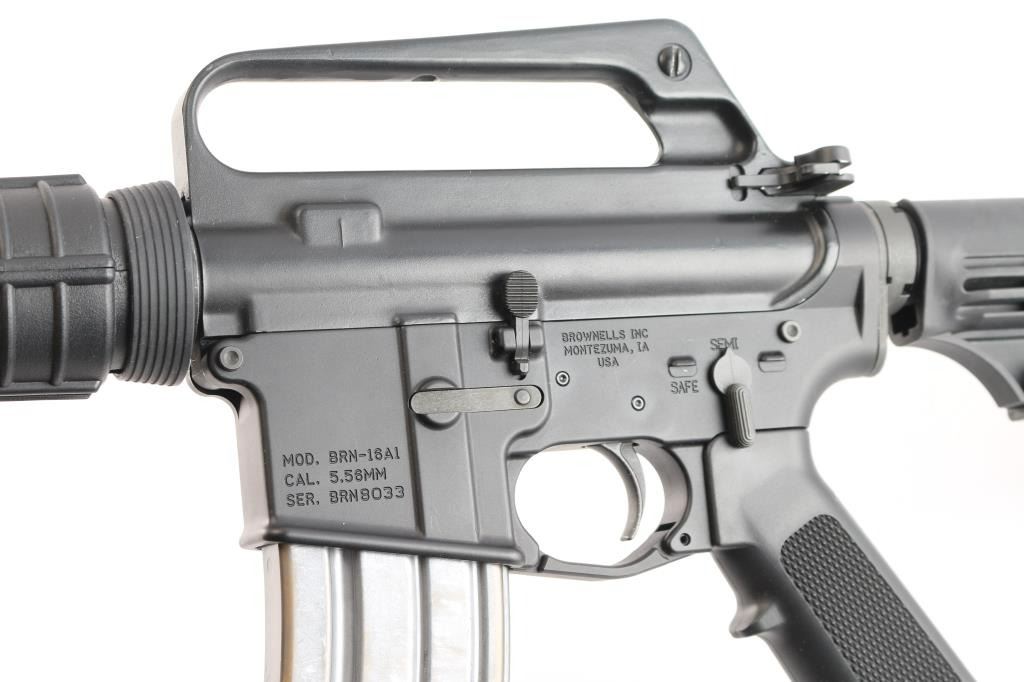 This is a custom A1 carbine built on a Brownell's BRN-16A1 lower, part of their Retro line 1967-82. The rest of the carbine is built with original (Not Reproductions) USGI parts. USGI A1 flash hider & CAR handguards. A1 upper receiver has the tear drop forward assist, integral carrying handle with flip peep sights, trigger/hammer assembly, bolt carrier assembly and charging handle. 5.56 16" barrel with A1 front post sight/gas block. collapsible buttstock, sling swivels. One Colt 30-rd magazine, has some handling wear. the bore is excellent/bright, the phosphate finish is excellent. Carbine is in almost new condition.
