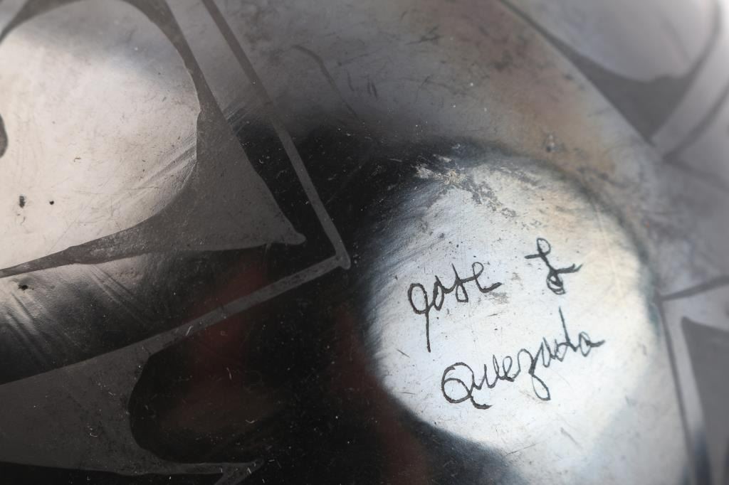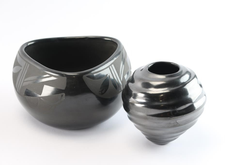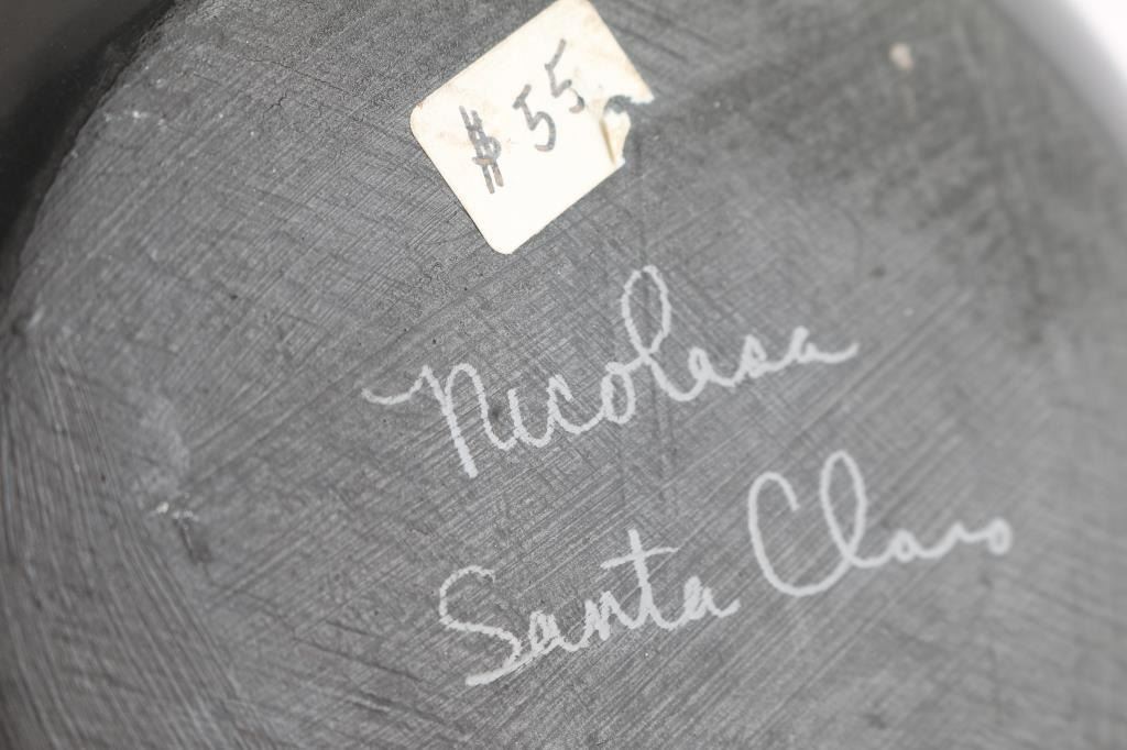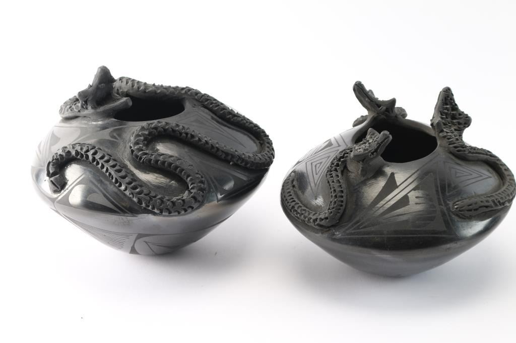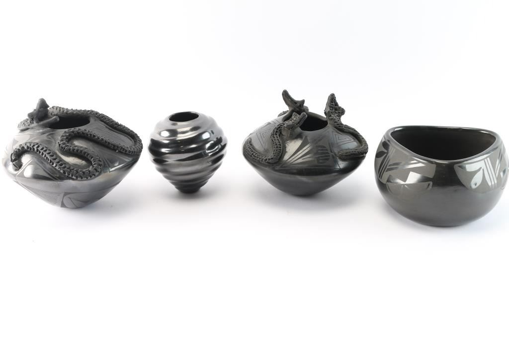 (1) Santa Clara Nicolasa Naranjo, 6" x 4". (1) Bee hive blackware pot maker marked, 5" x 4". (1) Black figural 3 snake pot, signed, 6" x 7". (1) Black figural snake pot, signed, 7"x 8"