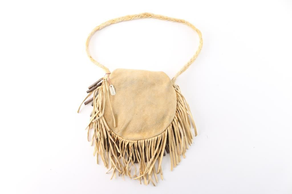 Multi colored beaded design on buckskin with rawhide fringe, edged in tin cone cylinders. Round, measures 5 1/2" with braided buckskin handle. In excellent condition.
