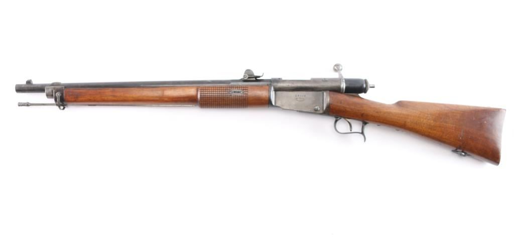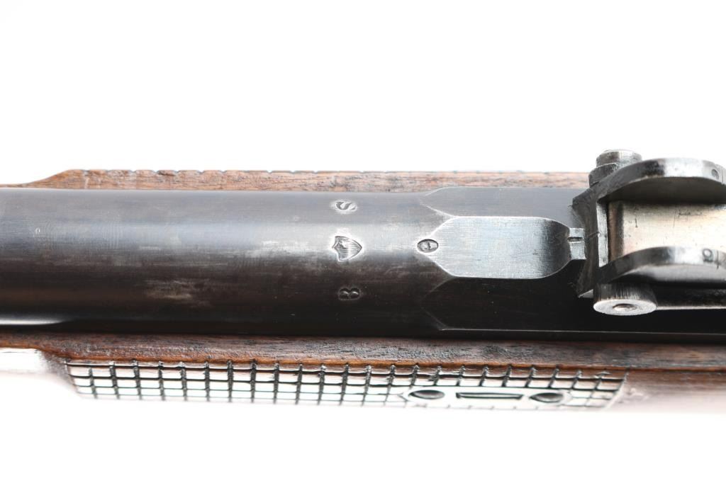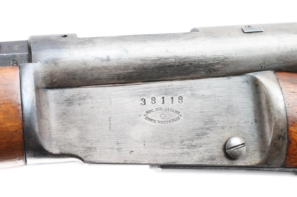 The 1871 Vetterli Karabiner (Carbine) was a shortened, repeating rifle designed for Swiss cavalry and special troops. Manufactured circa. 1871-74. Manufacturer's mark "Soc. Ind. Suisse Syst. Vetterlin" with Swiss Cross and serial number stamped on left receiver. Serial number matched on receiver, barrel and magazine lifter. 20" Knox form barrel with blade and elevation adjustable rear sights, cocking indicator, finger rest triggerguard, sling swivels, cleaning rod. Nice honey colored wood checkered/smooth forearm with steel cap, butt stock with steel butt plate. Blue is about 60% with handling wear, mostly on the receiver & triggerguard, the bore is excellent/bright with strong rifling, wood is very good/sound with a few minor sctraches/dings and the action is smooth.