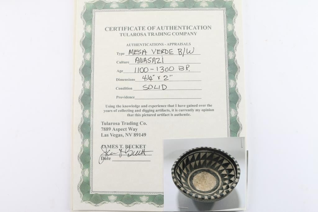 Measures 4" around, 2" tall. Anasazi, 1100 - 1300 B.P. Condition is solid. Includes Certificate of Authentication from Tularosa Trading Company, Las Vegas NV.