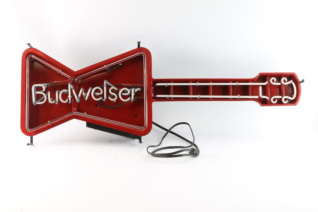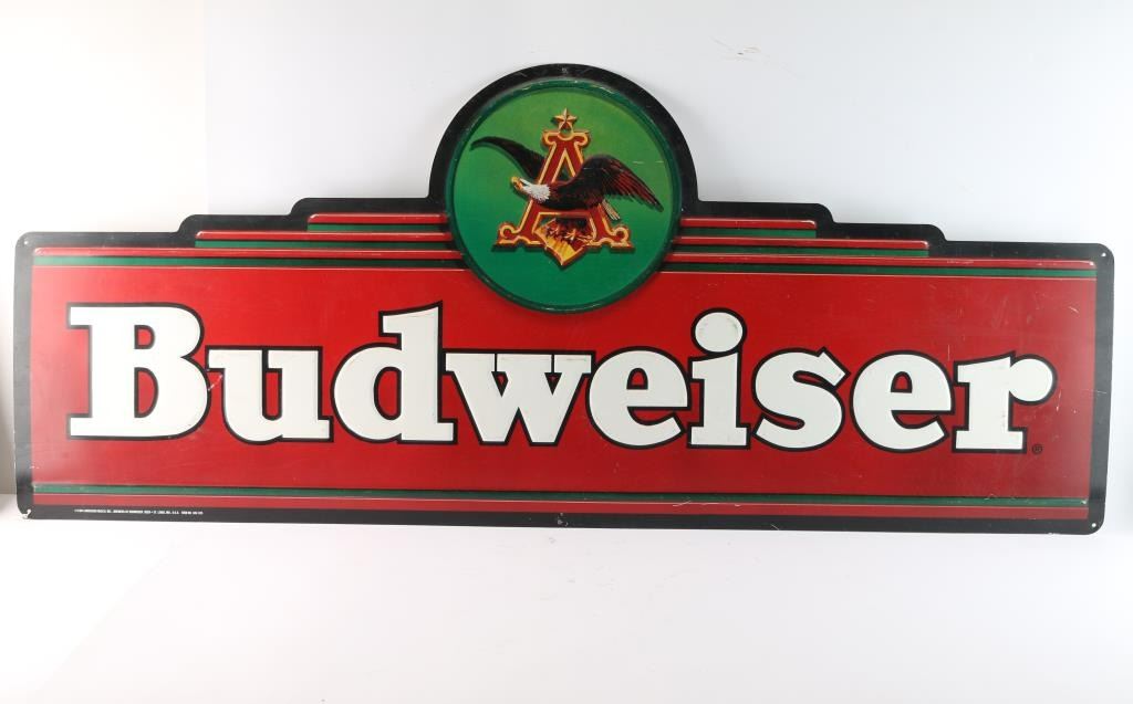 (1) Working neon Budweiser sign. (41"W x 15"H). (1) Metal Budweiser advertising sign (59.5"W x 25"H). ***Buyer Must Arrange Shipping***