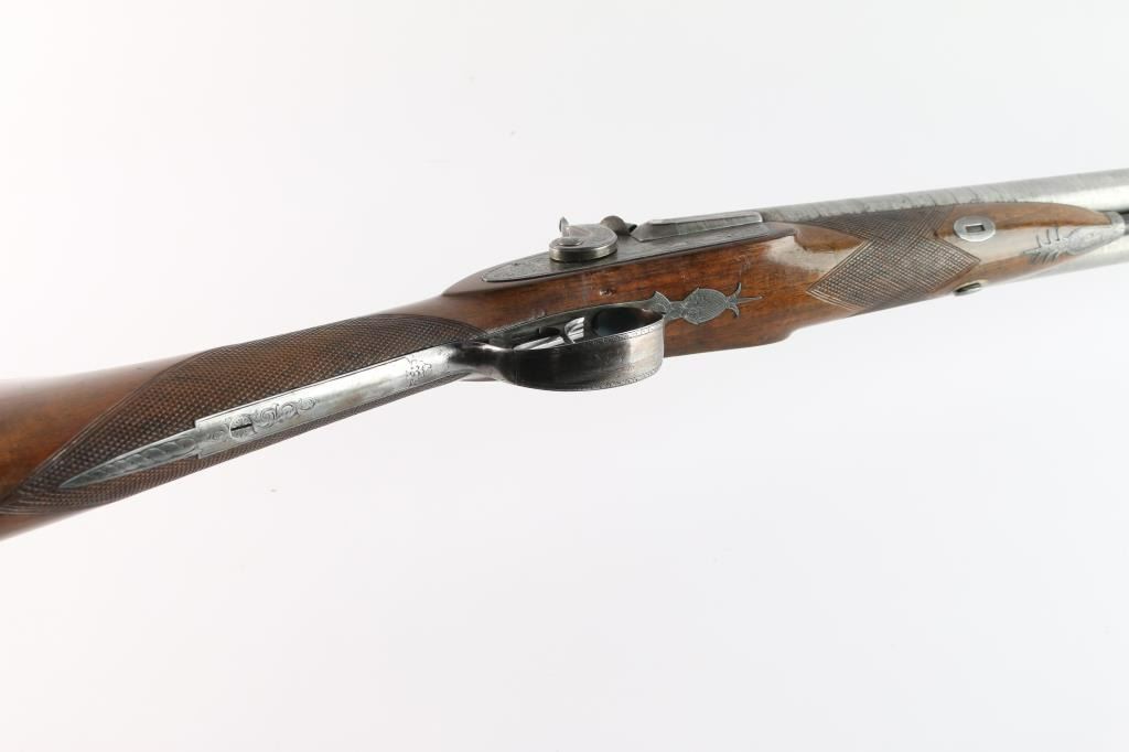 Scottish, 30 1/4" bbls and 46" overall. Nicely engraved locks and mounts with select burl checkered walnut stock. Strong case colors about 50-70% visible and a same amount of damascus pattern on bbl going to light silvery patina. Crisp action with original rod. A strong 8 plus on 1-10 condition scale and a fine gun.