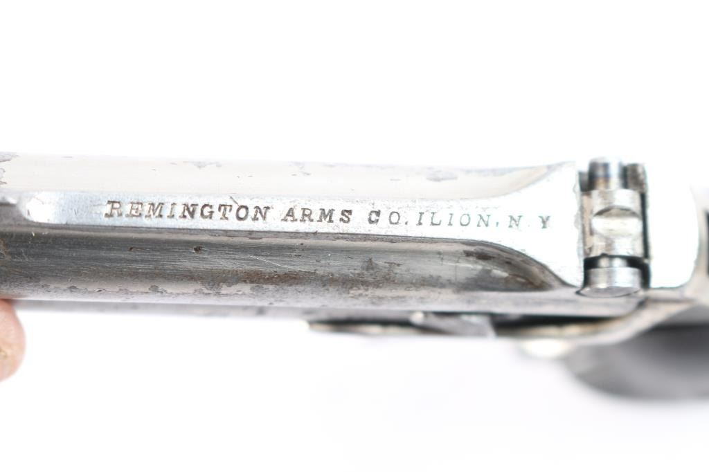 With 1 line Remington Arms Co, Ilion, NY address. 30-50% original nickel with good grips. Releaselatch sheared and broken away, right hinge "ear" sheared off. Many small nicks and mars. Restorable. John Kopec estate collection.