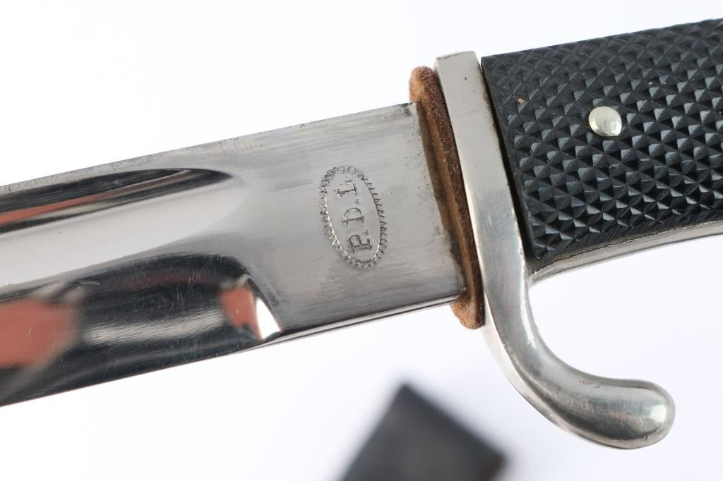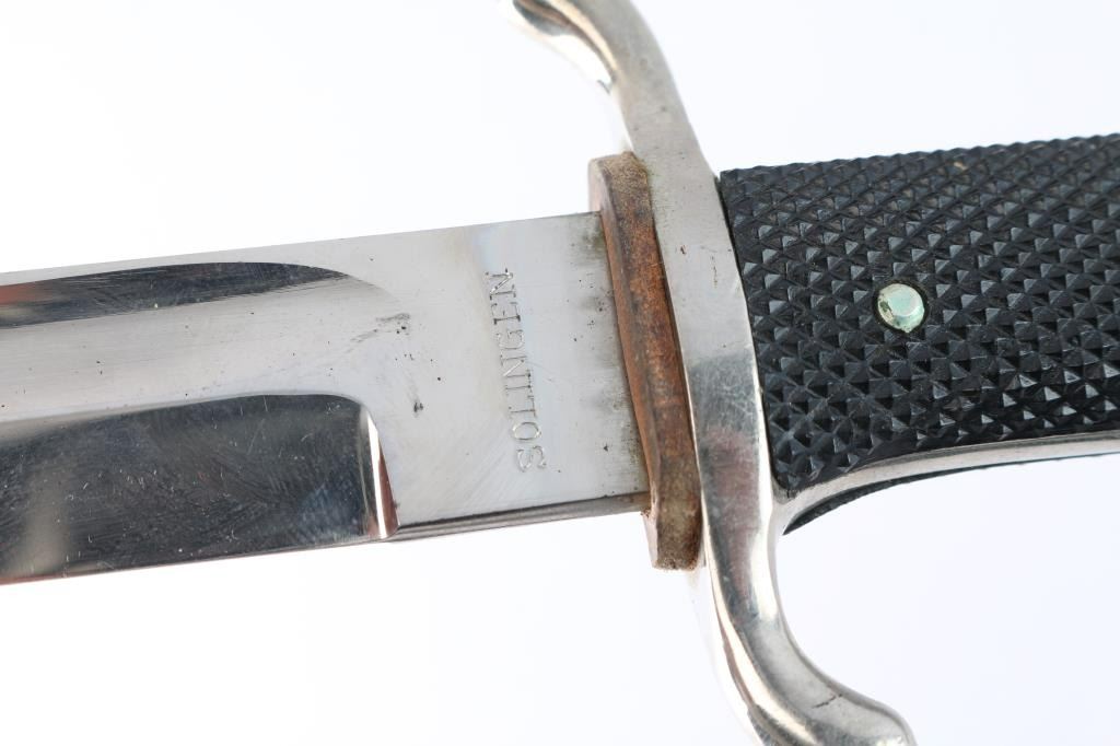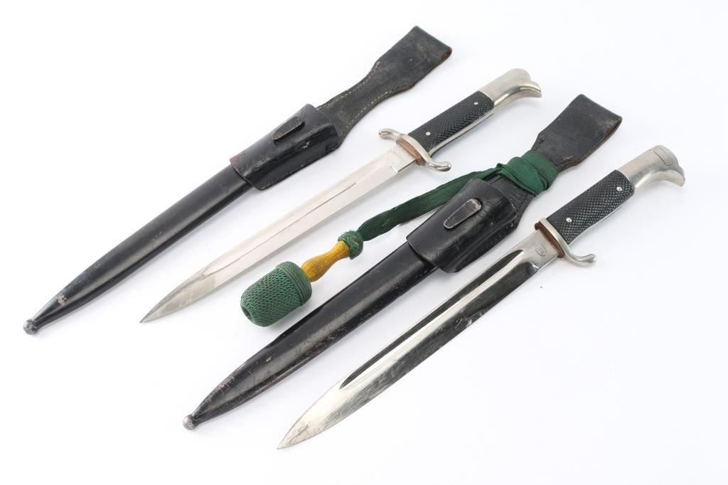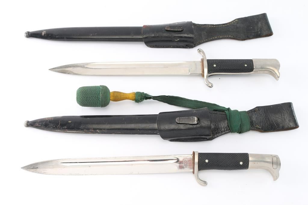 1) Third Reich era Fireman's dress Bayonet. The grip plates are the usual black checkered type, retained by steel rivets with dressed obverse heads. The scabbard is straight, with good paint marred only by some minor scuffs. Attached black leather frog which remains in very good condition. The 9 1/2' blade has good nickel plating and a wide fuller. It remains in excellent condition, marked "Solingen" on the reverse, and the original leather washer is in place. 2) Army NCO dress Bayonet. Blade is stamped P.D.L. (Paul D. Luneschloss) in engraved oval. Nickel plated "birds Head" pommel and crossguard, original red colored felt insert in the rifle slot , 9 1/2' blade, leather washer in place. Black paint on scabbard is about 805 with scuffs/wear, black leather frog is very good/intact. A green portepee with gold neck attached to frog, indicates a Jäger (light infantry) unit and the wearer's senior rank (Officer candidate or NCO). Blade is overall very good/bright with some scratches/scuffs.