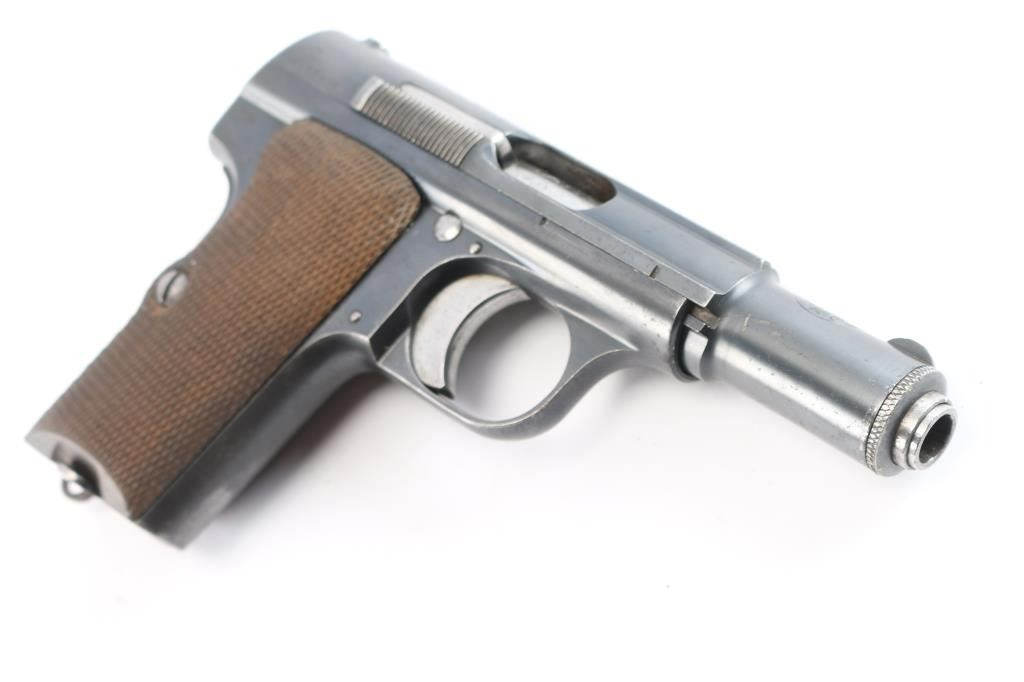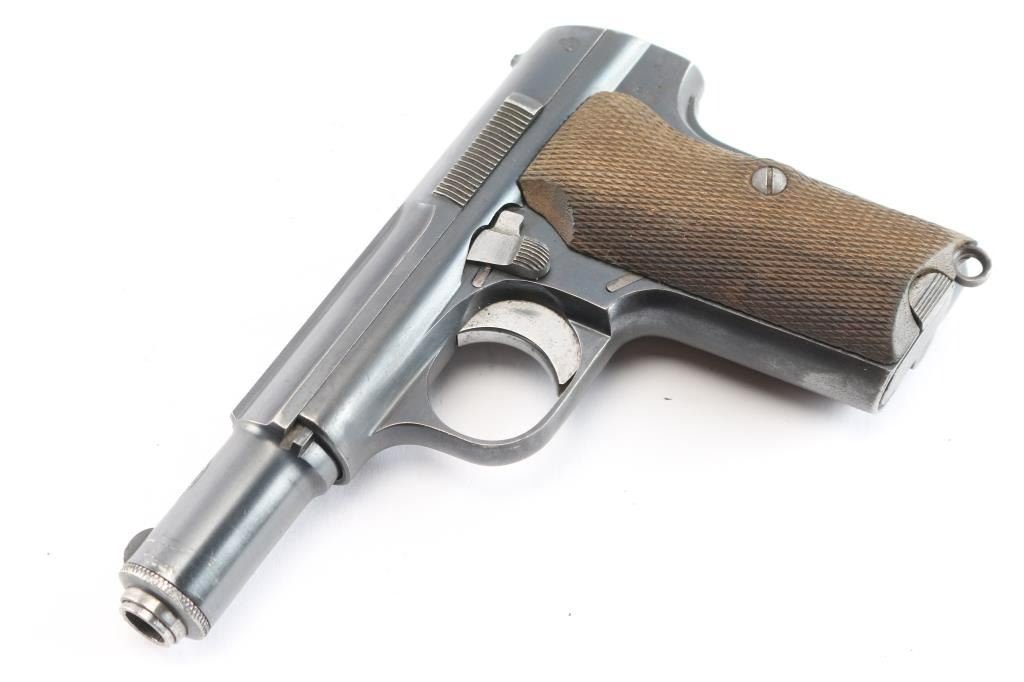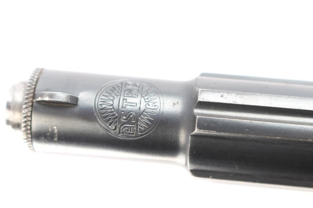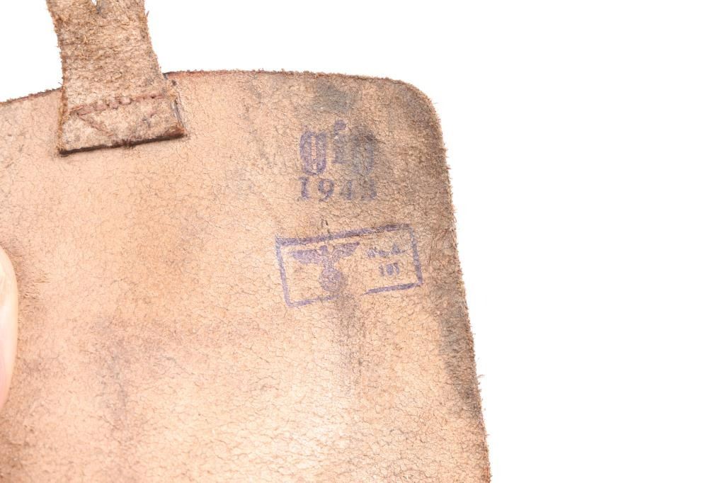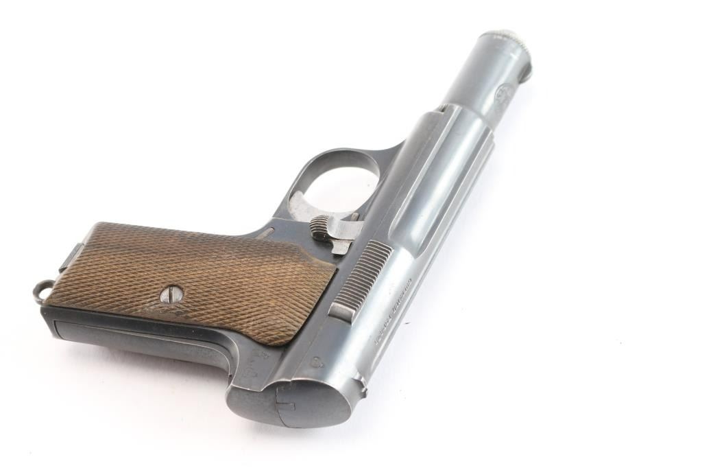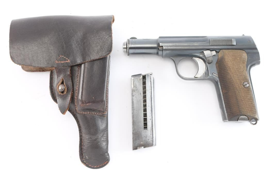 Spanish made single action, blow-back, semi- automatic pistol chambered in 9mm Kurz/.380. Very desirable early WaA251 proofed Astra 300. At SN 552149, it was one of 3,200 Astra 300s delivered to the Germans April 30, 1942. , for use by its military, mainly the Luftwaffe Produced 1942 ("N" code), Top of slide marked “UNCETA Y COMPANIA S.A. / GUERNICA ESPANA”, Spanish proofs on left rear frame. Waffenamt Eagle/WaA251 stamped on right rear receiver. 3.9" barrel with fixed blade/notch sights. manual & grip safeties, lanyard ring, matching serial numbers on slide/frame, one Astra marked 7-rd magazine. Bore is excellent/bright, checkered wood grips are very good, action is crisp/tight, Original blue finish is about 925 with edge wear, some minor scrapes near the muzzle and some handling wear on the front strap. Comes with original German WW2 chocolate brown leather flap holster with 7 rd Astra magazine, (2) total. The inside flap is ink stamped with maker "gfg" 1943 (Carl Hepting & Co.) and Eagle/Swastika "WaW 101". Holster is excellent with all stitching intact. No import marks, vet bring back. A rare set.
