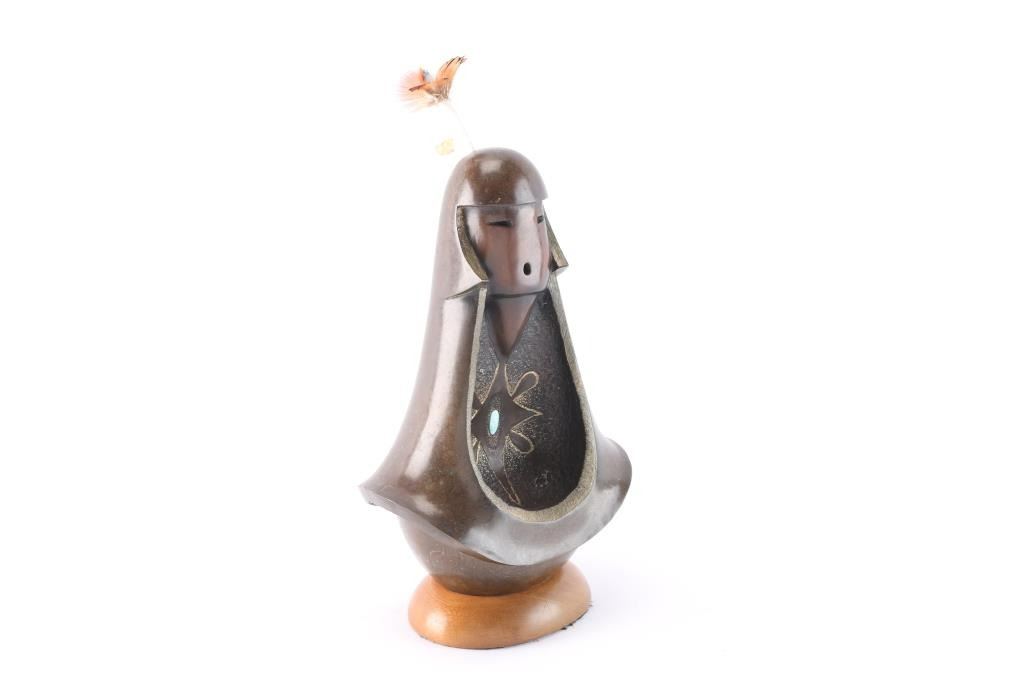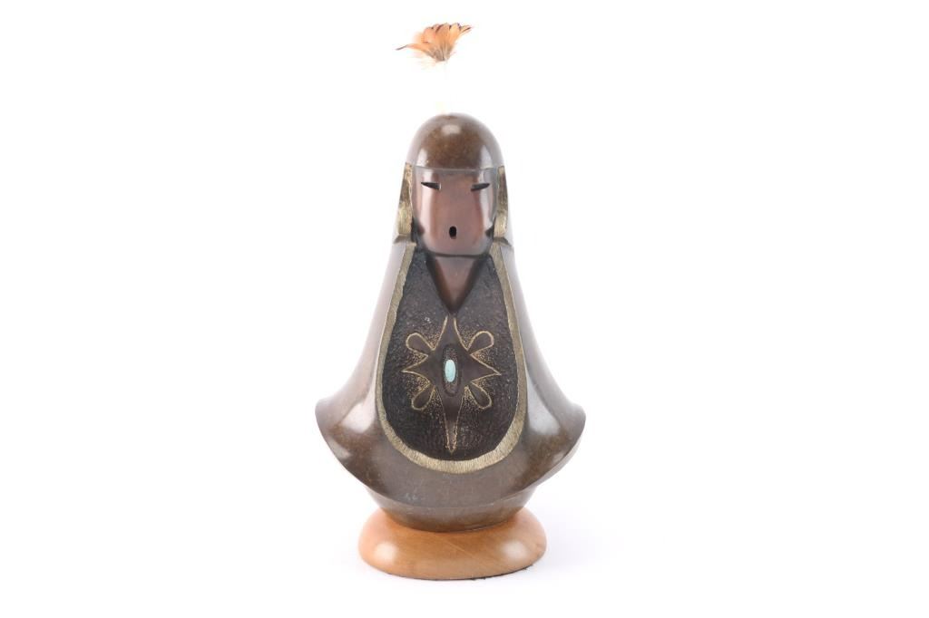Titled "Flower Blossom". Imprint signed and numbered 6/30 on lower back. Mounted on smooth oval wood base. Measures 12 1/2" by 6 1/2" by 4". Hollowed center has pale blue stone, head adorned with small leather wrapped feathers. Ernest Eugene "Bo" Mirabal, known professionally and tribally as “Cloud Eagle”, was a full-blooded Tewa Indian from Nambe Pueblo, New Mexico who created Pueblo art of outstanding quality and educated the American public as to its cultural significance (b. 1961 – d. 2011). Much of Cloud Eagle’s work involved the idea of the circle, things repeating and returning, the oneness of nature. He won numerous awards including "Best of Show" at Eight Northern Pueblos Show and many first place awards at the SWIA Indian Market in Santa Fe, New Mexico.