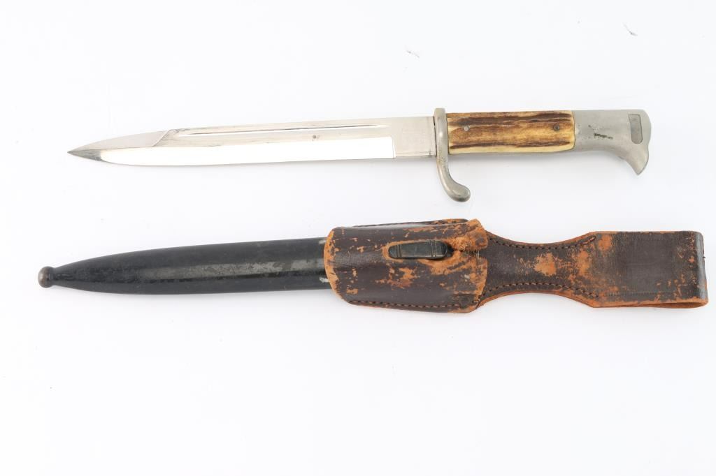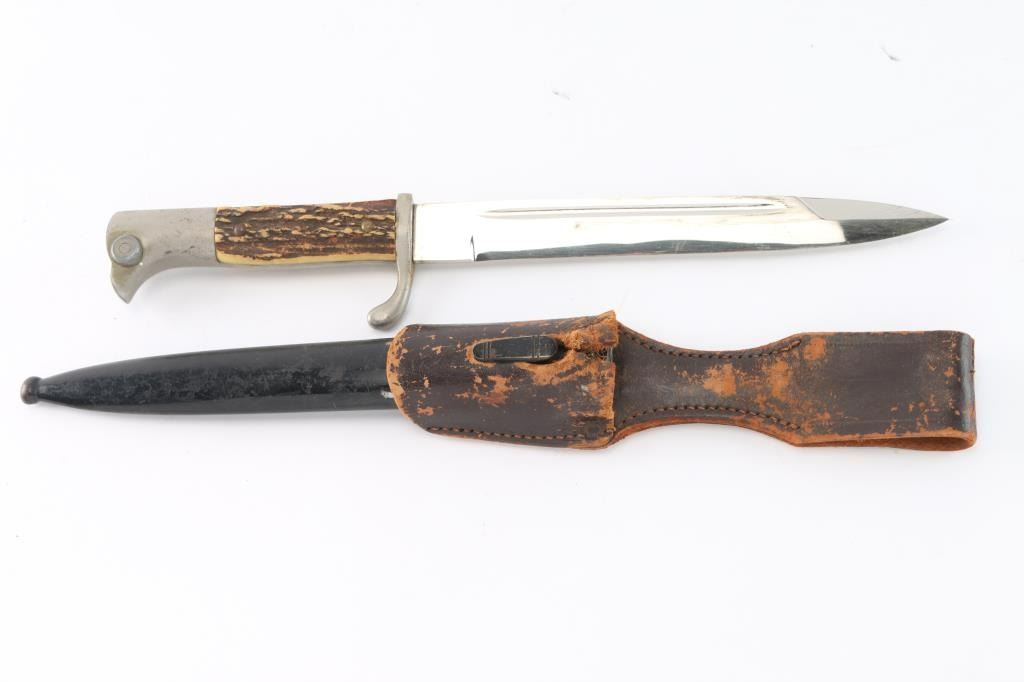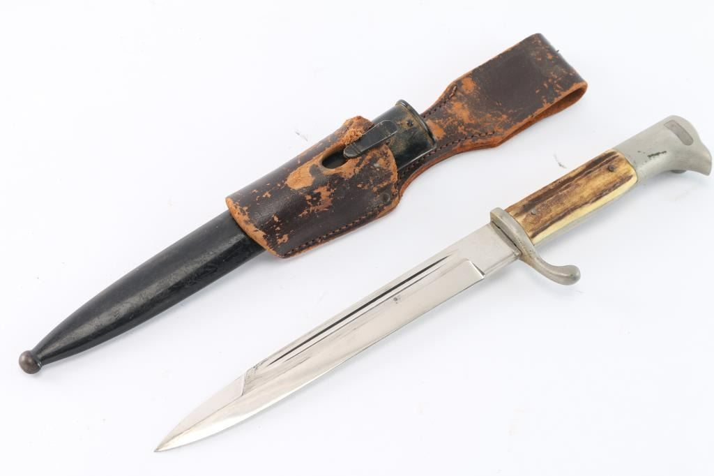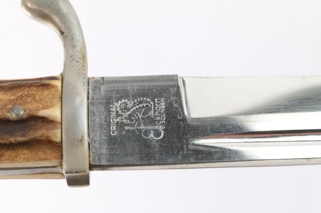 Desirable maker Eickhorn. 7 7/8" shorter blade for NCO's and Officers, stepped end variety. Nickel alloy 'Birds head pommel and upswept hand guard. Stamped on the ricasso with the 1942 style Carl Eickhorn squirrel makers mark. The leather blade buffer pad is missing. Blade is very good/bright with some minor scratches, black paint on scabbard is about 80% with scuffs, the brown leather frig is scuffed with a tear on the hole for the scabbard stud. the fitting have a aged patina for storage. Stag grips are excellent.
