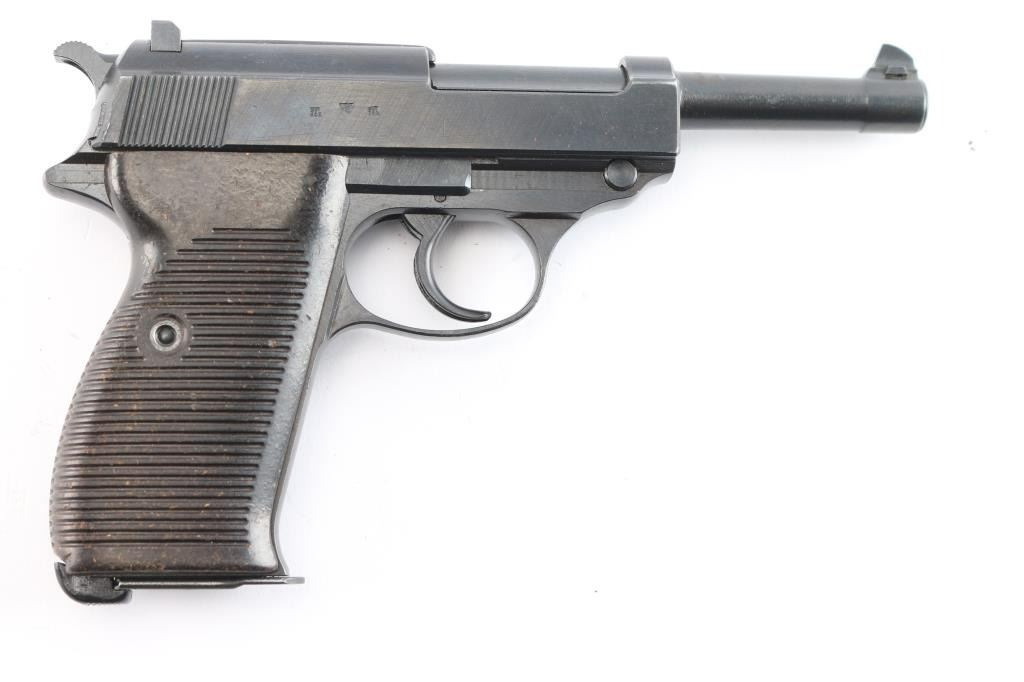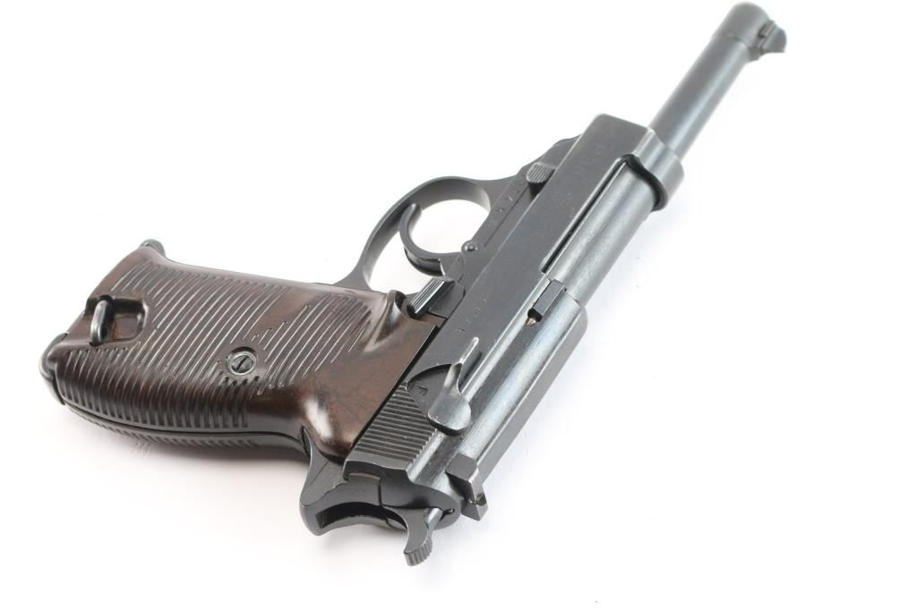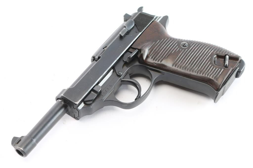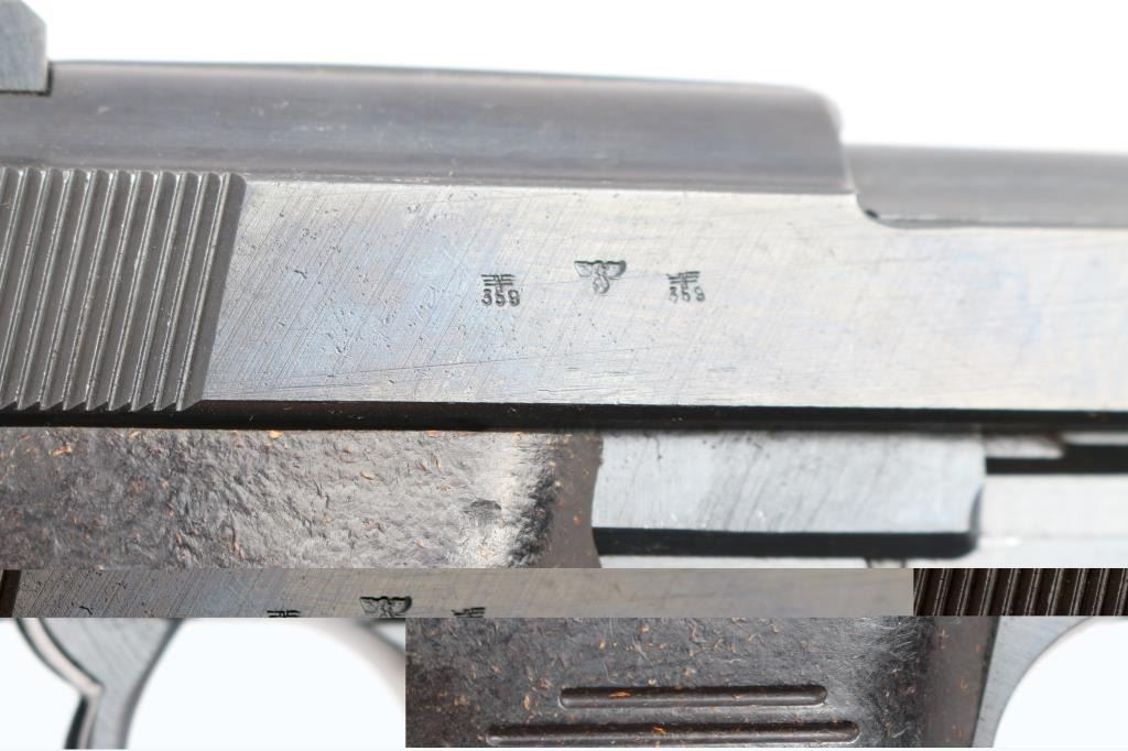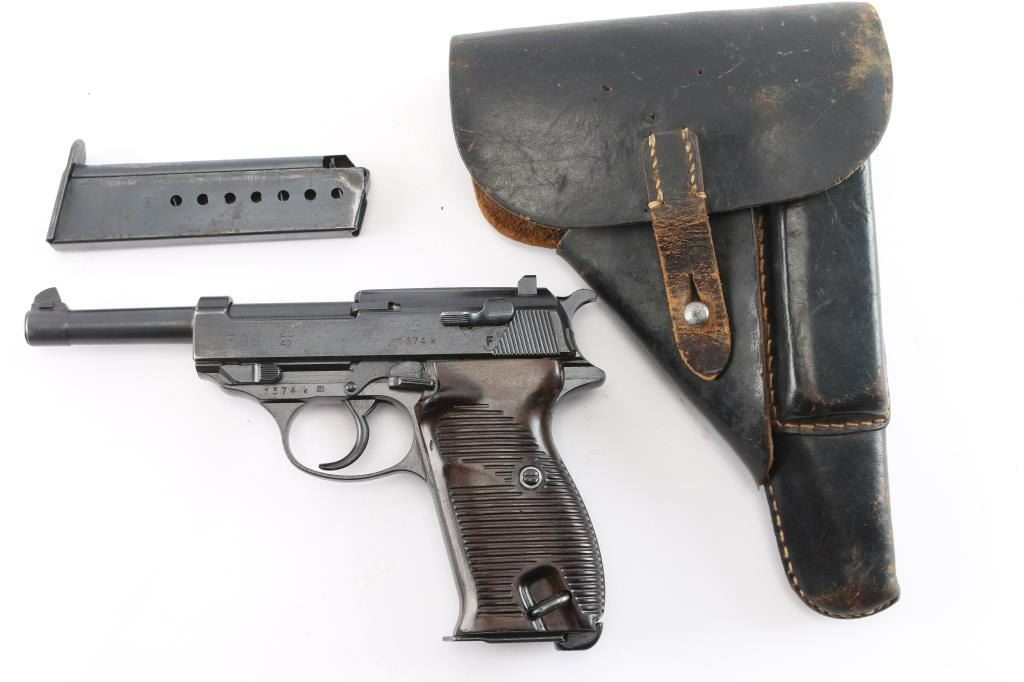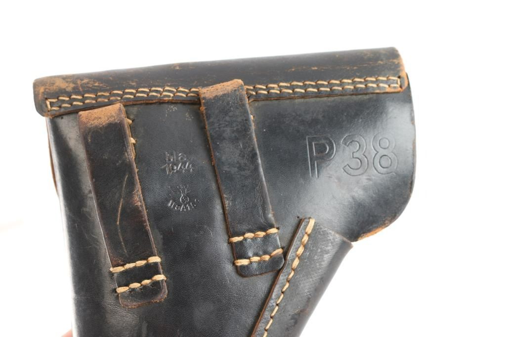 German semi-automatic pistol. 8 rd Magazine. Third Reich era military issued sidearm. 4.9" barrel. Short recoil, hinged locking piece assisted breechblock. "ac 42" marked on slide. All matching serial numbers including the locking block. Waffenamts Eagle/359. All stampings are crisp/clear. Imported by "TG Knox. TN 9mm Germany" marked on the underside of the slide. (Slide has to be removed to see it). Bore is overall good/bright, strong rifling, light frosting in the grooves. Bakelite grips are very good. Original blued finish is about 98% with some very minor scratches, edge wear. Original magazine with Walther banner. Comes in original soft shell black leather holster marked "bla" 1944 ( EG Leuner, Bautzen) waffenamt eagle/WaW159 and large "P-38", with spare magazine marked "jvd" ( Erste Nordbohmische MetallFabrik ). A very nice set.