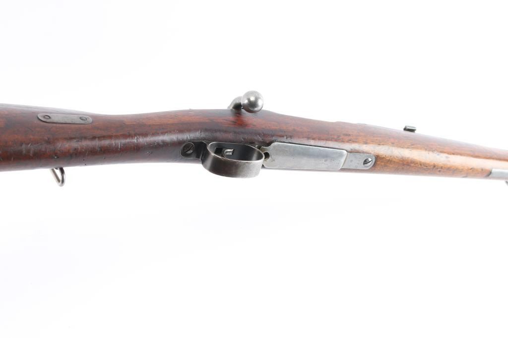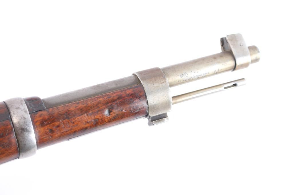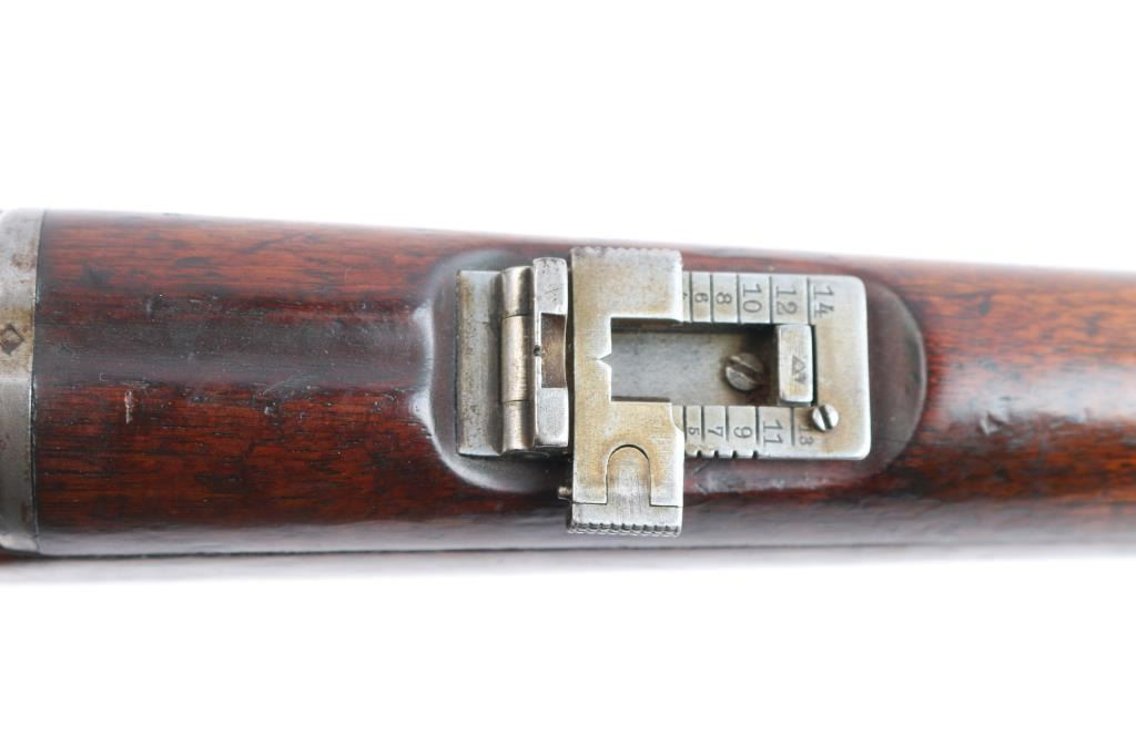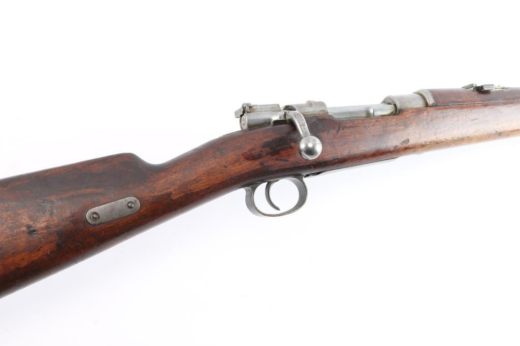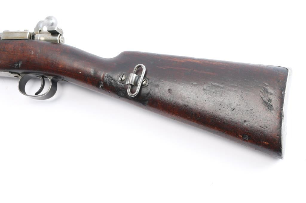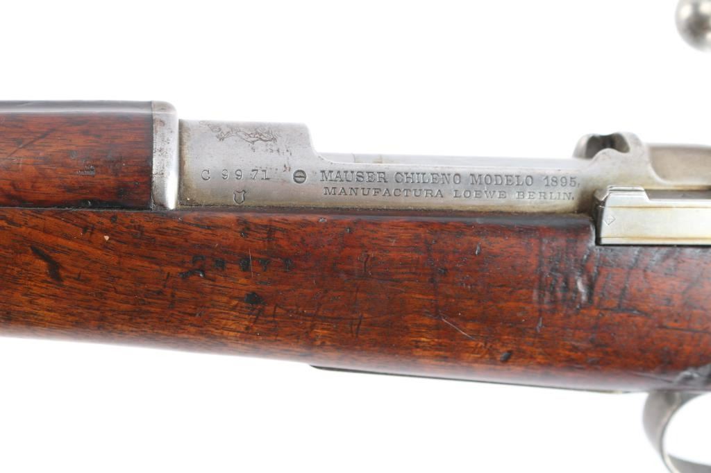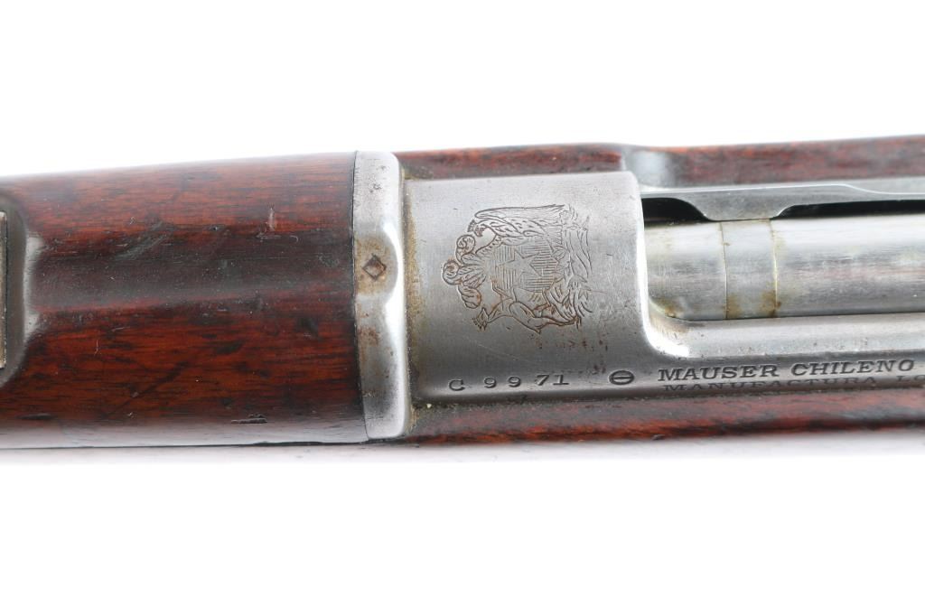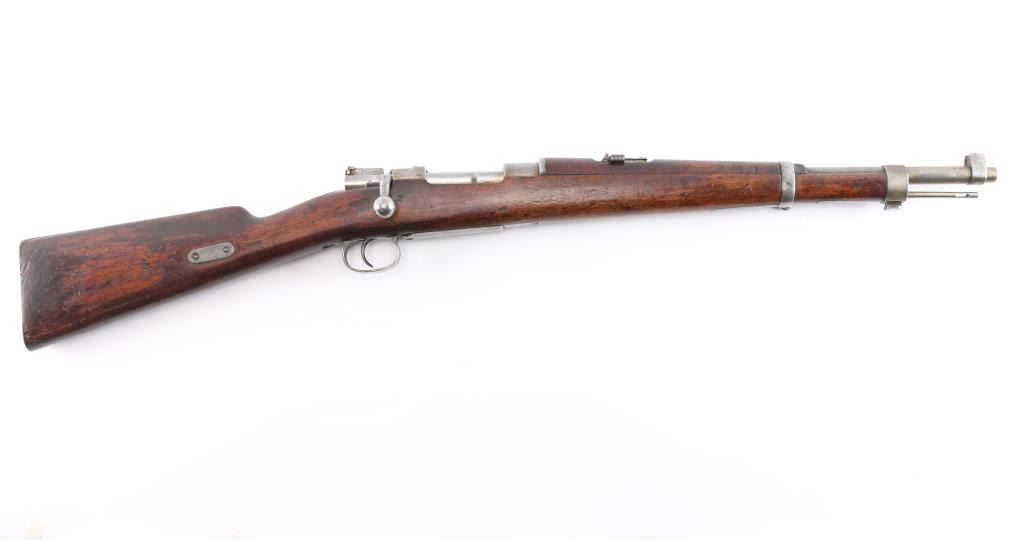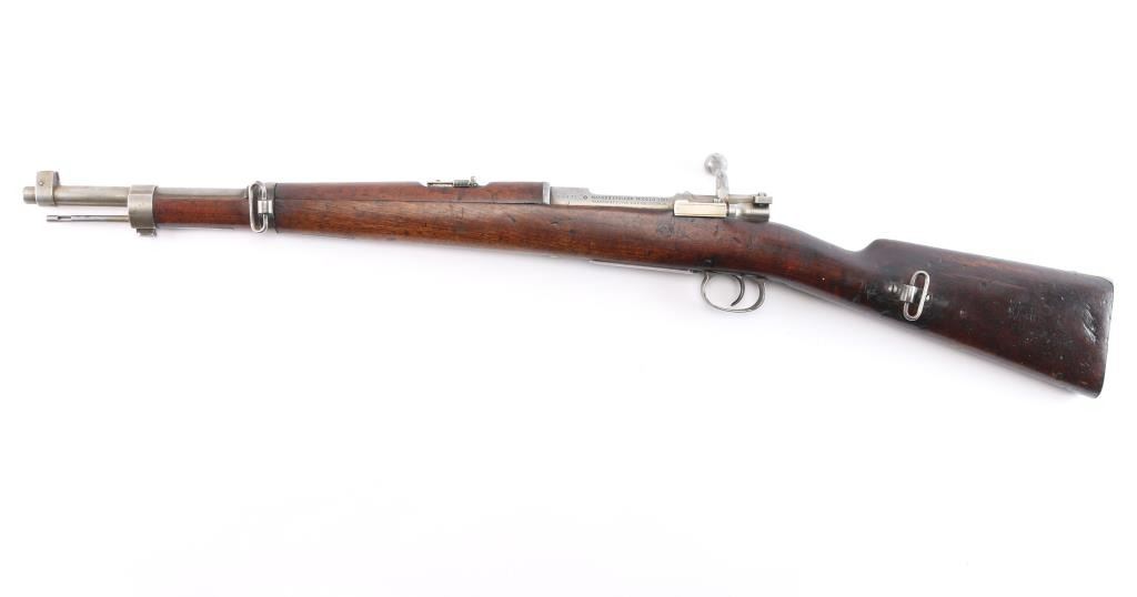 German contract Chilean military carbine manufactured by Loewe in Berlin Germany. chambered in the original 7x57mm caliber. Primarily designed for cavalry and artillery. There is no visible import mark. The top of the receiver is marked with the Chilean Crest. The left side of the receiver is marked with the serial number, two proofs, and “MAUSER CHILENO MODELO 1895 / MANUFACTURA LOEWE BERLIN”. Most of the metal parts are marked with or small Chilean proofs & stampings. The receiver, the bolt handle, the bottom metal are all marked with the serial number. The bolt assembly and the floor plate are each marked with the last 2 digits of the serial number. The left side of the stock is marked with a faded Chilean crest. 18.3" barrel with military sights graduated to 1400 meters, Mauser style action with flag safety, hinged floor plate, left side mounted sling swivels, wood stock & hand guard with smooth steel buttplate. 37 1/2" overall. Bore is very good/bright, strong rifling, action is strong, finish is in the white and the wood is overall very good/sound with minor dings/dents. "C" serial number prefix with turned down bolt handles, indicates it was part of a batch of rifles originally ordered by the Boer forces but was intercepted by the British blockade and then sold to Chile by Germany. Manufactured circa 1896.