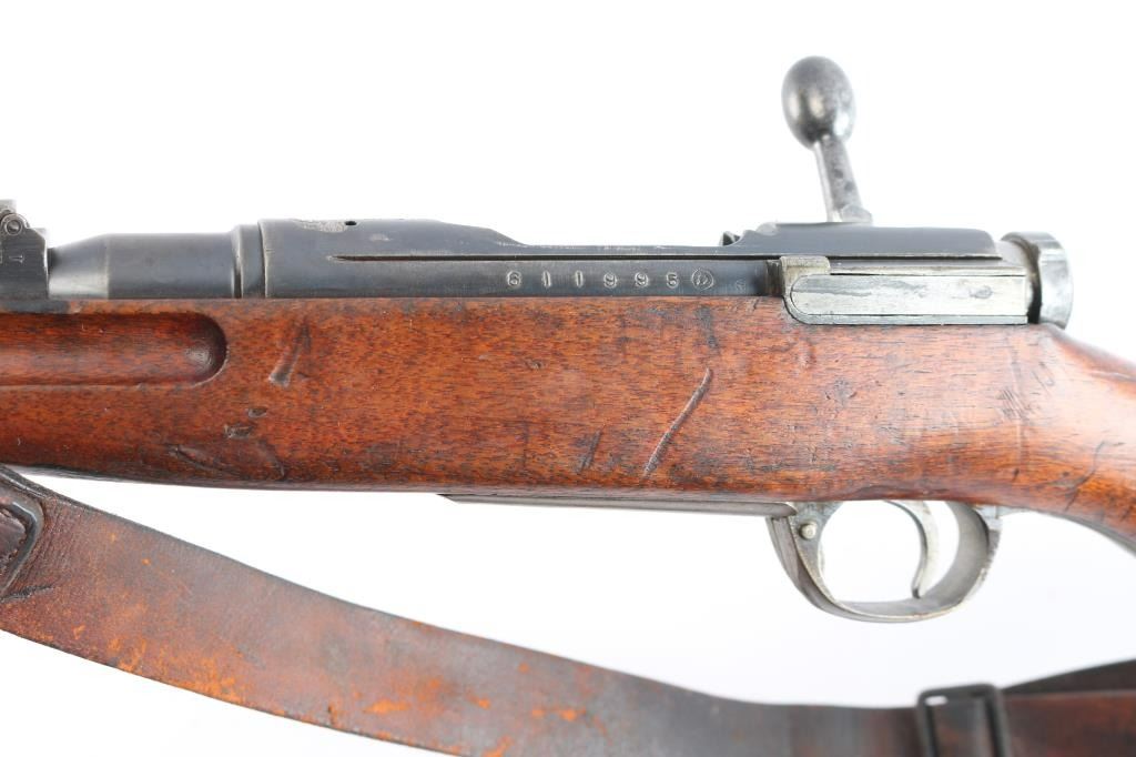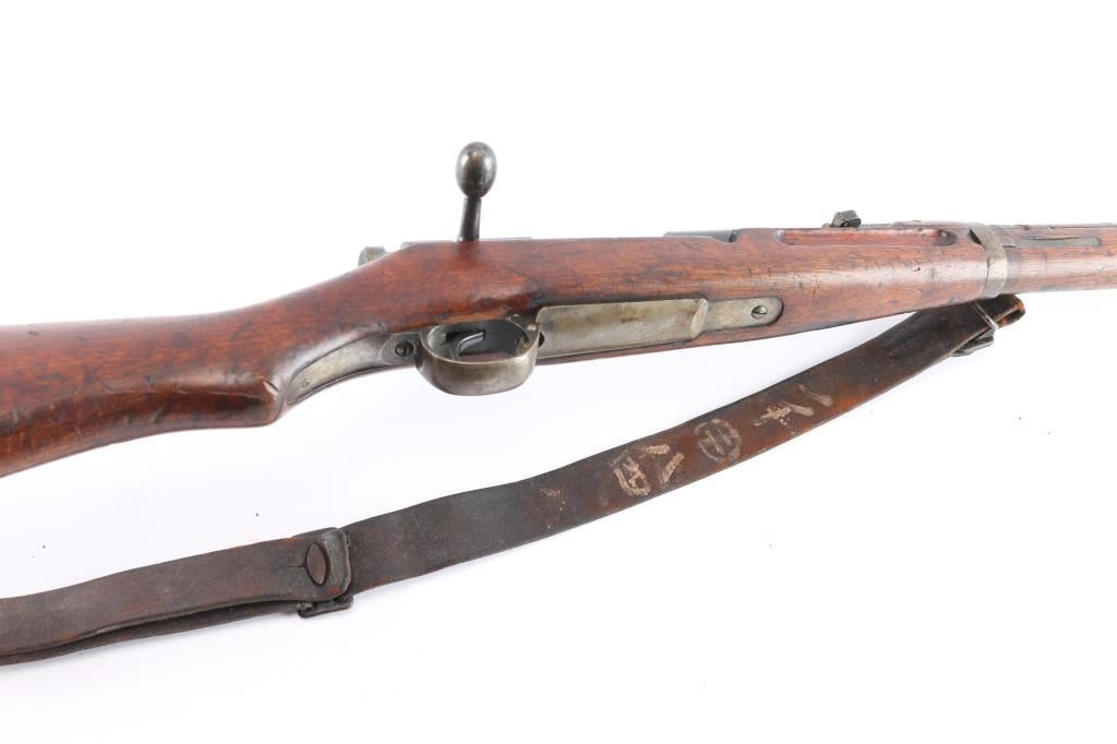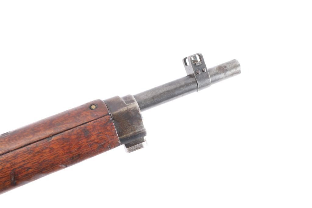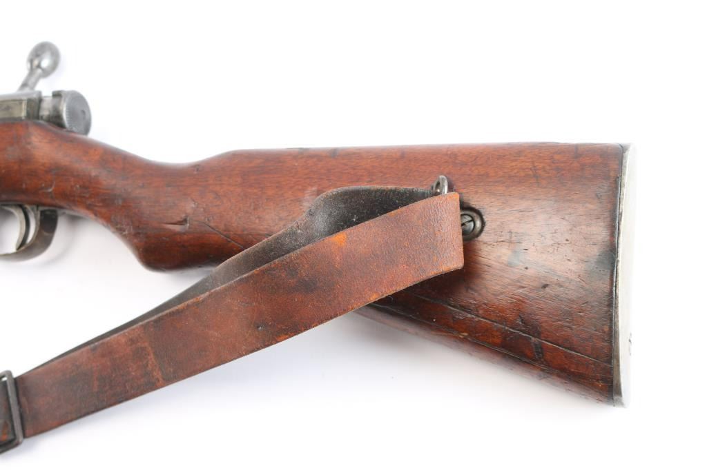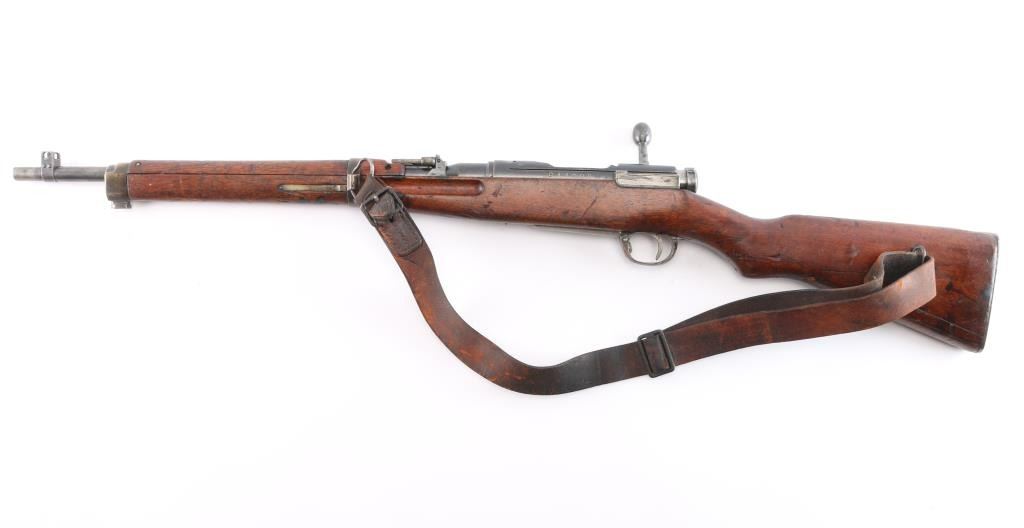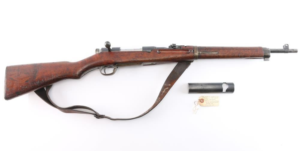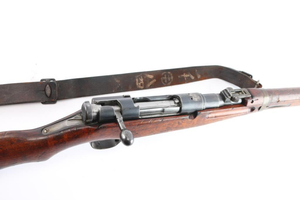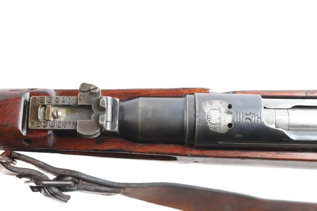 Rarely seen Japanese Arisaka Type 38 Carbine in 6.5mm that was manufactured in Manchuria at the Mukden Arsenal. This is matching by serial number on receiver and bayonet lug, (Mukden did not have the SN on bolt), assembly number "1251" matched on bolt handle and extractor. These carbines are quite scarce and were made for the Japanese Kwantung Army in China. Mukden made rifles are extremely scarce and rarely seen. They are extremely well made and identical to the quality of the Japanese made rifles. 19.2" barrel, protected inverted V front sight, correct rear carbine sight, receiver marked "Type 38" with partially ground mum with most of outline remaining, no cleaning rod, left side mounted sling swivels, "egg" bolt knob,dust cover stamped "775", small inspectors stamps on small parts. rare correct issued leather sling attached with Japanese writing on the inside. Nitre blue finish still present on the magazine follower, hinged floorplate. Bore is very good/bright, strong rifling. marking are clear, original finish is about 605 with handling wear and the wood is overall good/sound with many dents/dings. No import marks. This carbine was brought back by Joseph Gaetano of the Bronx, NY who was in the heavy Weapons Plt. of the 169th Infantry Reg.