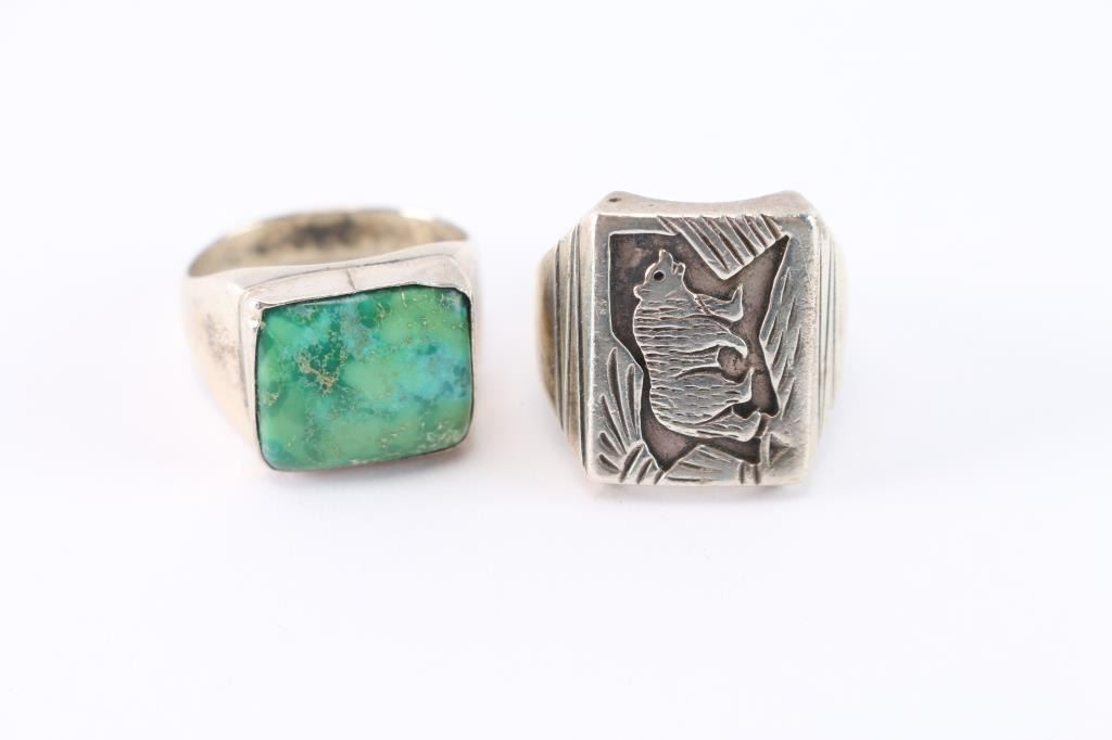 One has rectangle green turquoise stone, maker marked, size 10 1/2. The other has an etched bear design, size 9 3/4.