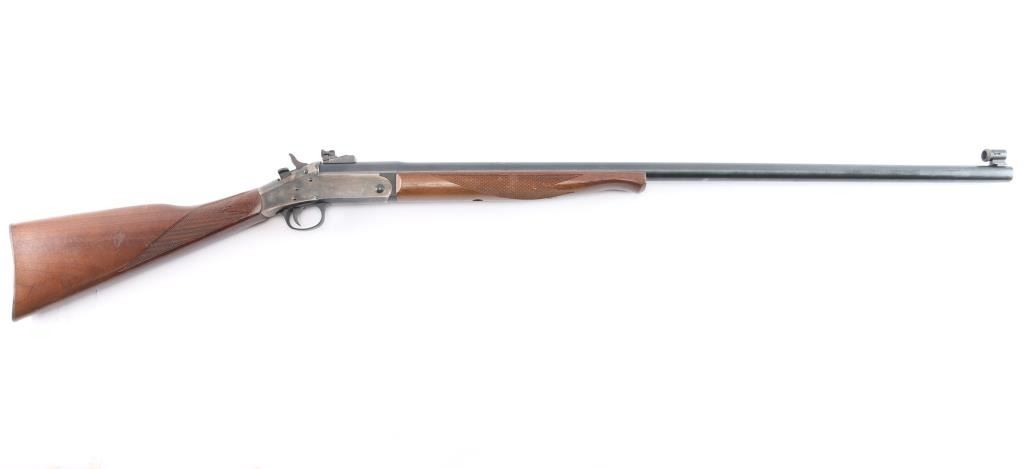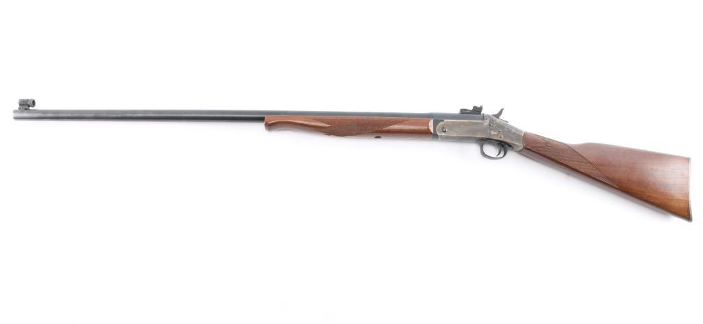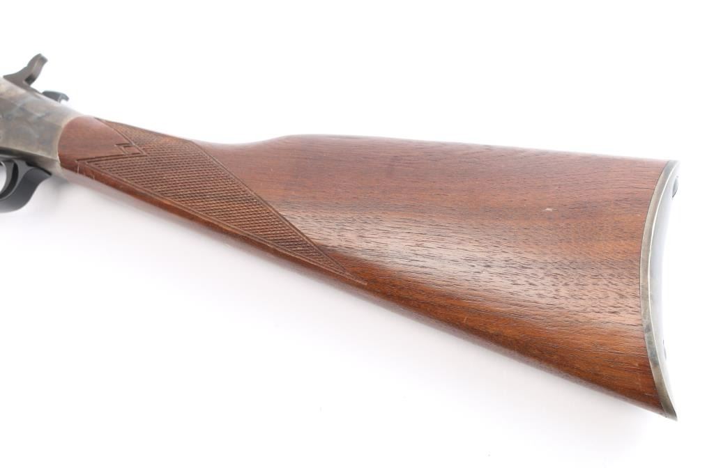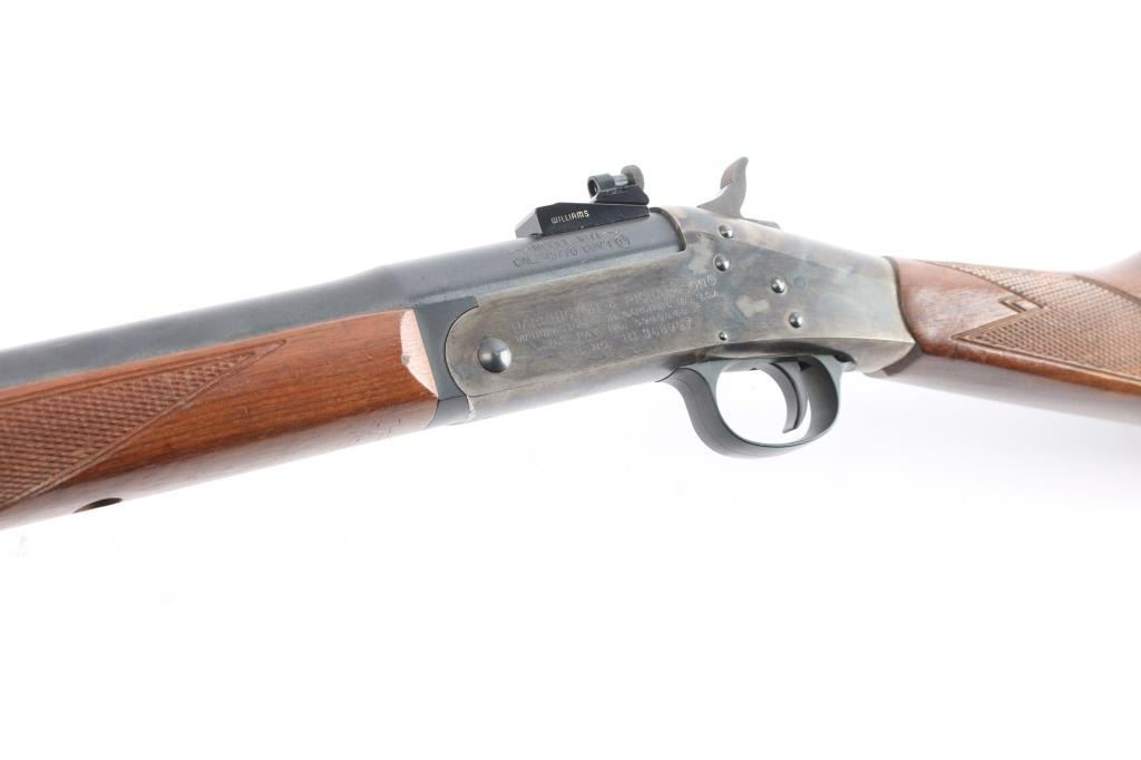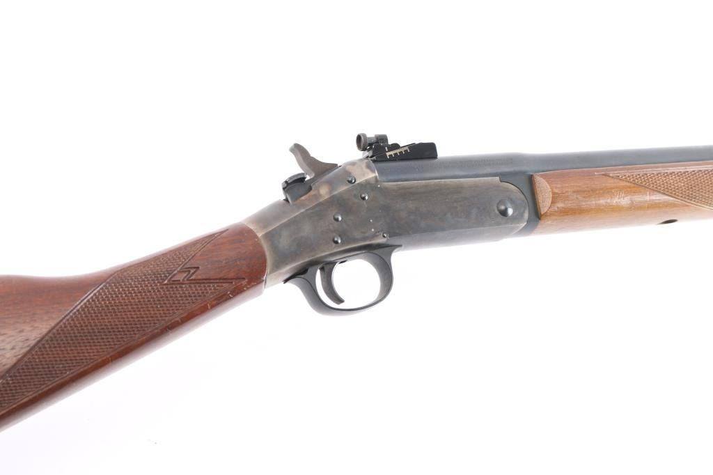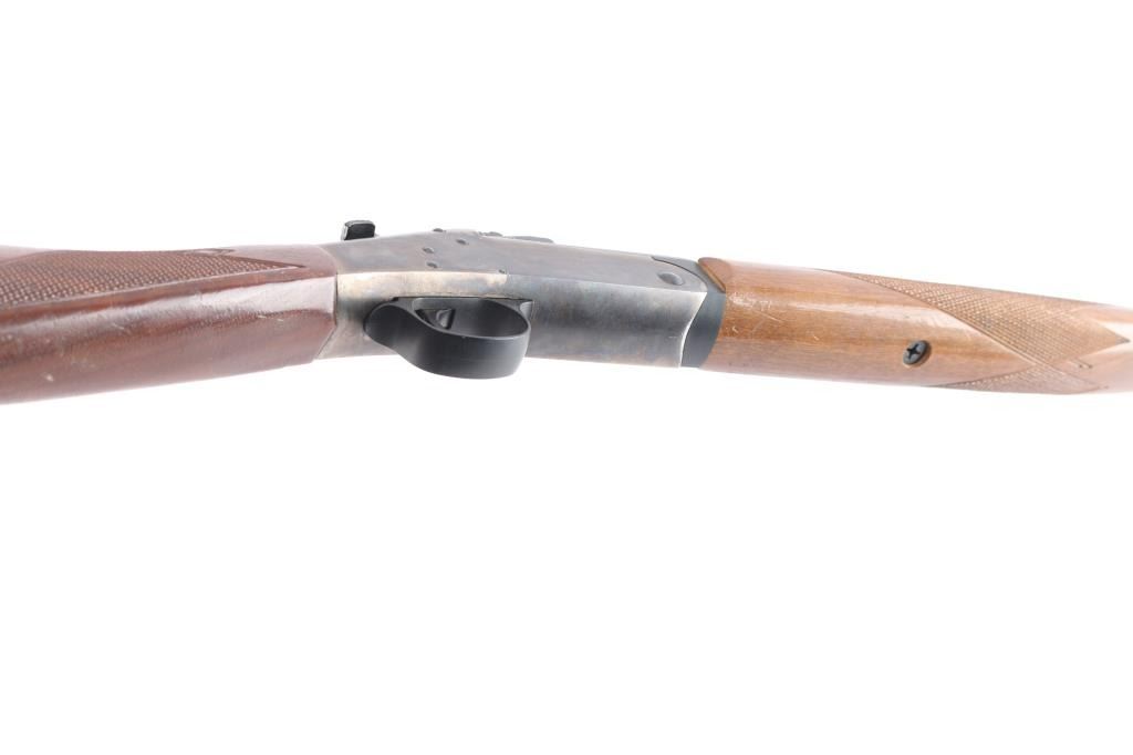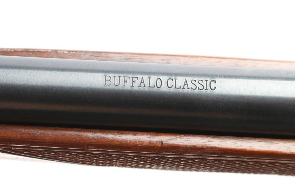 Harrington & Richardson 'Buffalo Classic" chambered in 45-70 caliber. Single-shot break-top rifle. and a 32" round barrel with Williams fully adjustable aperture rear sight and globe post/bead front sight. Checkered wood stock and Schnabel style front foregrip curved steel buttplate. Black composite trigger guard. Blued serrated hammer and barrel. Case colored receiver. Rear right receiver has barrel tip up lever. Bore is excellent/bright, barrel locks-up tight, wood is near excellent with a few minor scratches and the case color is mostly there with minor handling wear. Manufactured 1995/96.