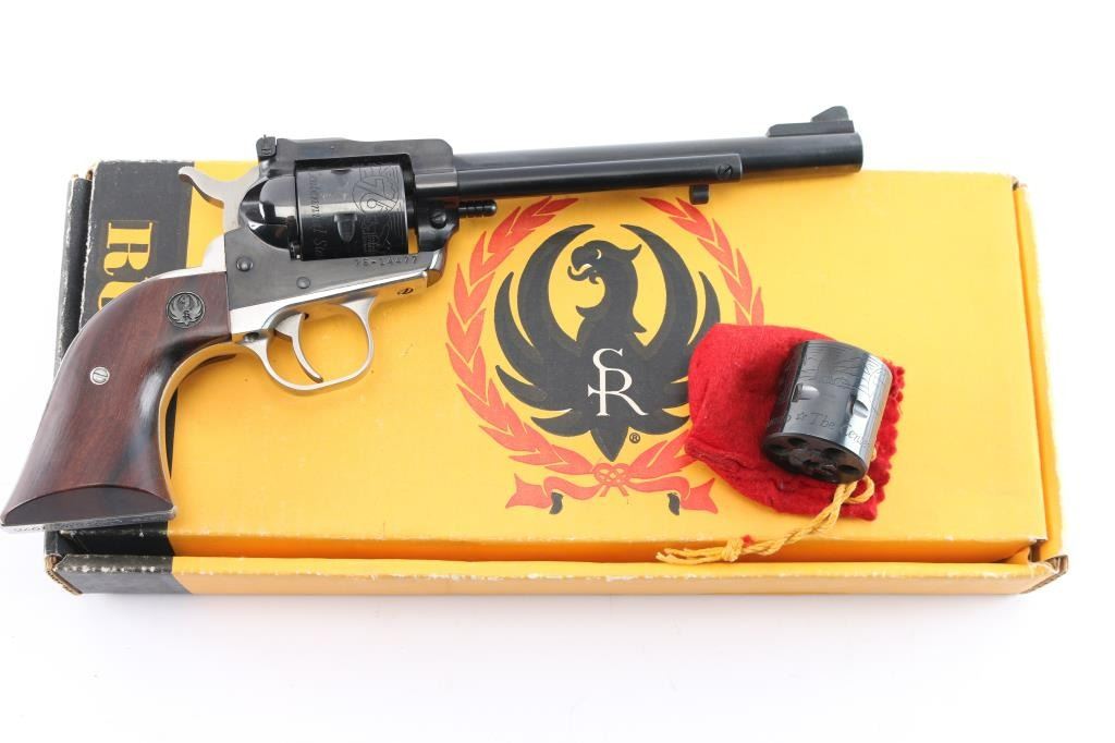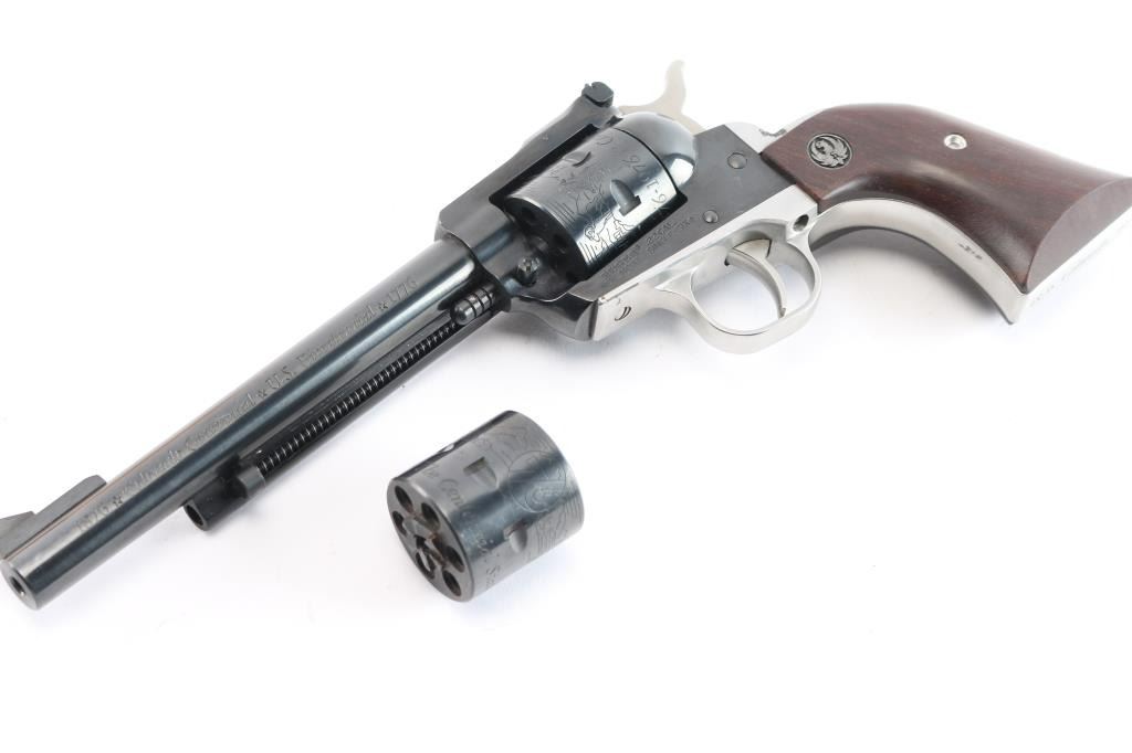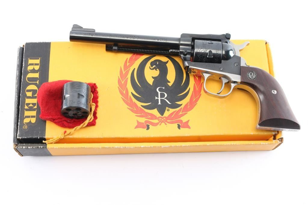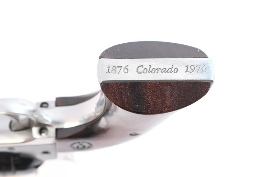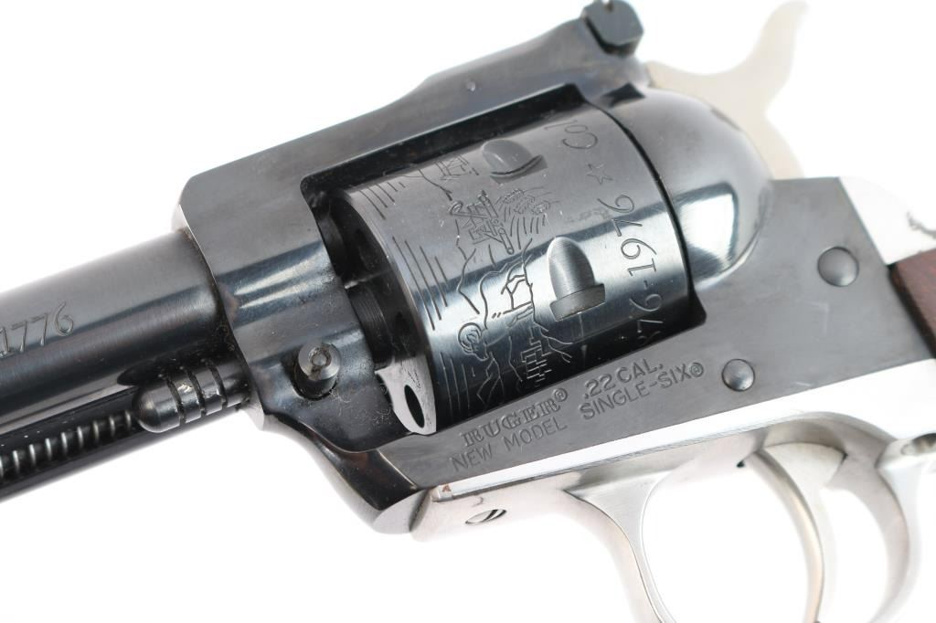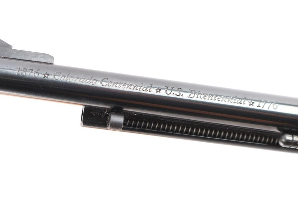 'New Model' Colorado Centennial edition. 15,000 of these Ruger Single Six Revolvers were manufactured to commemorate the 100th Anniversary of Colorado statehood in 1976. The guns were fitted with a 6 1/2" barrel, two-piece rosewood grips with Ruger medallions, non-fluted and unique roll engraved .22 LR cylinder with scenes from early Colorado featuring miners, bighorn sheep, Colorado capitol building, etc., stainless steel grip frame with "1876 Colorado 1976" roll stamped on the bottom of the butt, blue finished, stainless polished hammer, triggerguard and backstrap and "1876 * Colorado Centennial *,U.S. Bicentennial * 1779" rolled stamped on the left side of the barrel. The gun appears to be unfired, bore is excellent/bright. Very light tracking on the cylinder. Action is smooth with tight lock-up. Comes with original factory box with the .22 LR cylinder.